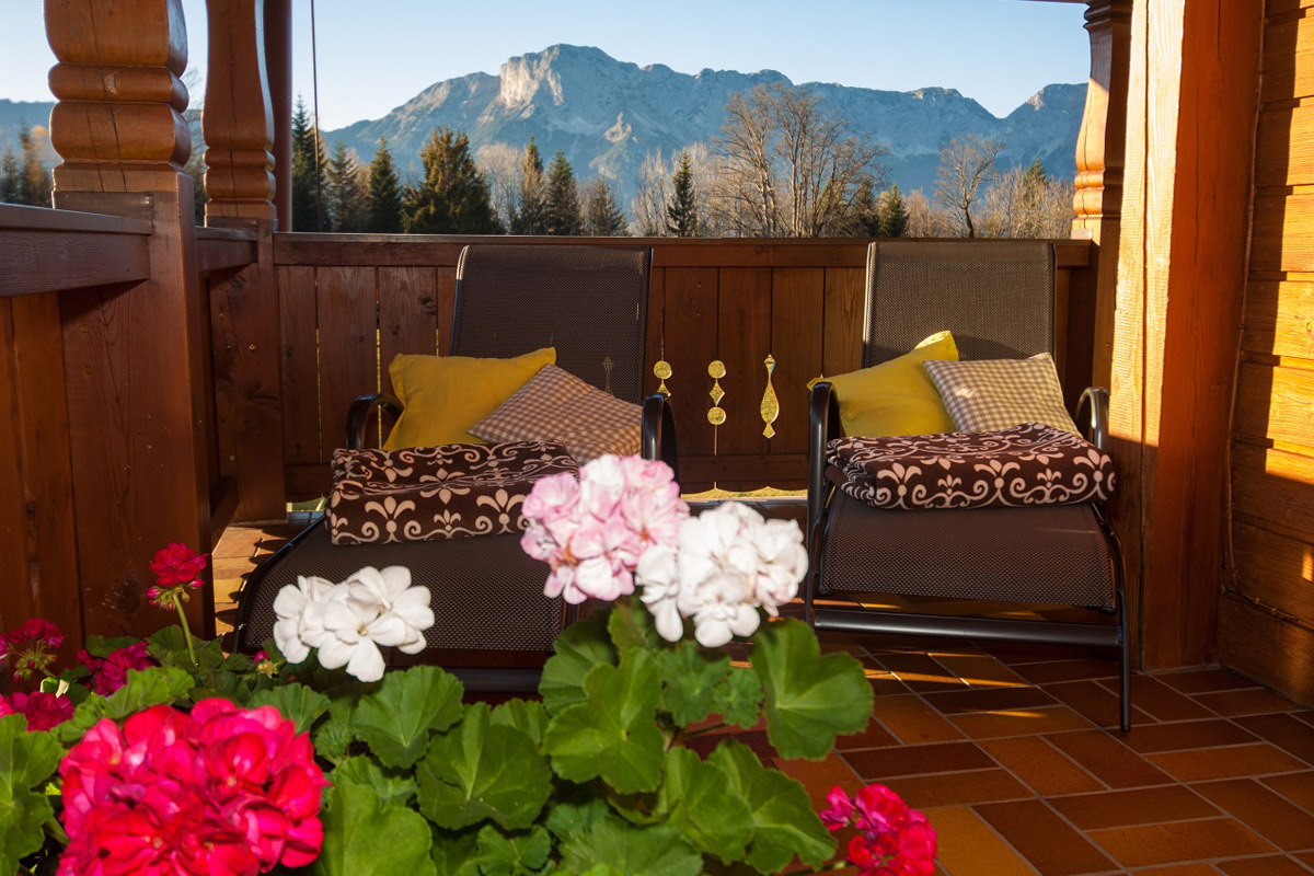 Ferienwohnung Bergfeuer – Traumlage und Traumbergpanorama. Diese wunderschöne Ferienwohnung im Alpen-Chalet-Stil befindet sich im 1. Stock. Sie ist ideal für den gemeinsamen Urlaub von 2 Paaren oder einer größeren Familie für bis zu 5 Personen, da 2 getrennte Schlafzimmer mit Doppelbetten und bei Bedarf einem Zustellbett mit jeweils eigenem Badezimmer zur Ausstattung gehören. Die Wohnung besitzt einen unglaublich großen Süd-Balkon mit Ess-/Sitzgruppe, Liegestühlen und einem traumhaften Blick auf die Berchtesgadener Alpen.