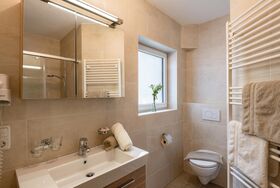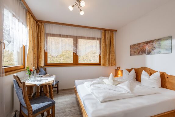 Doppelzimmer mit Doppelbett und Doppelschlafcouch, mit Ausblick in die Natur und auf die Berge. Ausgestattet mit Dusche/WC, Fön, Sitzecke, Kabel-TV, Zimmersafe, Minibar und Balkon.