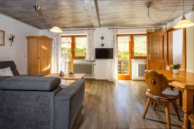 Unserer geräumige Ferienwohnung ist 95 qm groß, liegt im ersten Stock des Hauses und beherbergt mit zwei separaten Schlafzimmern bis zu fünf Personen. Die Schlafzimmer sind jeweils mit einem Doppelbett, eines zusätzlich mit einem Einzelbett ausgestattet. In der Wohnung gibt es zwei Bäder, eines davon mit einer Dusche, eines mit einer Badewanne inkl. Duschvorrichtung. In der großen Wohnküche finden Sie im gemütlichen Essbereich genügend Platz für Ihre Familienmahlzeiten. Die Küche ist voll ausgestattet (bspw. Mikrowelle, Toaster, Wasserkocher und Spülmaschine). In der Wohnküche steht ebenfalls eine Couchgarnitur, auf der Sie Ruhe finden können. Es gibt Satellitenfernsehen. Der Balkon besticht durch seinen herrlichen Ausblick auf die Berchtesgadener Berge. Auf Anfrage stellen wir Ihnen gerne ein Kinderbett und einen Kinderhochstuhl zur Verfügung.