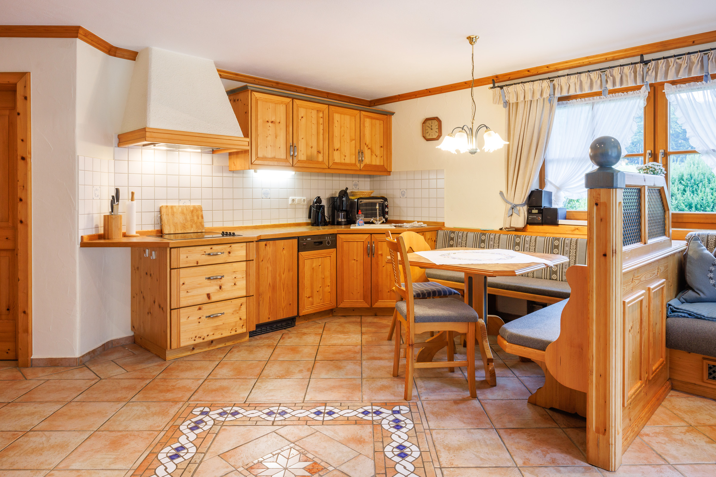 Unsere Ferienwohnung Vroni ist die ideale Urlaubsunterkunft für 2-4 Personen. Auf insgesamt 65 m² bietet die Ferienwohnung 2 getrennte Schlafzimmer und einen Wohn-Essraum mit Kachelofen. Im Wohnbereich finden Sie eine Essecke und eine gemütliche, große Sitzecke mit Fernseher. Vom Wohn-Essbereich aus gelangen Sie auch auf die eigene Terrasse mit Sitzgelegenheit und Sonnenschirm. Die komplett ausgestattete Küche macht Lust auf kulinarische Kreationen. Die Ferienwohnung verfügt über ein Badezimmer mit Dusche und WC.