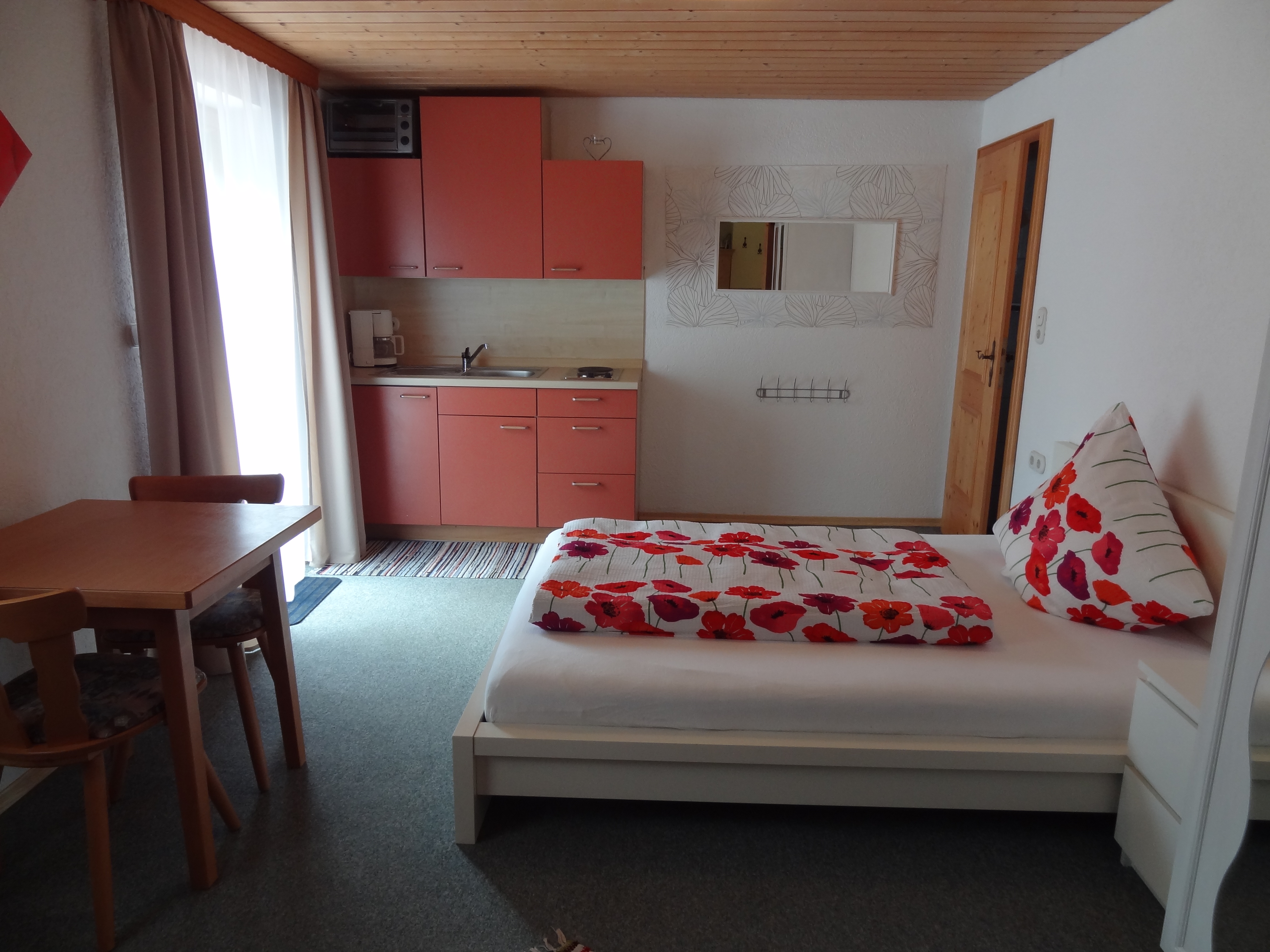 Das Nichtraucher-Einzelzimmer ist mit einer Küchenzeile, 2 Herdplatten, Kühlschrank Kaffeemaschine, und kleiner Sitzgruppe (keine Schlafmöglichkeit),Fernsehgerät, einem Tisch mit zwei Stühlen sowie einem Bad mit Dusche/WC ausgestattet. Auf der möblierten Terrasse genießen Sie die Aussicht auf die Bergwelt.