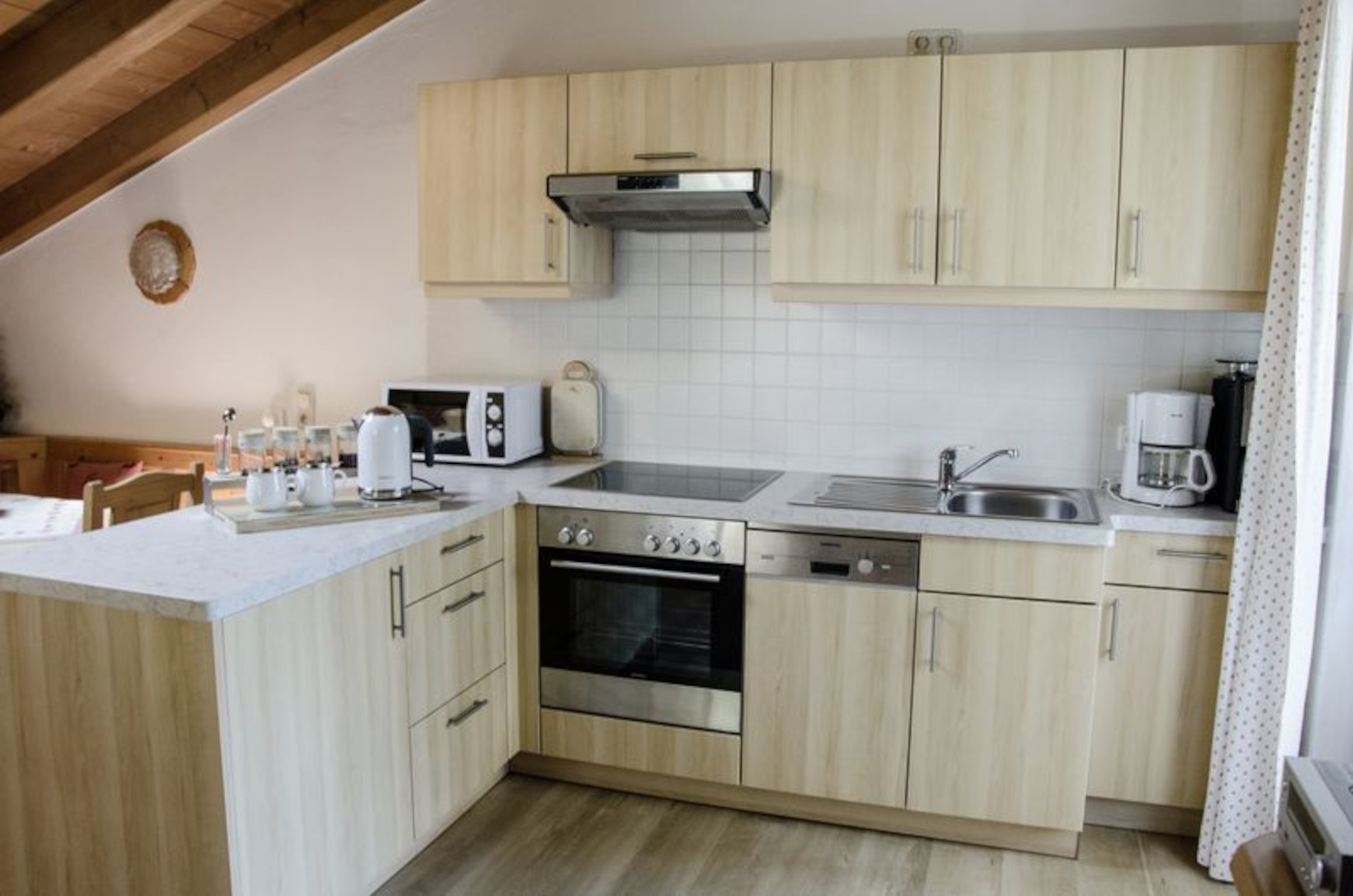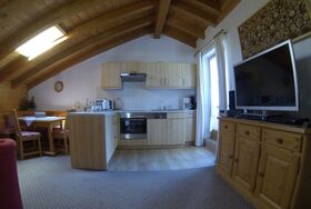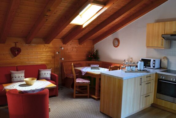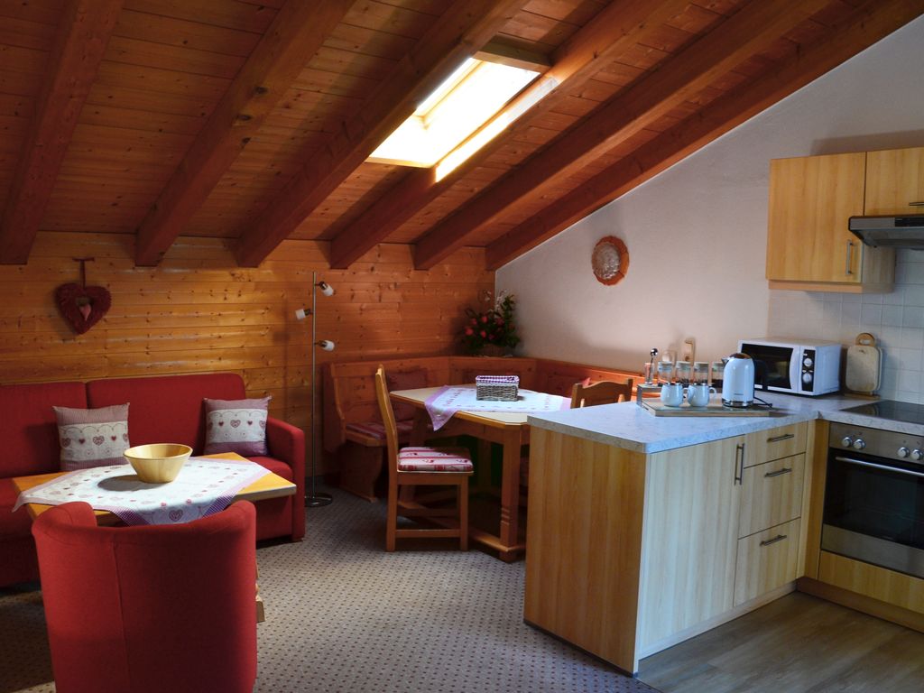 Unsere urgemütliche Ferienwohnung „Alpenrose“ hat ein großes Wohnzimmer mit Essecke und Schlafcouch und eine neue große Eck-Küchenzeile mit Geschirrspüler, 4-Platten-Ceranfeld und Backrohr, Kühlschrank mir Gefrierfach, Mikrowelle, Wasser- und Eierkocher, Toaster, Kaffeemaschine, Bio-Teestation, Flachbildschirm 107 cm, CD-Player, 1 separates Schlafzimmer mit Bandscheibenmatratzen und Bettwäsche, 1 neues Bad mit ebenerdiger Dusche und WC, Handtücher, Fön, Seifen- und Duschgelspender, Kosmetiktücher und Toilettenpapier, Flur, 2 große Balkone mit Blick auf die Berge.