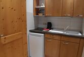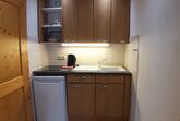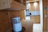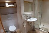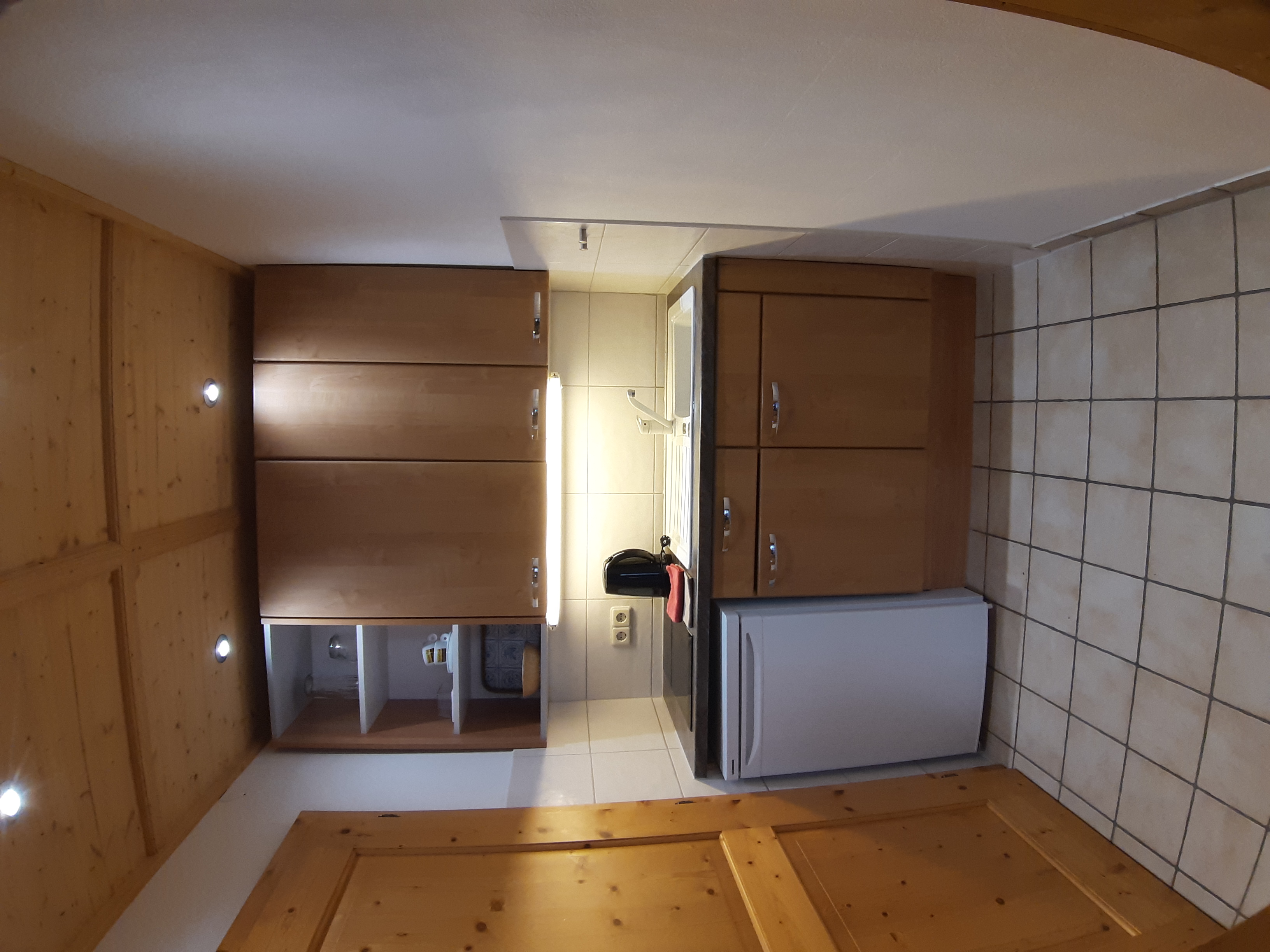 Großzügige Dusche mit WC. Gut ausgestattete Küche, die direkt an den Wohnbereich angrenzt.