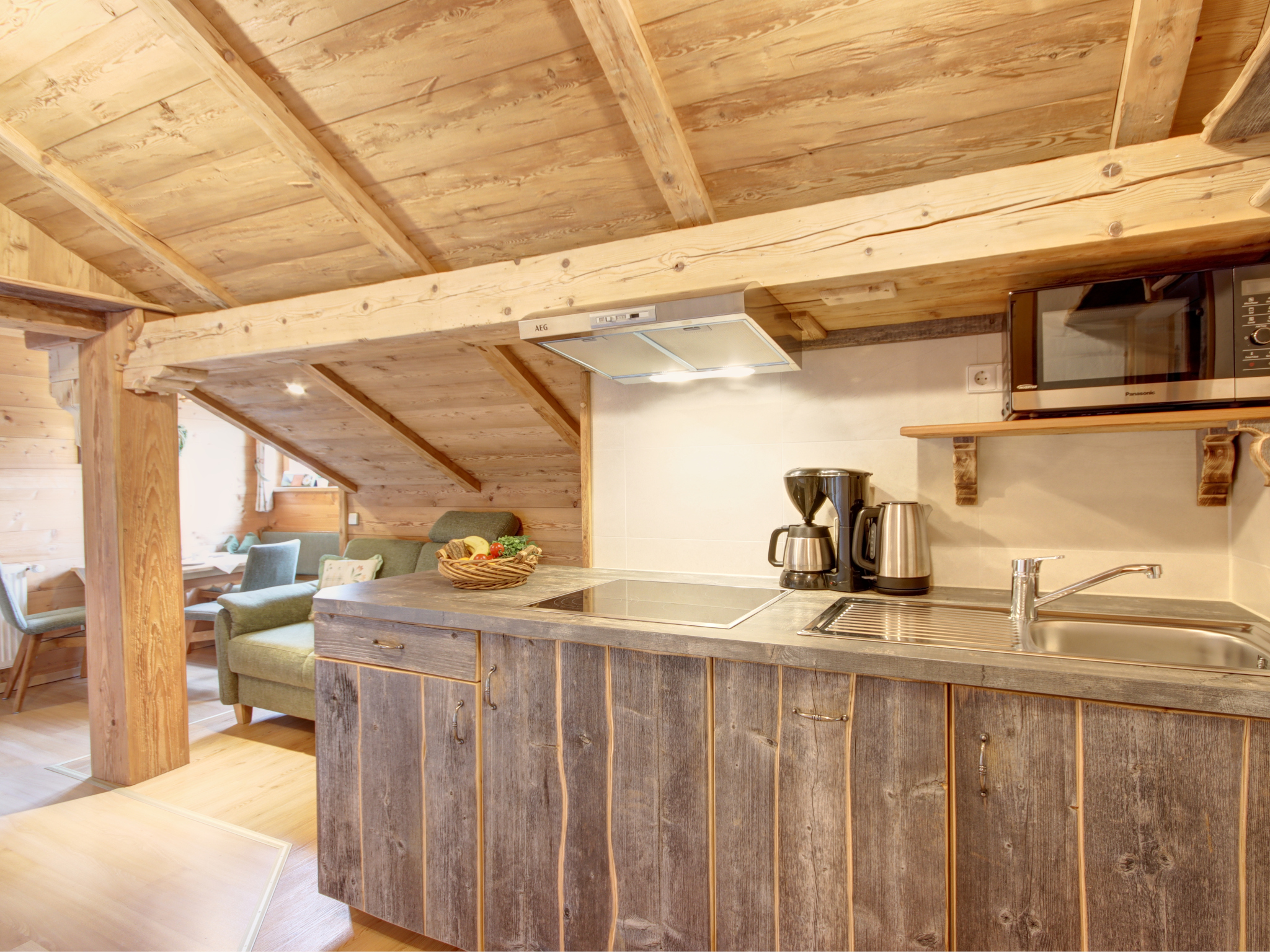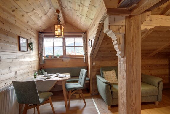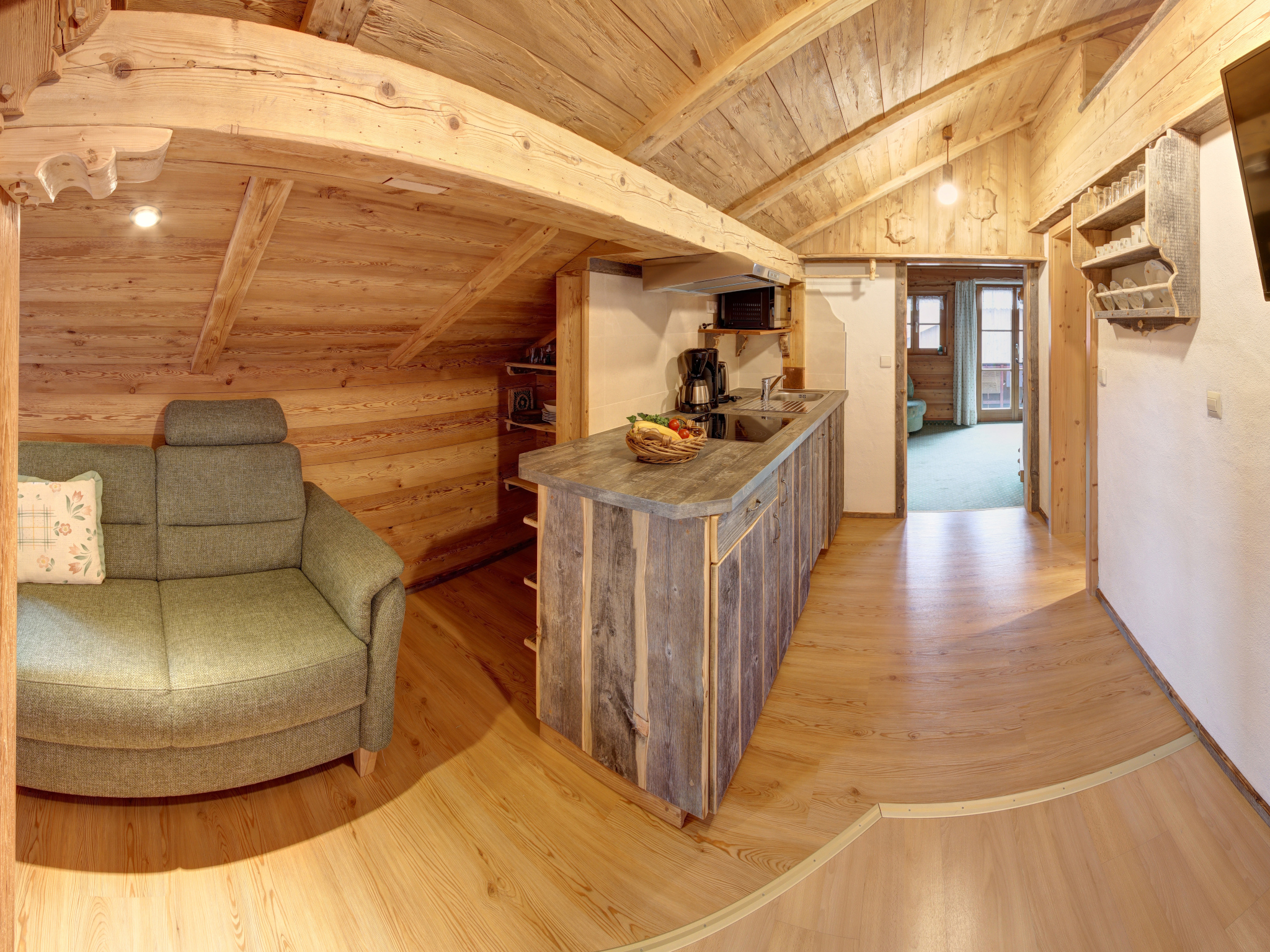 Die Ferienwohnung Gamsknogl hat eine Wohnfläche von 55qm und bietet Platz für bis zu 4 Personen. Die Ferienwohnung befindet sich im 2. Obergeschoss. Es gibt ein großes Schlafzimmer mit Doppelbett, Couchecke, TV, Digitalradio mit CD und ein Schlafzimmer mit getrennten Betten. In der voll ausgestattete Altholzküche gibt es eine Spülmaschine, Kaffeemaschine, Mikrowelle, Toaster, Eierkocher, Wasserkocher und einen Kühlschrank. Highlight der Wohnung ist ein eigener überdachter Ostbalkon.