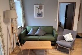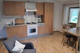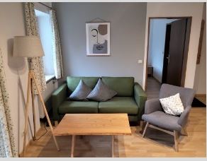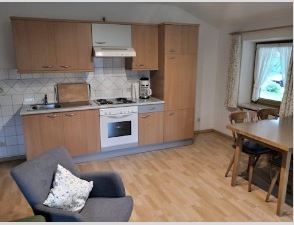 Ausstattung: Wohnküche - mit Sitzgruppe, Sofa und Fernseher. Küchenzeile ausgestattet mit Kühlschrank inkl. Gefrierfach, Kaffeemaschine, Wasserkocher und Toaster.