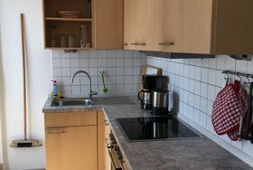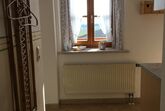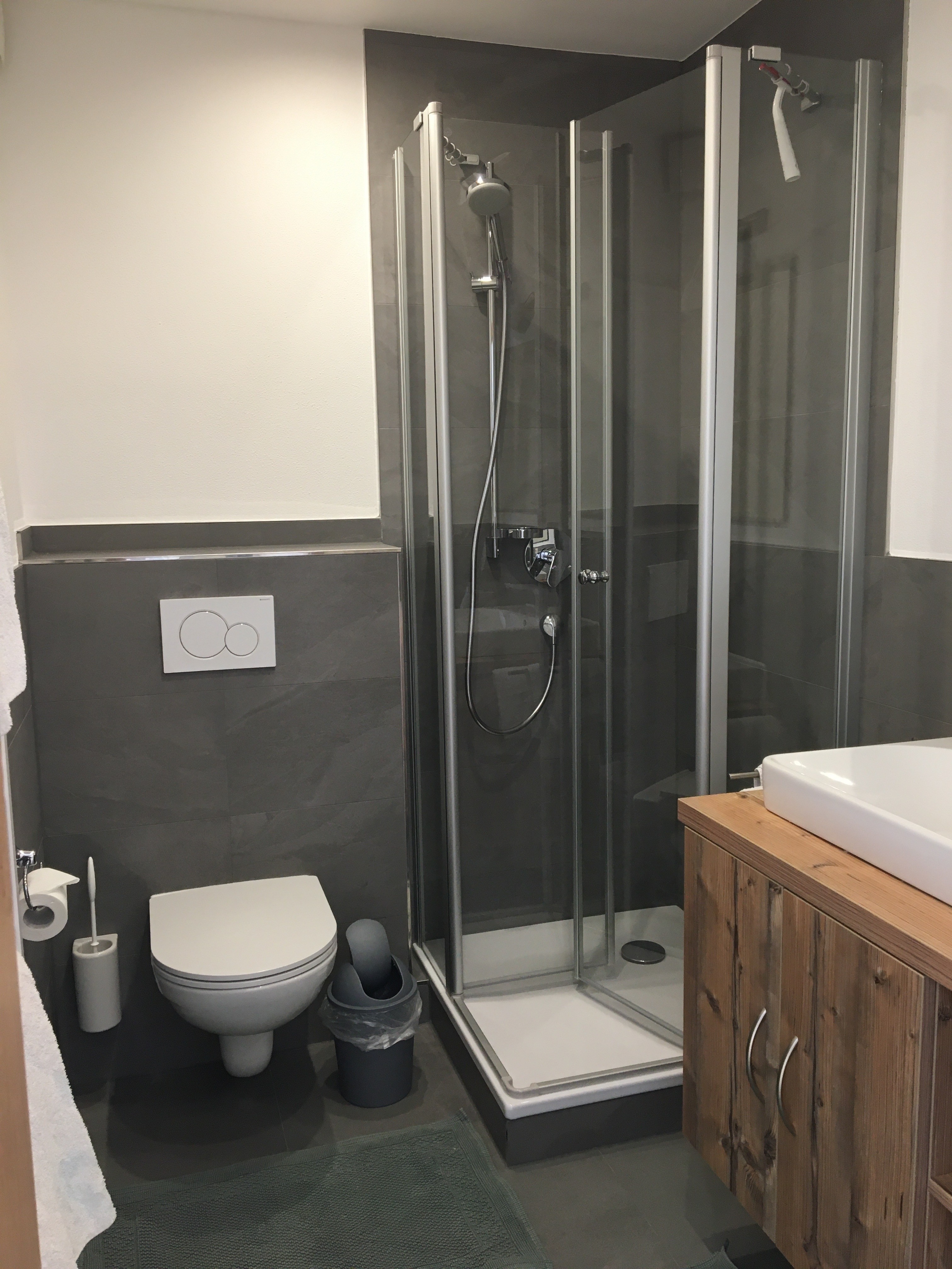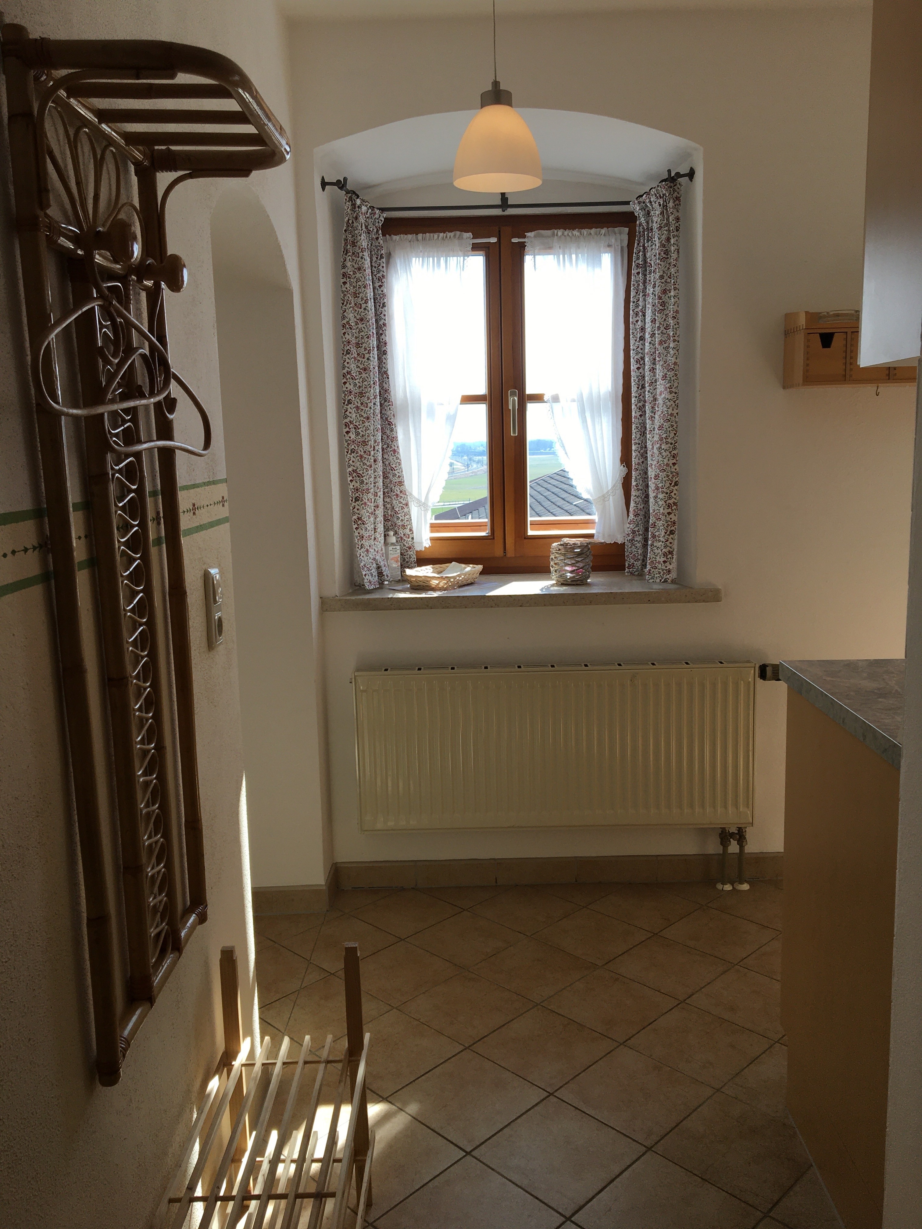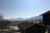 Eine kleine Ferienwohnung im Obergeschoss mit einer Dusche und einem WC. Kombinierter Wohn/- und Schlafraum. Von hier aus gibt es einen freien Blick auf die Berge.