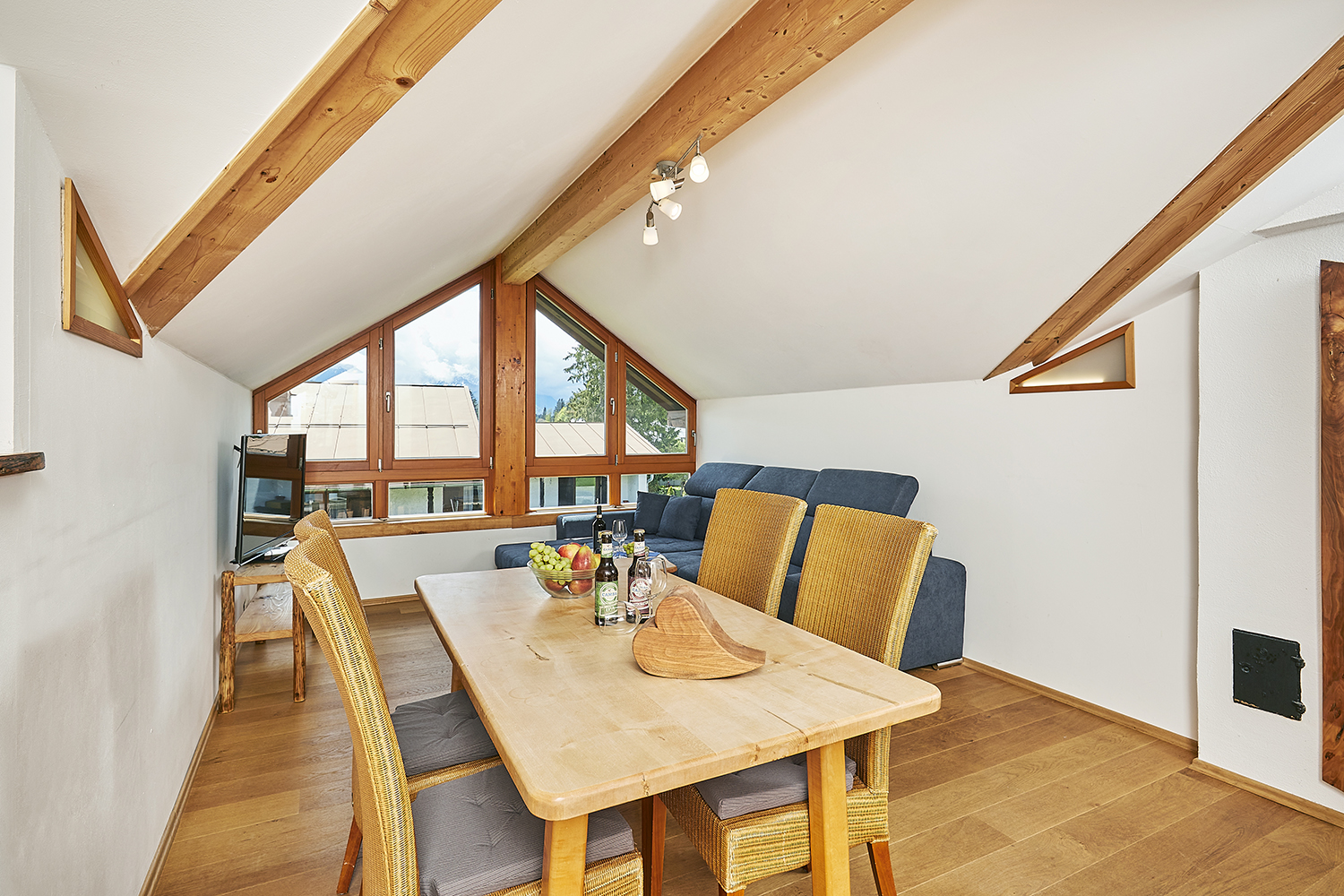 Treten Sie ein in diese großzügige Dachwohnung, die auf einer eigenen Etage Ihre ganz persönliche Auszeit verspricht. Zwei Schlafzimmer, zwei Balkone und ein wunderschöner Ausblick auf die majestätischen Berge schaffen eine Atmosphäre, in der Sie sich rundum wohlfühlen werden. Die komplett ausgestattete Küche lässt keine Wünsche offen und lädt zu gemeinsamen Kochabenden ein. Der große Wohnbereich mit einem gemütlichen Ecksofa und einem Flachbild-TV ist der perfekte Ort, um den Tag bei einem guten Film oder einem spannenden Buch ausklingen zu lassen. Die beiden Schlafzimmer bieten nicht nur Ruhe, sondern auch einen Platz für Entspannung – sei es im gemütlichen Doppelbett oder auf der Couch mit Blick auf die Natur. Das Badezimmer ist ein Ort der Erfrischung mit einer modernen Dusche und einem Fön. Genießen Sie die frische Bergluft auf den Balkonen – einer nach Osten, der andere nach Westen – und lassen Sie sich von den wechselnden Lichtstimmungen verzaubern.