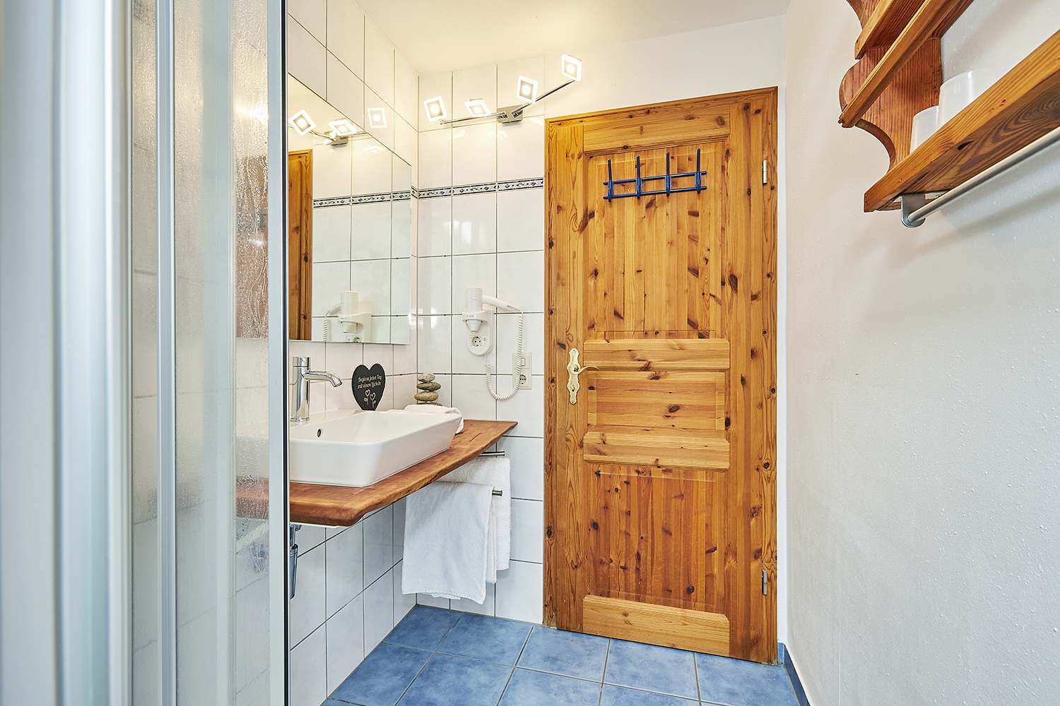 Das Bad ist mit Dusche, WC, Waschtisch und Fön ausgestattet.