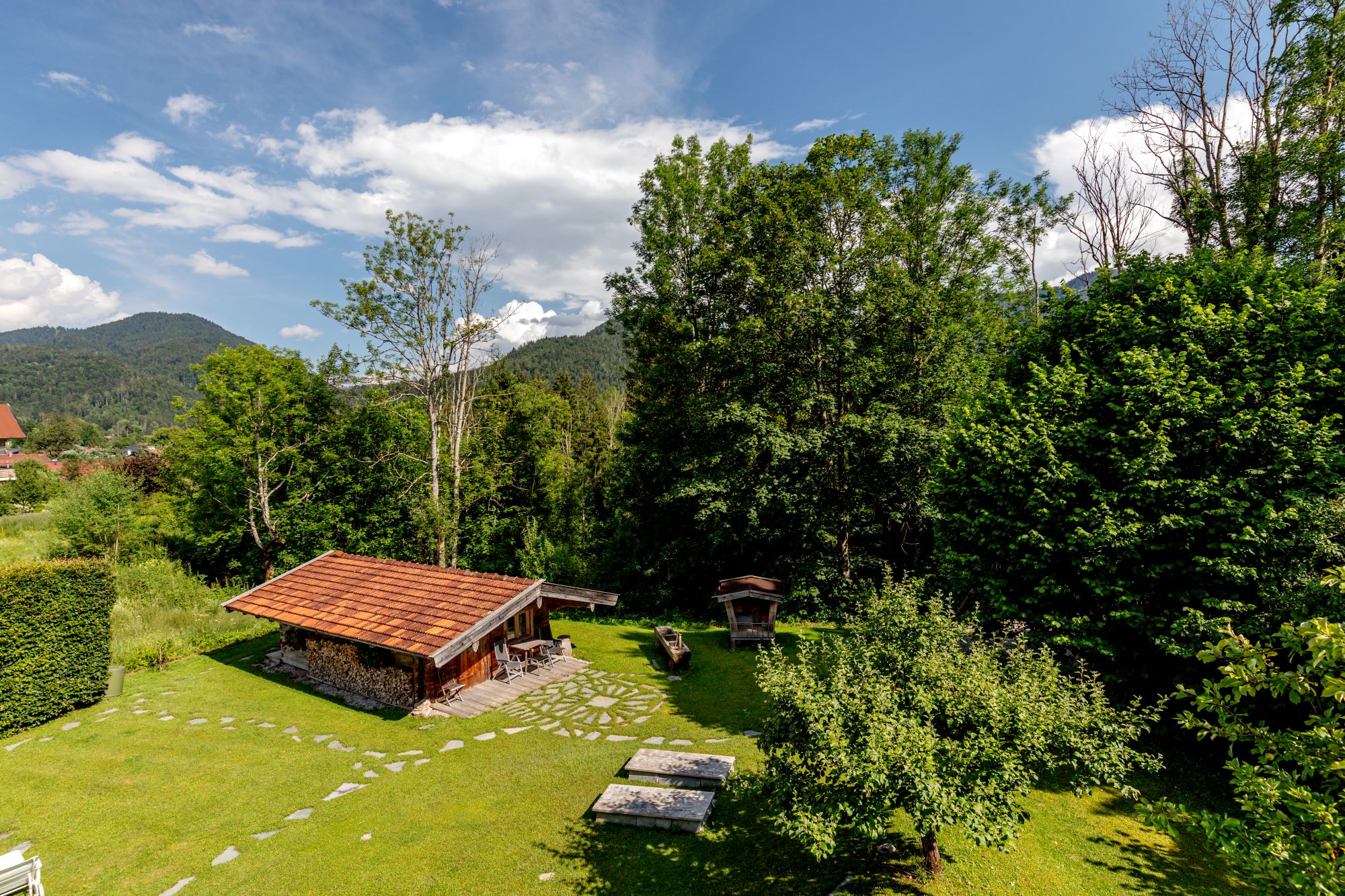 Balkon mit Bestuhlung und Blick in den Garten und herrlichen Bergblick.