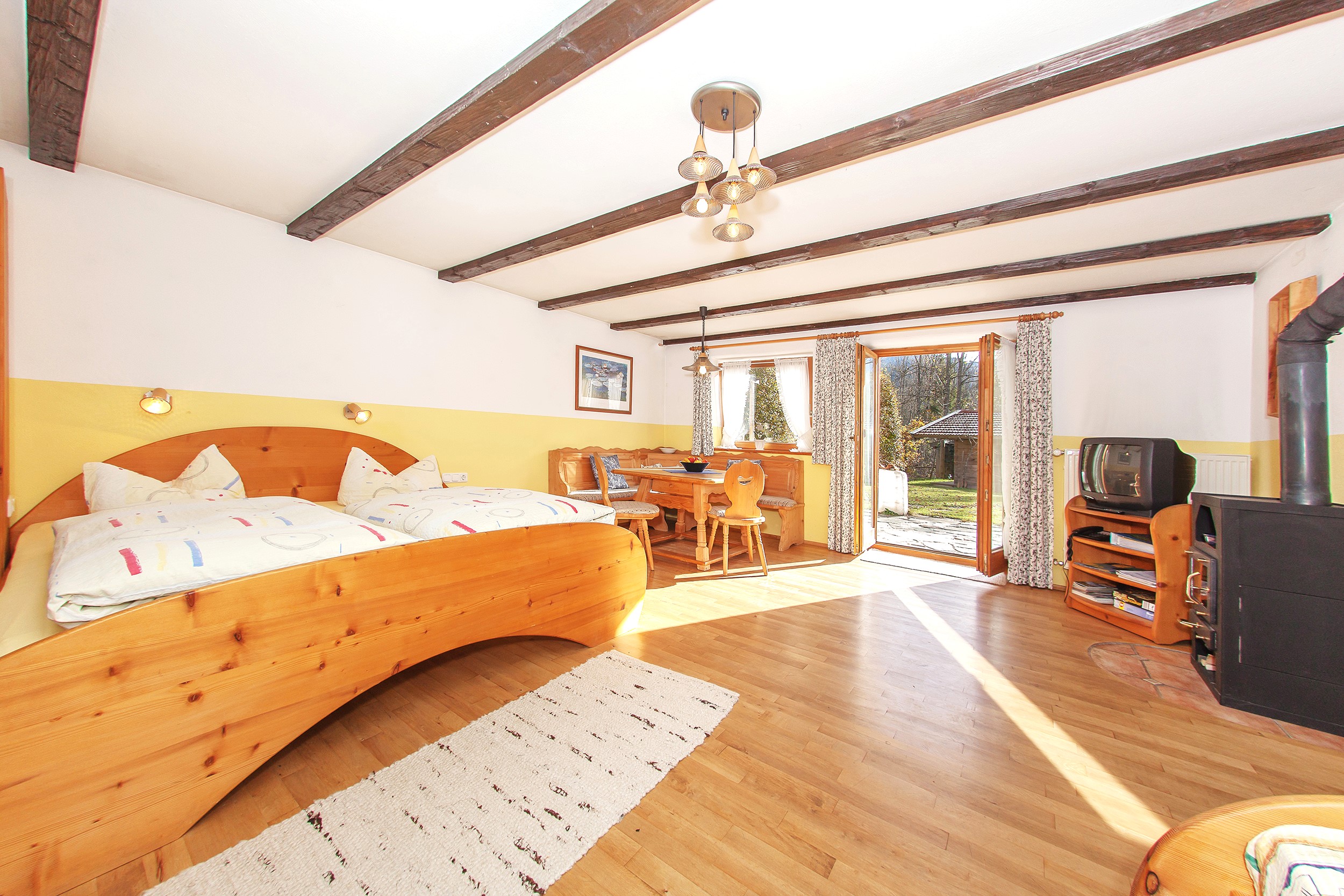 Diese charmante 1-Raumwohnung mit Terrasse und eigenem Eingang ist der perfekte Ort für Paare oder kleine Familien, die eine ganz besondere Atmosphäre suchen. Der offene Wohn-Schlafraum mit gemütlicher Eckbank, Kabel-TV und dem Schwedenofen (Brennholz auf Anfrage) schafft eine behagliche Stimmung. Hier können Sie den Tag in aller Ruhe beginnen oder bei einem gemütlichen Abend mit Blick auf den Garten ausklingen lassen. Das Doppelbett im Schlafbereich und die zusätzliche Schlafgelegenheit bieten Ihnen den Raum, den Sie brauchen. Das Badezimmer ist mit Dusche, WC und Fön ausgestattet, damit Sie sich frisch und erfrischt fühlen können. Die Terrasse mit Gartenmöbeln ist ein kleines Paradies für sich – hier können Sie den Tag in der Natur genießen.