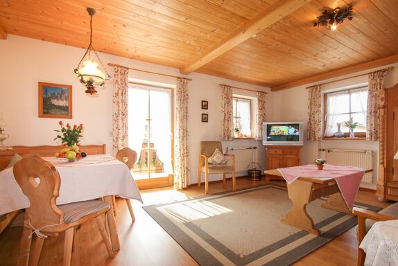 Die modernisierte Ferienwohnung ist liebevoll im Landhausstil eingerichtet. Genießen Sie Ihren Urlaub auf 45 qm Wohnfläche im 1. Obergeschoss, mit Südbalkon und Blick in die herrlichen Inzeller Berge.