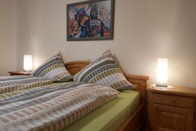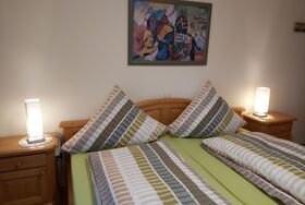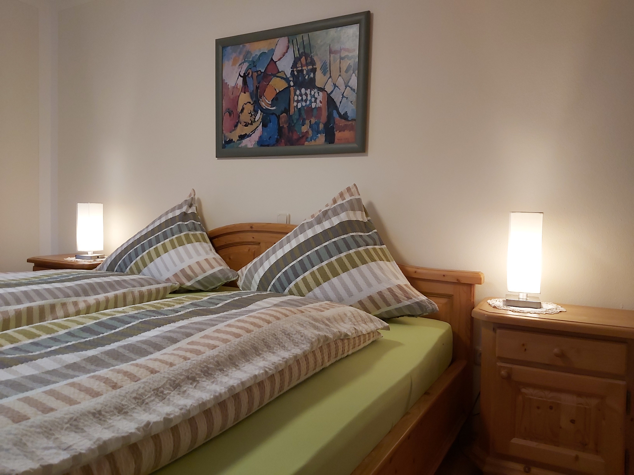 Ferienwohnung Obstgarten mit zwei seperaten Schlafzimmer und einer voll ausgestatteten Küche mit Backofen und Spülmaschine. Das Wohnzimmer ist geräumig und bietet mit CD / DVD und Flachbildschirm viel Komfort. Von den Schlafzimmern und vom Wohnzimmer hat man direkten Zugang zum Südbalkon.