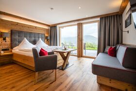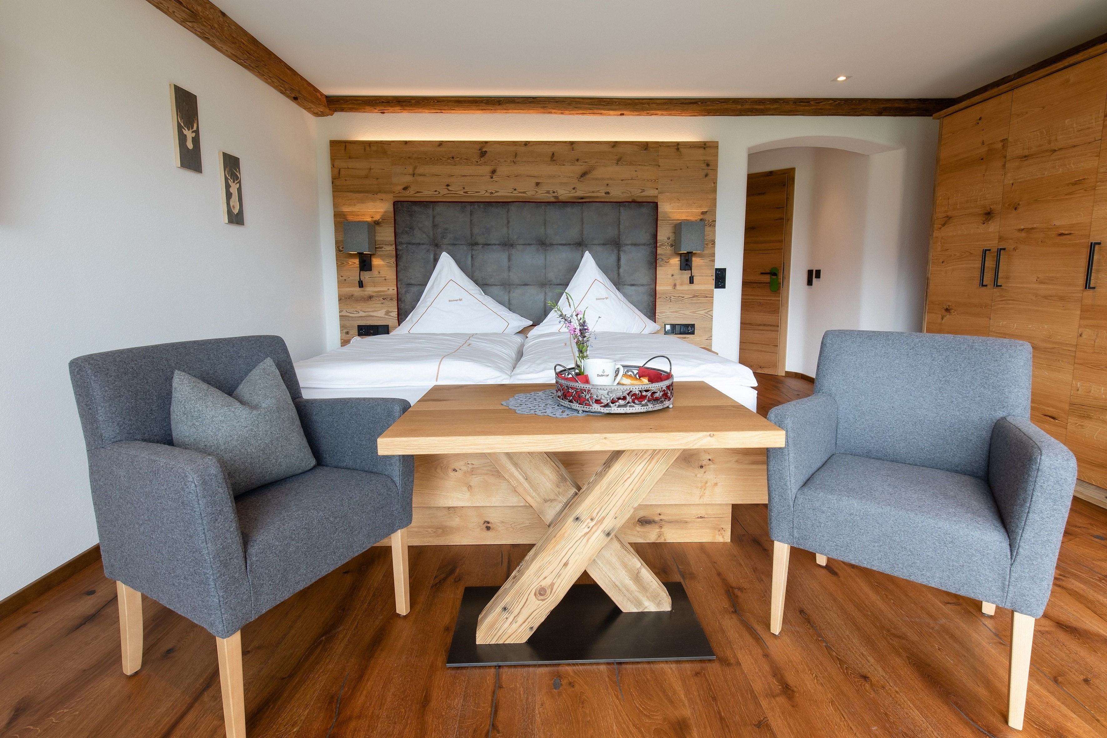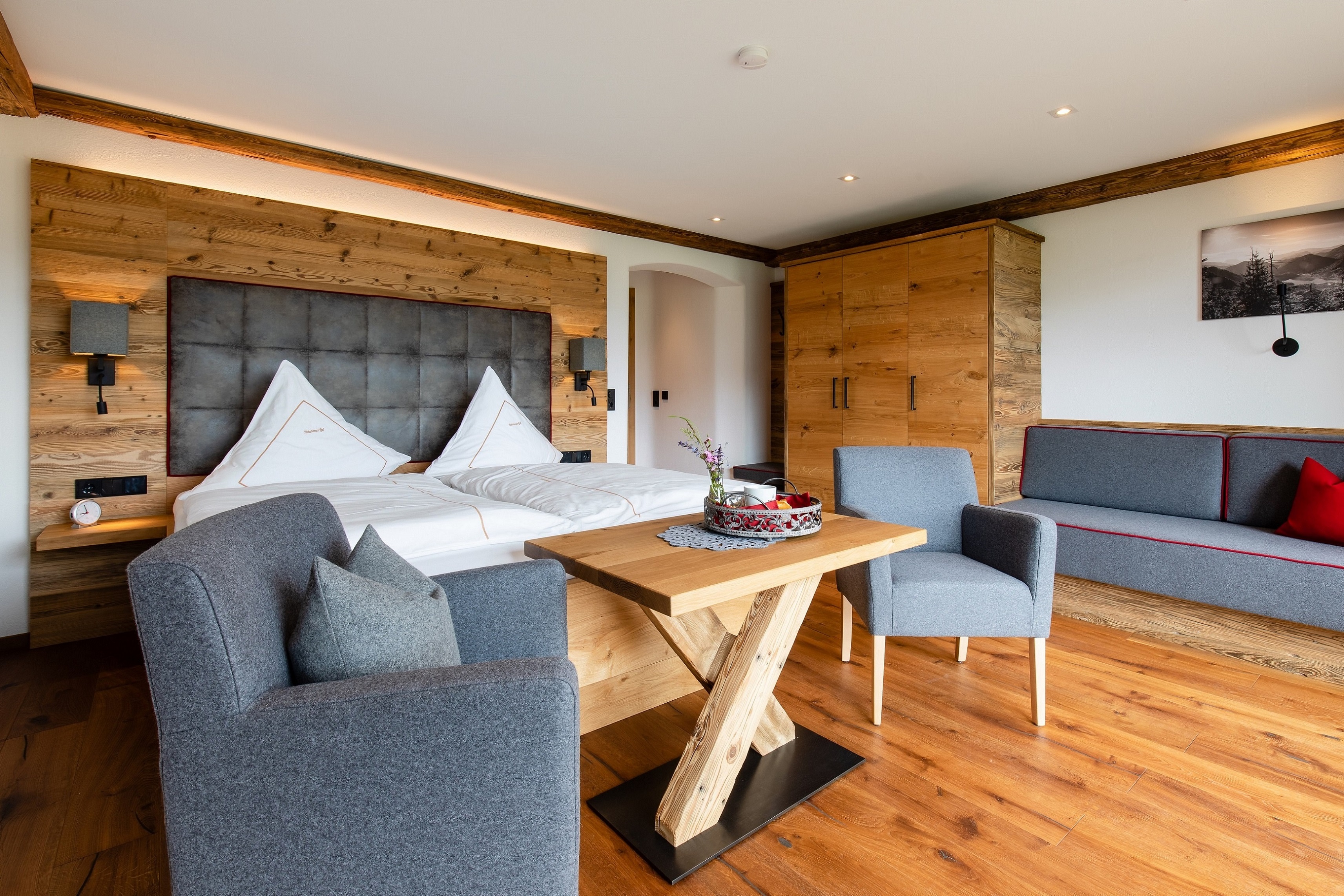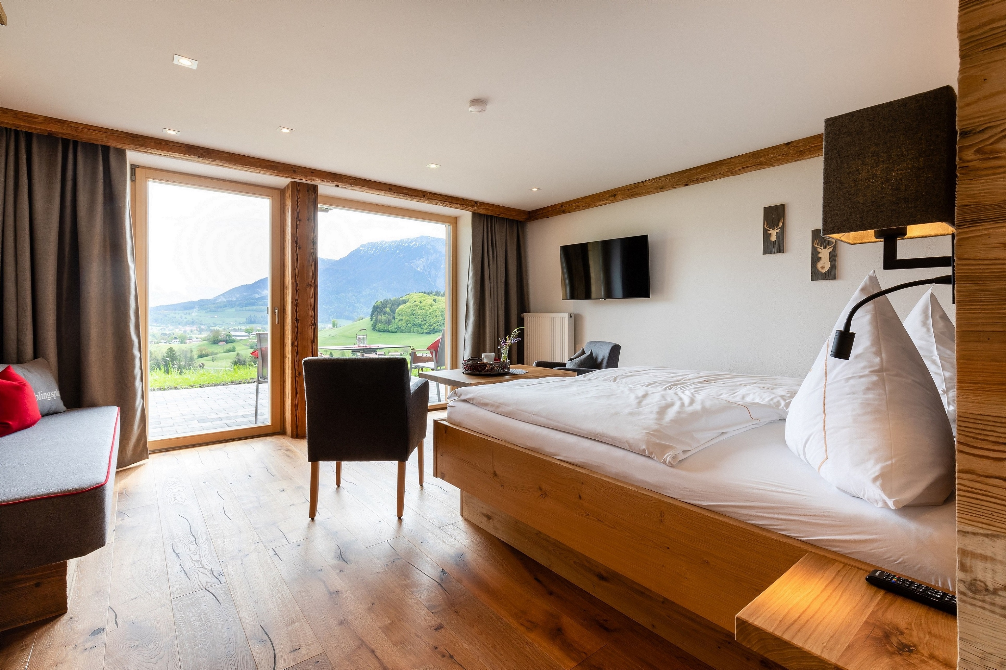 Atemberaubender Blick über den Ruhpoldinger Talkessel, abgetrennte Terrasse mit Liege, Altholz, viel Gemütlichkeit, Kuschelcouch, ebenerdige Regendusche, Holzboden, kostenfreies WLAN, Flat-TV, Zimmersafe - die besten Voraussetzungen für einen unvergesslichen Urlaub.... Das ebenerdige Zimmer ist aufgrund der Hanglage nur über eine Treppe erreichbar.