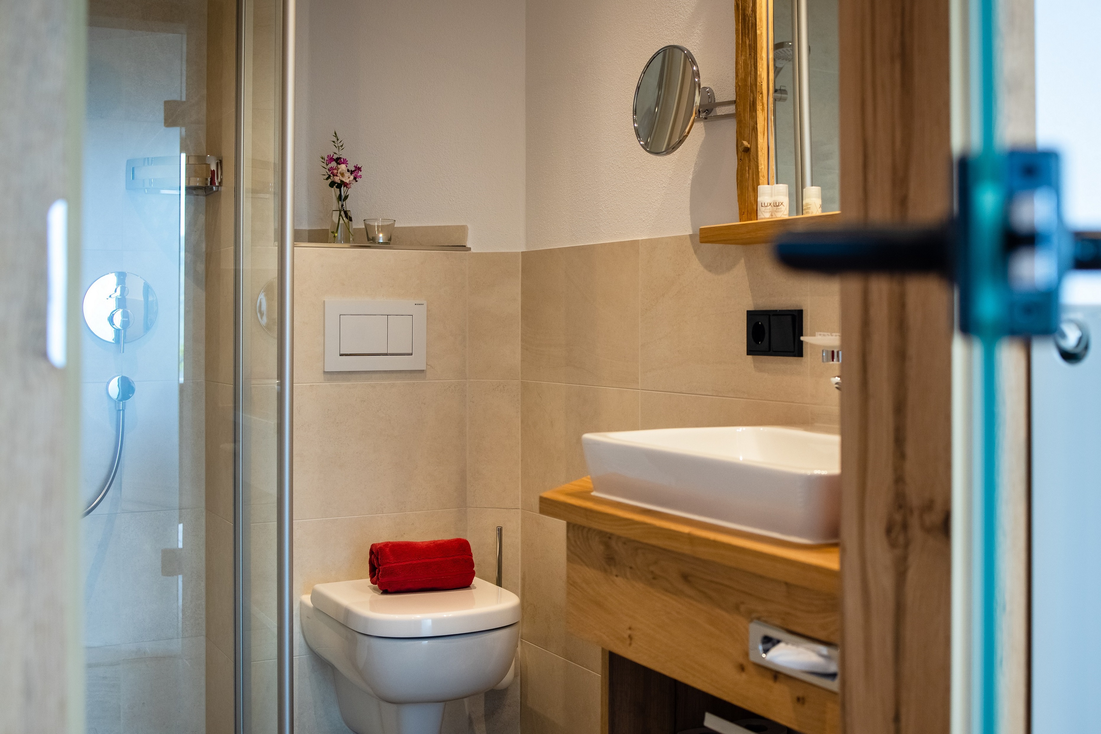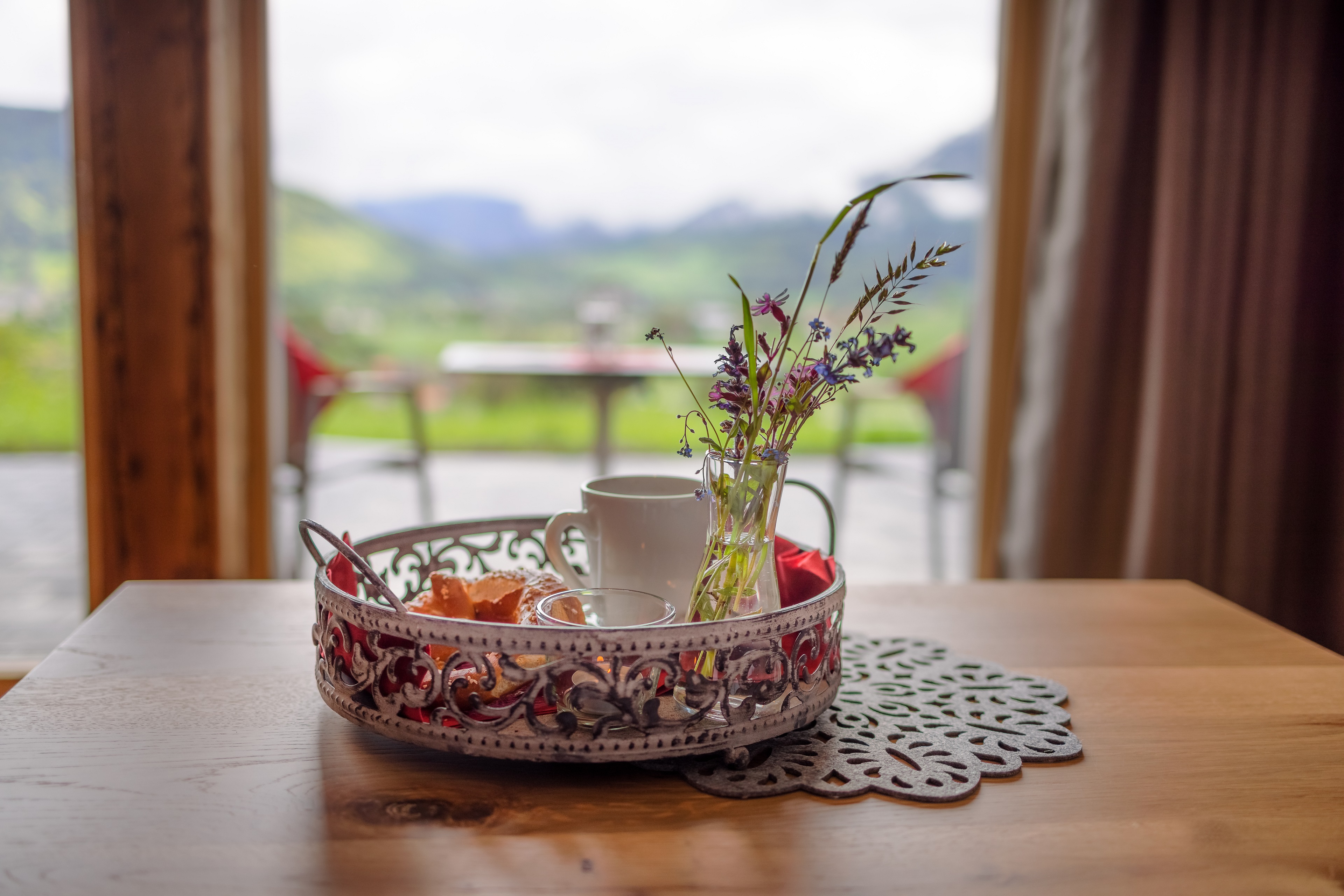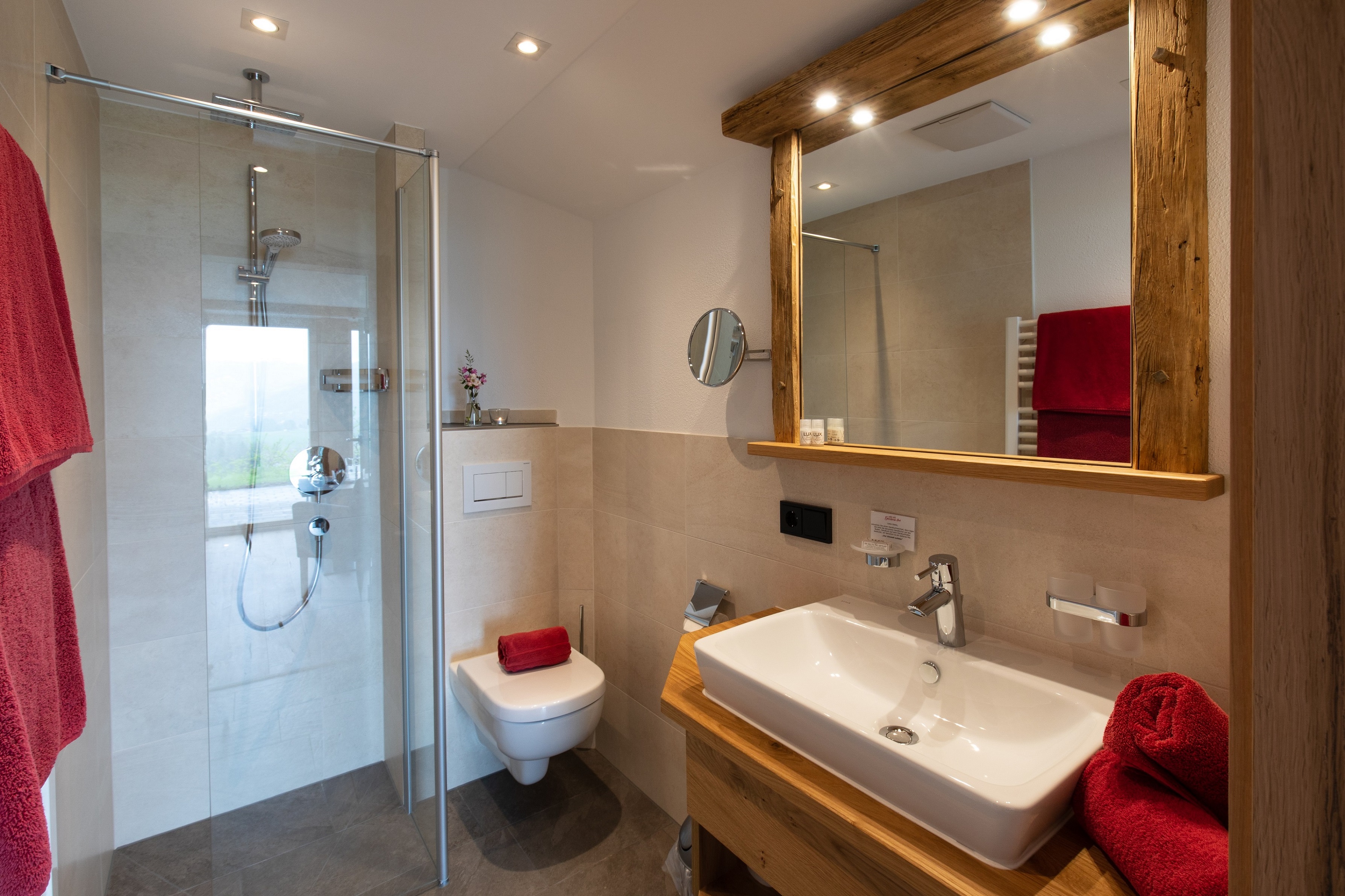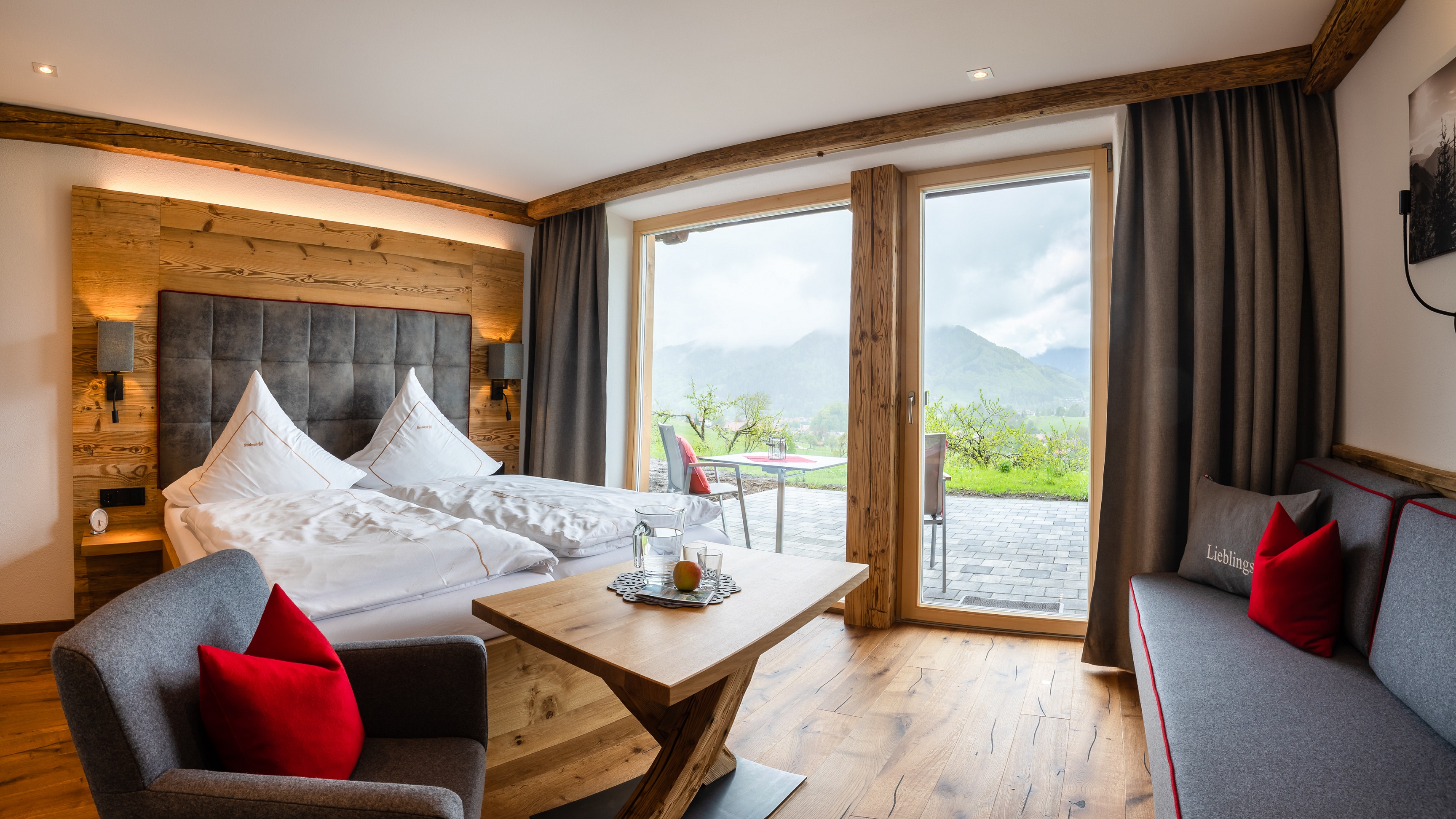 Atemberaubender Blick über den Ruhpoldinger Talkessel, abgetrennte Terrasse mit Liege, Altholz, viel Gemütlichkeit, Kuschelcouch, ebenerdige Regendusche, Holzboden, kostenfreies WLAN, Flat-TV, Zimmersafe - die besten Voraussetzungen für einen unvergesslichen Urlaub.... Das ebenerdige Zimmer ist aufgrund der Hanglage nur über eine Treppe erreichbar.