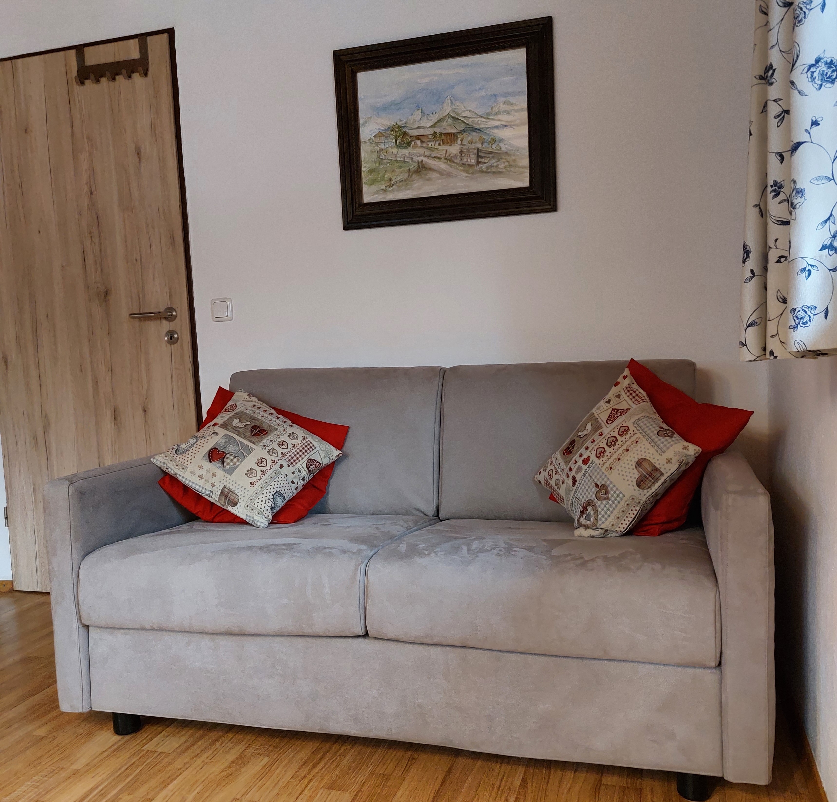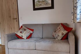 Diese komfortable Ferienwohnung verfügt über ein großräumiges Wohnzimmer mit Blick auf den Garten, in dem sich für Sie eine schöne Sitzgelegenheit befindet. Das angenehme Ambiente der Ferienwohnung lädt dazu ein den Aufenthalt zu genießen und sich richtig wohl zu fühlen. Die hochwertige Ausstattung bestehend aus Koch- und Essgeschirr, Besteck, Gläser, Bettwäsche und Handtücher sind in ausreichender Zahl vorhanden. Kaffeemaschine (Filter), Wasserkocher, Eierkocher, Toaster und Putzutensilien runden das Angebot ab. Babybett und Hochstuhl auf Anfrage möglich. Nichtraucherwohnung; Rauchen am Balkon gestatett. Keine Haustiere möglich.