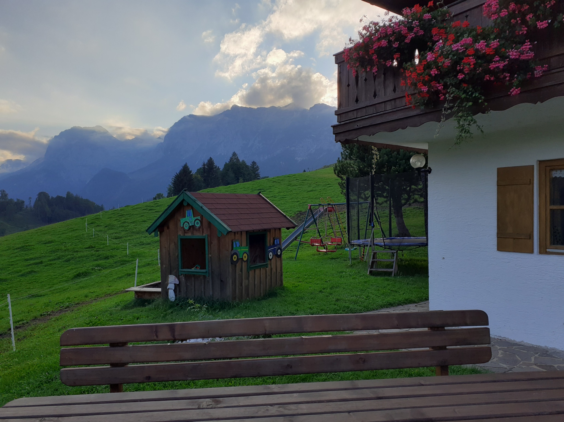Unser Hof ist bereits seit Generationen in Familienbesitz. Wir leben, arbeiten und wachsen mit unseren Tieren und schaffen uns gemeinsam ein kleines Paradies. Ferienwohnung 1 befindet sich im Bauernhaus und bieten einen unvergesslichen Panoramablick der zum wandern und/oder einfach zum genießen einlädt. Vom Balkon aus der auf der Westseite des Gebäudes liegt hat man einen herrlichen Blick über unsere Felder bis zum Steinberg, Hochkalter und die Reiter Alpe. Ein perfekter Ort um die Seele baumeln zu lassen und im Sommer die Gesellschaft von weidenden Rindern und Ziegen zu genießen. Ein Gefühl wie auf der Alm!! Natürlich bietet auch der Frühling, Herbst und Winter unvergesslich schöne Eindrücke.
