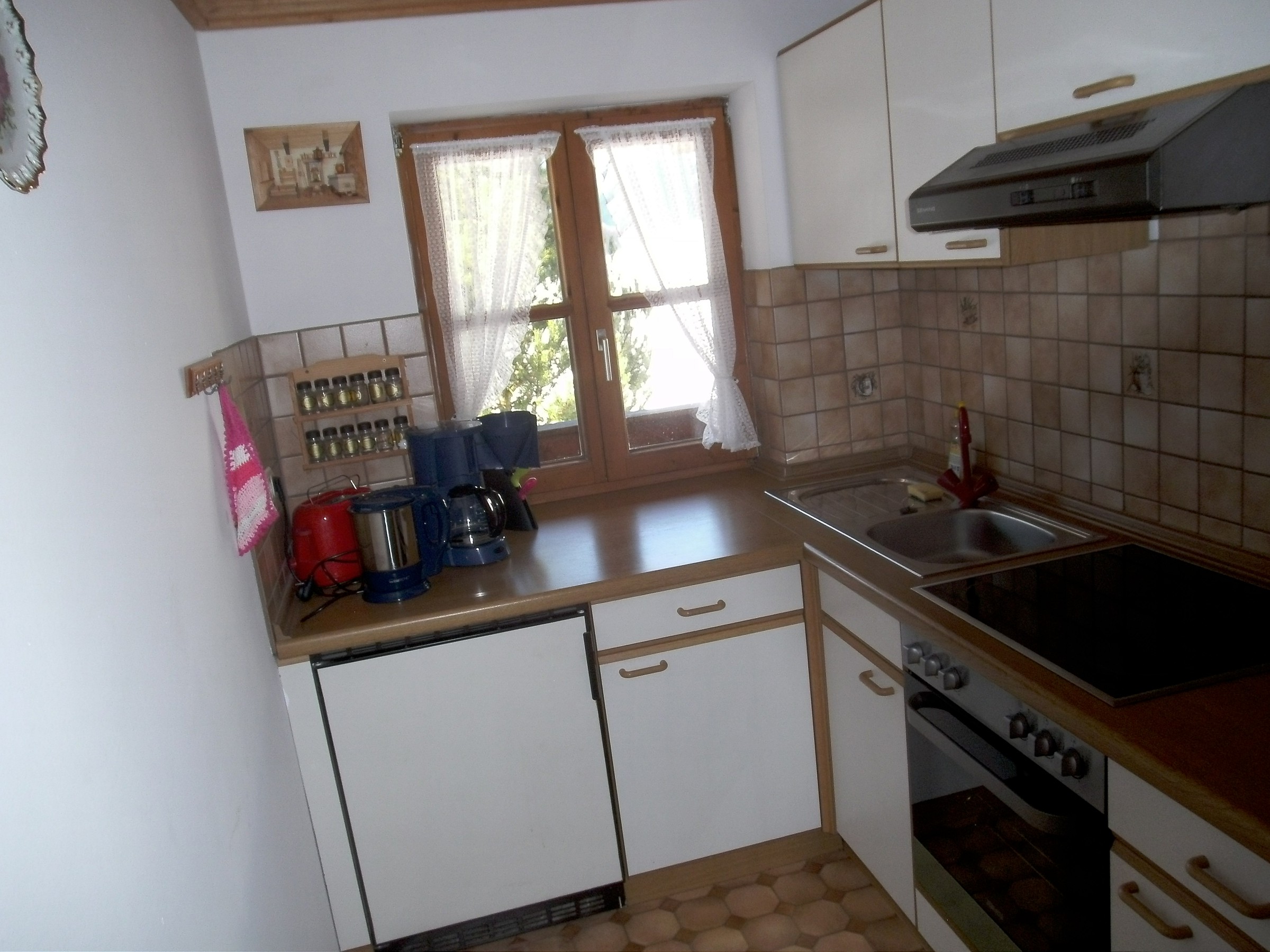 Die kleine und gemütliche Ferienwohnung liegt an der Westseite des Hauses und bietet einen traumhaften Blick auf das umliegende Bergpanorama. Die Küche ist voll ausgestattet mit Herd, Kühlschrank mit Gefrierfach, Toaster, Wasserkocher, Kaffeemaschine und Eierkocher, außerdem steht Ihnen zahlreiches Kochgeschirr zur Verfügung. Für die anschließende Sauberkeit ist mit Spülmittel, -schwämmen und Tüchern ebenfalls gesorgt. Die Wohnung bietet Ihnen einen geräumigen Essbereich und natürlich auch die Möglichkeit auf dem Balkon zu essen, trinken und das sonnige Alpengefühl zu genießen. In unserer Unterkunft steht Ihnen kostenloses W-LAN zur Verfügung. Wir freuen uns Sie in unserem Haus begrüßen zu dürfen!