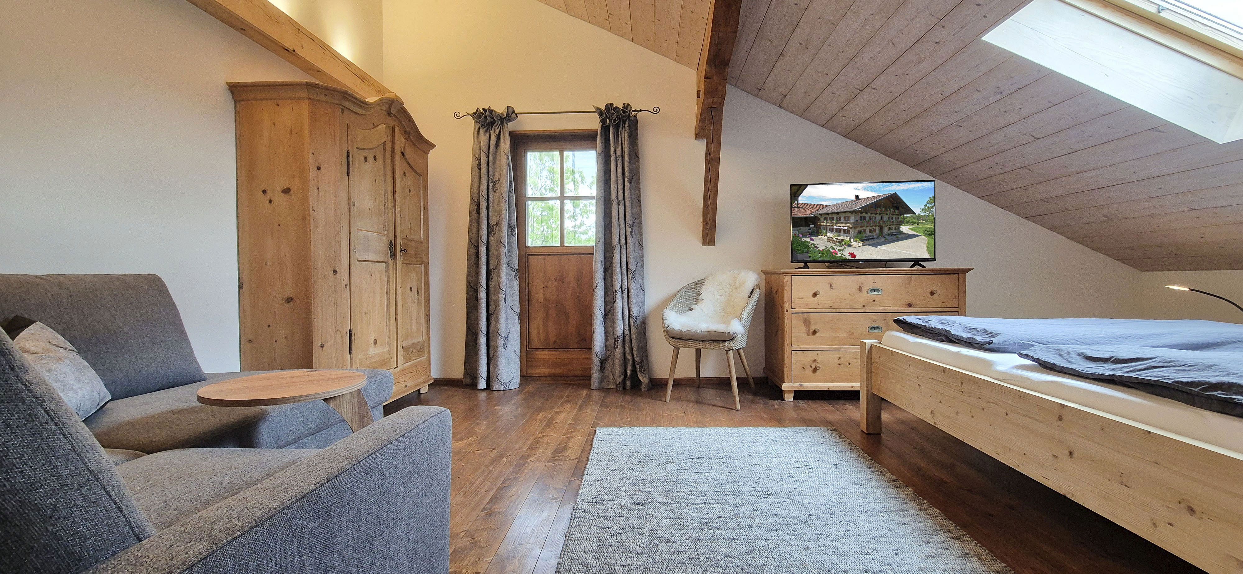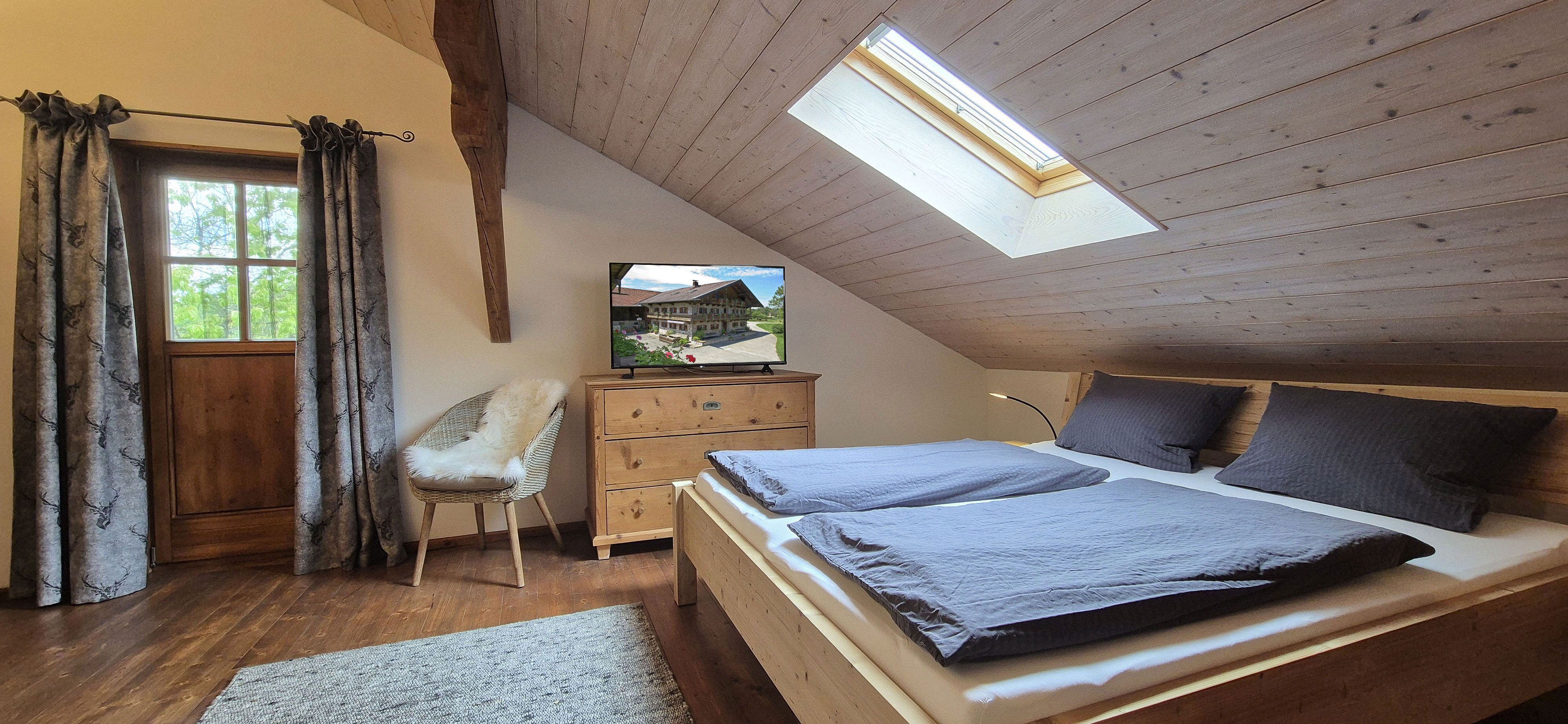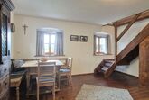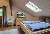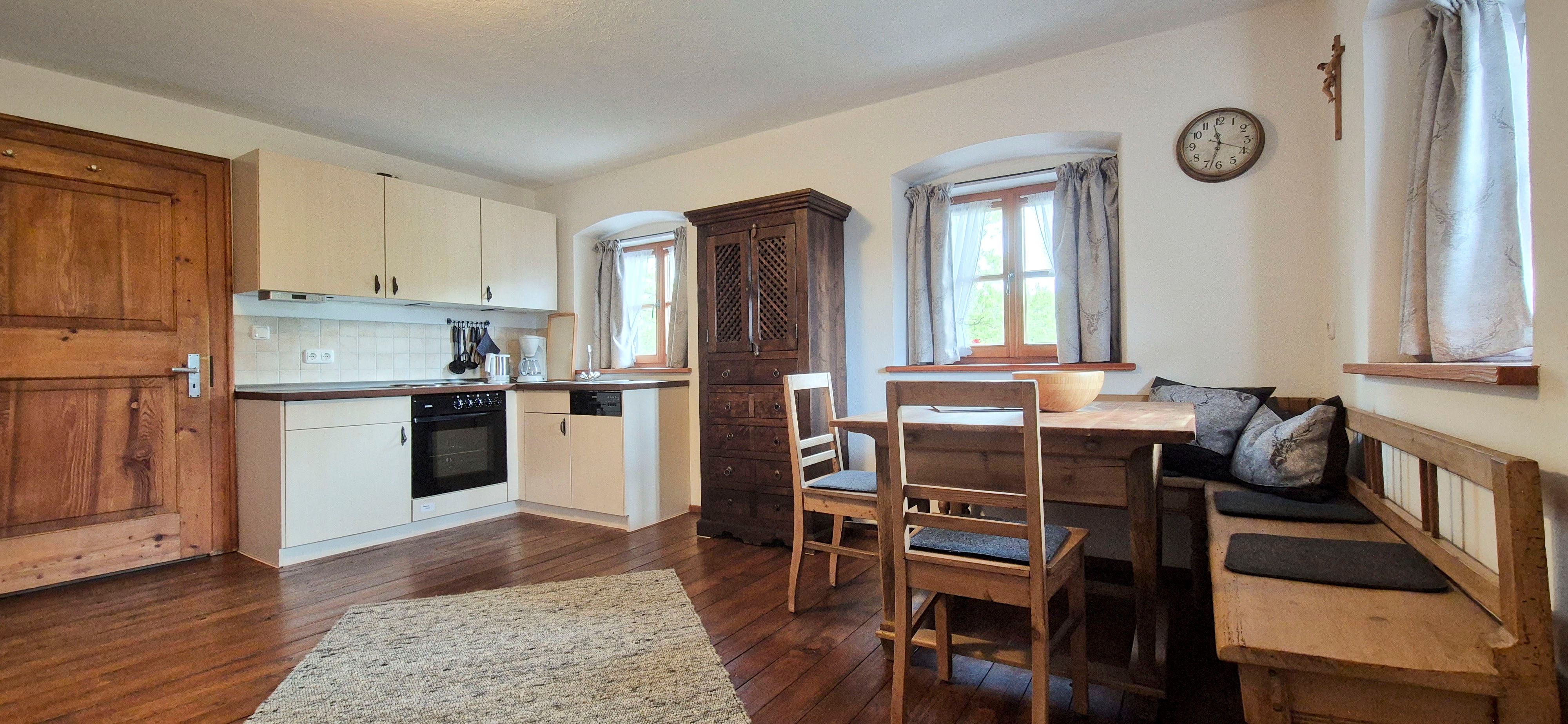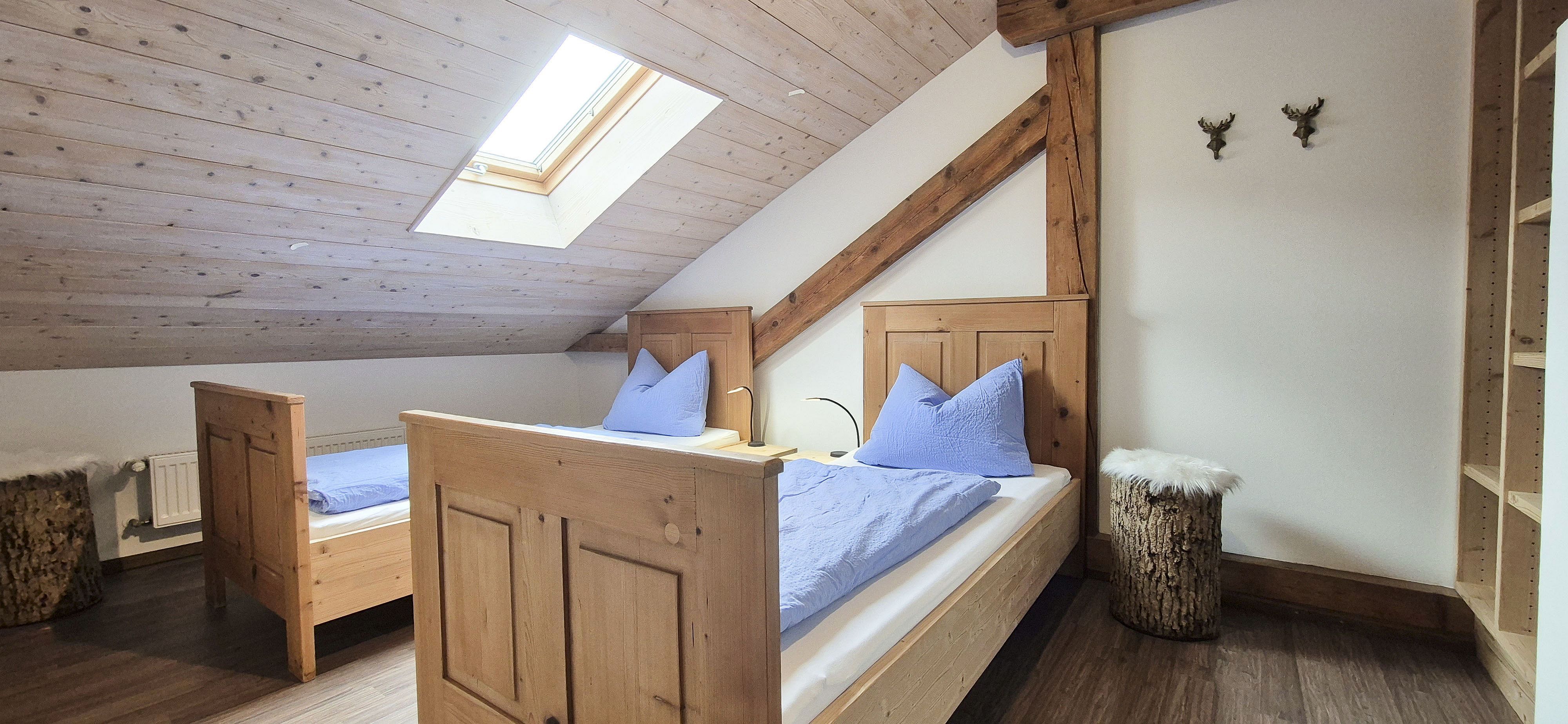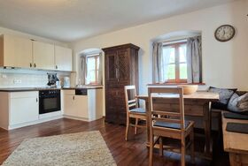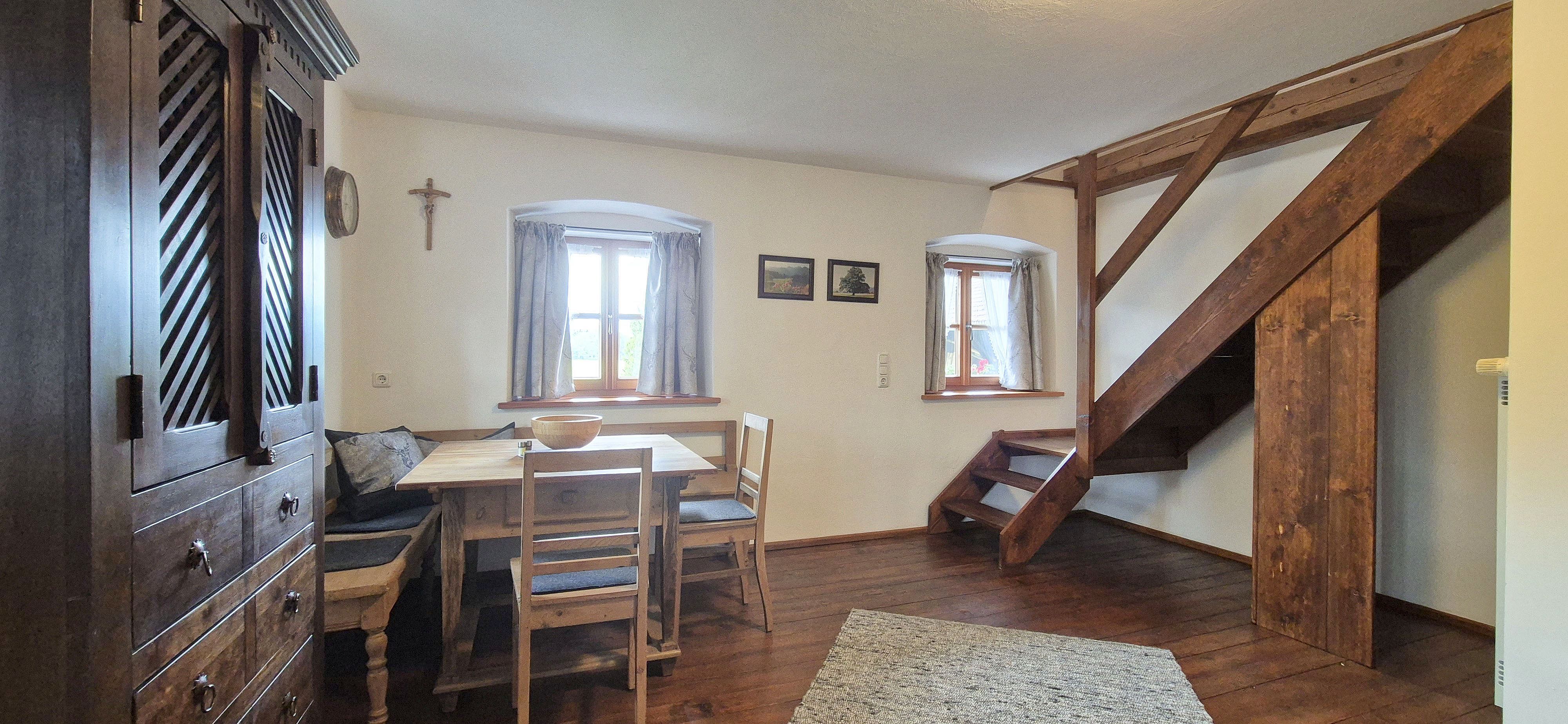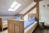 Die Ferienwohnung liegt im 1. Stock und ist mit 2 separaten Mansardenschlafzimmern, die über eine Treppe von der Wohnküche aus zu begehen sind, ausgestattet. Es gibt eine gemütliche Wohnküche mit Essplatz. Du/WC und einen Ostbalkon. 1 Doppelzimmer kann zur FW zugemietet werden. Gartenhäuschen mit Grillmöglichkeit.