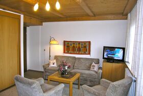Im Wohnraum ist ein großer Einbauschrank, zwei Sessel, ein Flachbild-TV und eine Couch, die nach Bedarf zu Doppelbett ausgezogen werden kann.