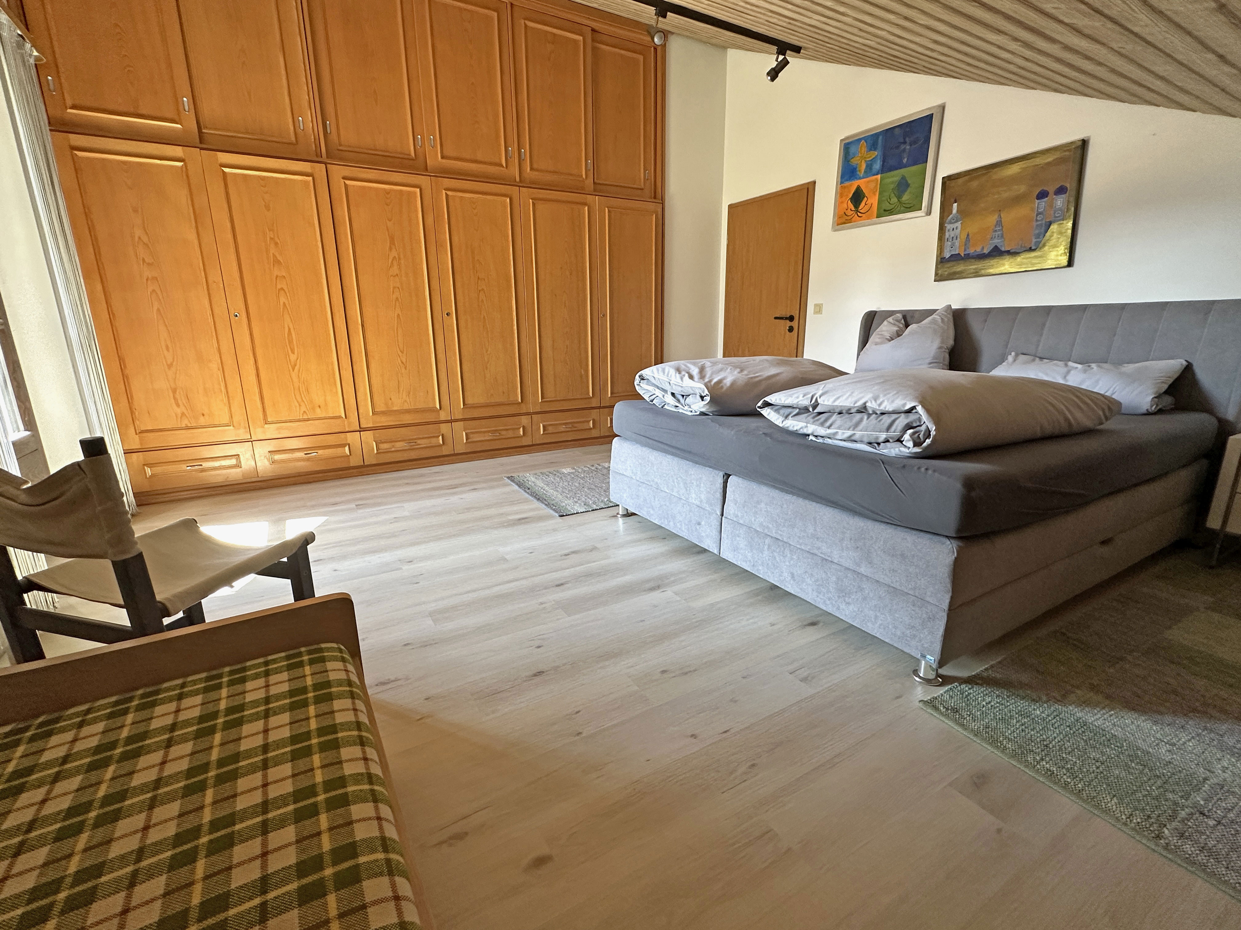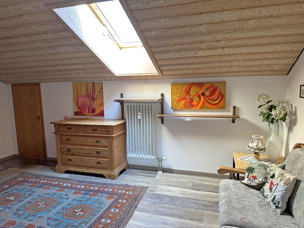 Genießen Sie Ihren Aufenthalt in einer großzügigen und lichtdurchfluteten Ferienwohnung im Dachgeschoss eines gepflegten Mehrparteienhauses. Die Wohnung im 2. Stock, erreichbar über ein breites Treppenhaus, bietet eine gemütliche, rustikale Atmosphäre mit liebevollen Details, die zum Wohlfühlen einladen. Erholen Sie sich bei sonnigen Stunden auf dem Südbalkon, der eine schöne Aussicht bietet und den offenen Wohnraum mit natürlichem Licht durchflutet. Der Wohnbereich besticht durch eine großzügige Sitzgruppe und einen Essplatz unter einem hellen Dachfenster – perfekt für gemeinsame Mahlzeiten und entspannte Momente. Die voll ausgestattete Küche mit Geschirrspüler, Mikrowelle, E-Herd sowie Kühl- und Gefrierschrank lässt keine Wünsche offen und macht das Kochen zum Vergnügen. Die Holzdecken und der elektrisch betriebene Kachelofen verleihen der Wohnung ein besonders gemütliches Ambiente, das zum Entspannen einlädt. Das separate Schlafzimmer mit Dachschräge ist ausgestattet mit einem Doppelbett und einem Einzelbett, sodass es sowohl für Paare als auch für Familien geeignet ist. Ein großzügiger Eingangswohnbereich, mit einer ausziehbaren Schlafcouch, bietet eine zusätzliche Schlafmöglichkeit. Badezimmer mit Dusch-/Badewanne und zwei Waschbecken, von Komfort ist ein separates WC.