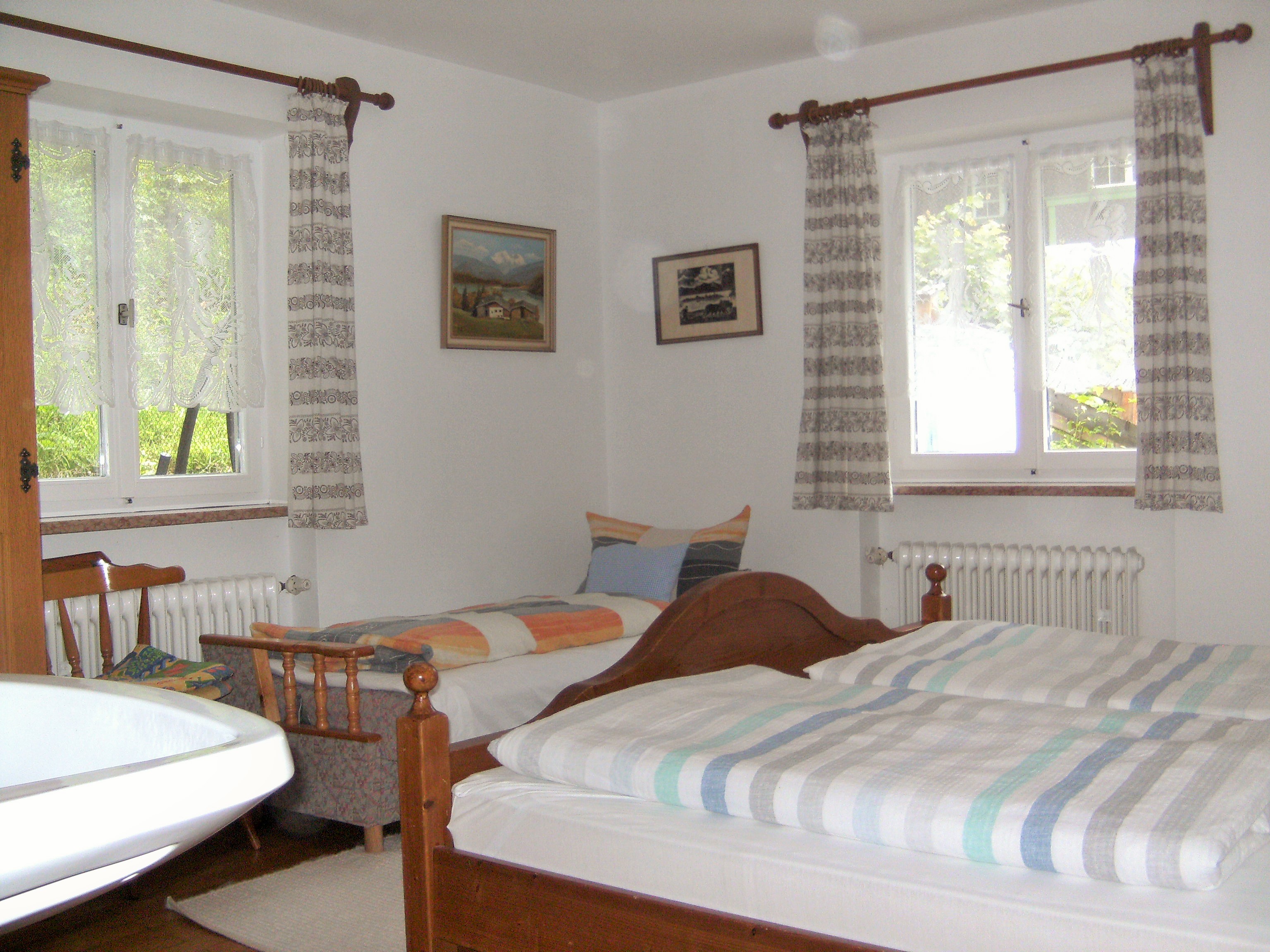 Unsere Ferienwohnung Obersee ist im Hochparterre mit Terrasse. Sie ist ausgestattet mit einem Schlafzimmer, Wohn- und Schlafzimmer mit gemütlichem Erker, Wohnküche komplett mit Backofen, Essecke, Sat-TV und Radio, WLAN, Bad / WC mit Badewanne und Dusche, Fön und Handtücher.