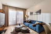 Zur Ausstattung gehören ein offener Wohnraum mit Küche und Kochinsel, Badezimmer mit bodenebener Regendusche, Schlafzimmer mit Boxspringbett, Holzböden, elektrische Jalousien und Waschmaschine.