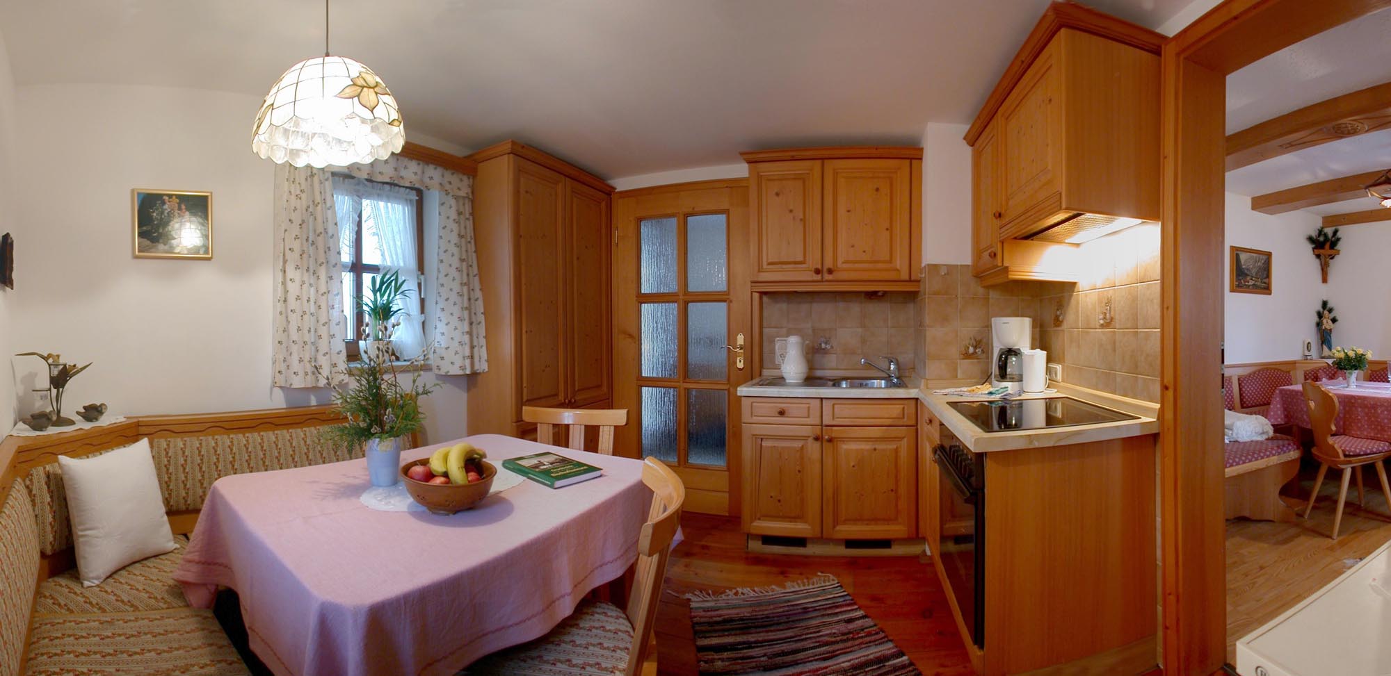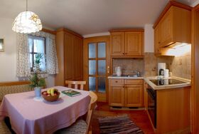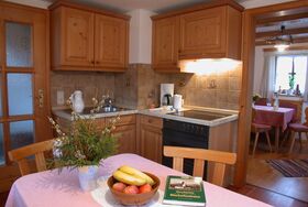 Im Erdgeschoss befinden sich die Küche mit Essecke, ein WC und die Wohnstube mit Kachelofen. Wir haben bei Anreise einen Korb mit Holz für Sie vorbereitet und zeigen Ihnen auch gerne, wie Sie den Ofen anheizen. Wenn Sie mehr Holz benötigen, können Sie dieses gerne von uns entgegennehmen.