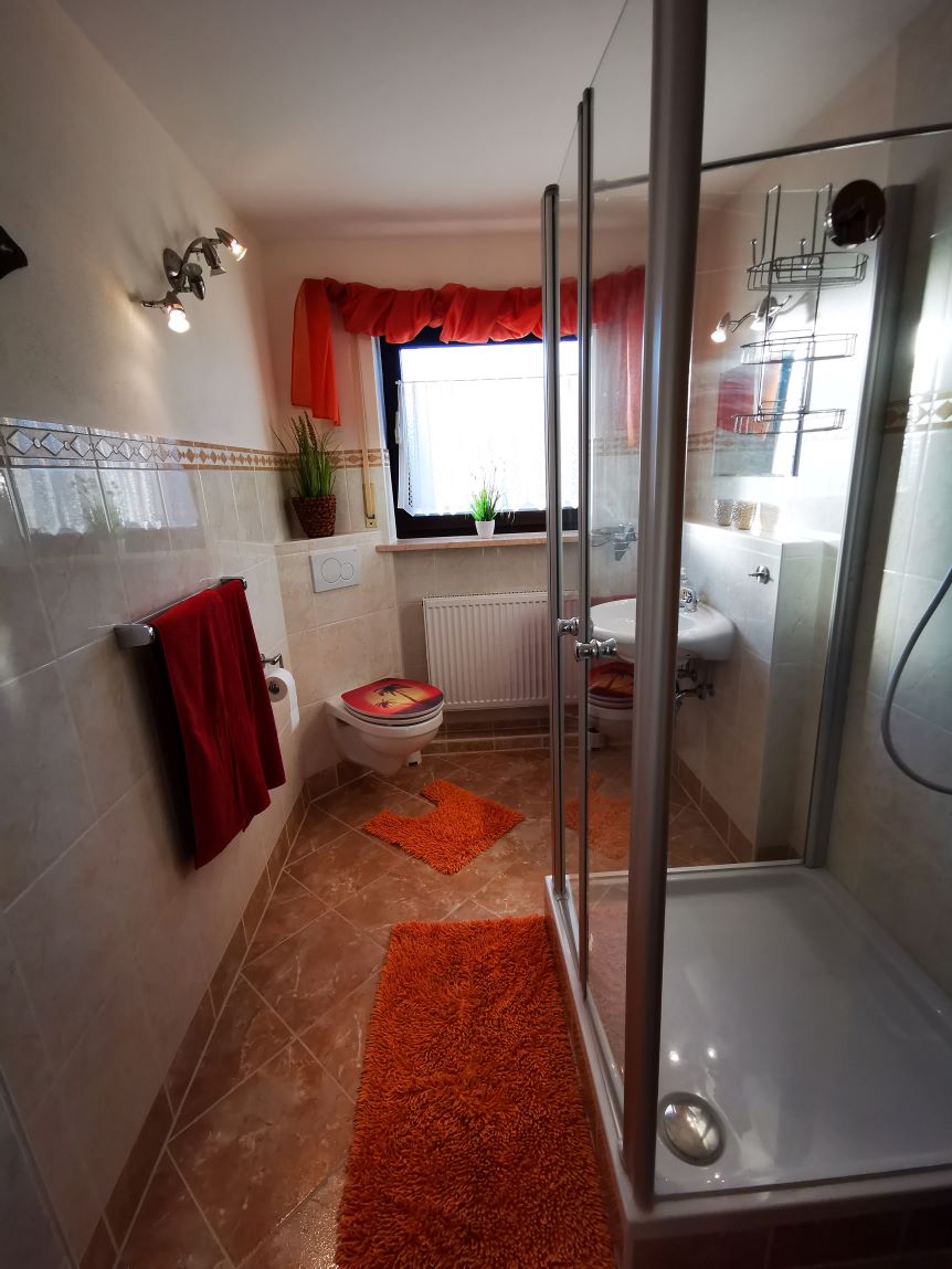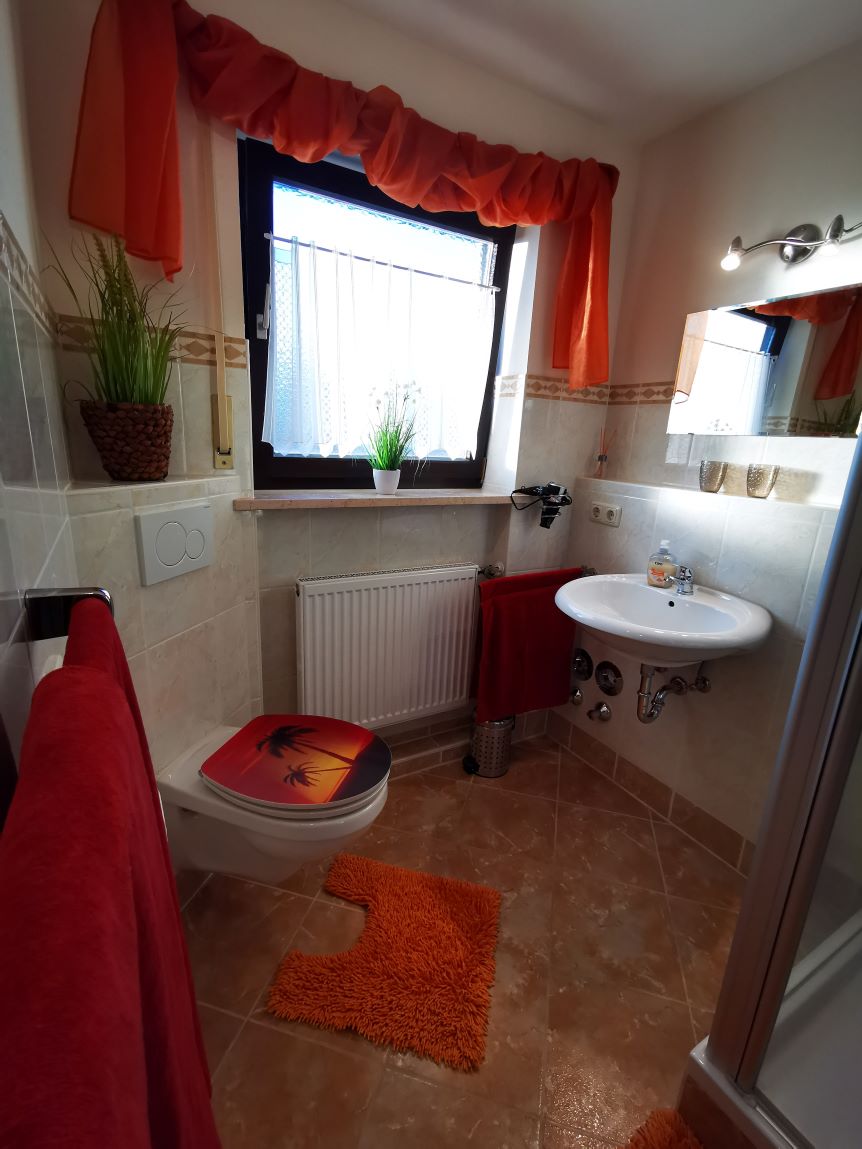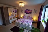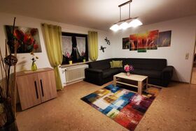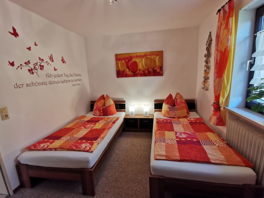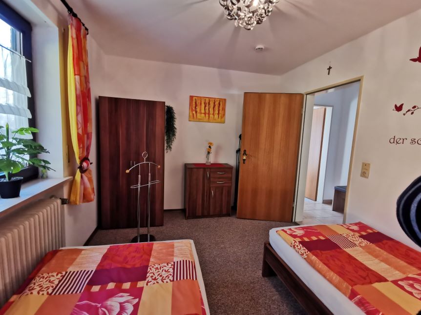 Die Ferienwohnung 2 befindet sich im 1. Stock und bietet ausreichend Platz für 4 Personen (ca. 85m²). Die Wohnung besitzt ein Schlafzimmer mit zwei Einzelbetten, die auch getrennt gestellt werden können. Einen großen Schrank, sowie einen Zugang auf den Balkon. Ein weiteres Schlafzimmer ist mit zwei Einzelbetten ausgestattet. Das große Wohnzimmer mit Balkon, TV und ausziehbarem Sofa lädt zum verweilen ein. Das Bad mit Dusche, WC und Waschbecken besitzt auch einen Föhn. WLAN ist kostenlos. Die gut ausgestattete Küche mit einer Mikrowelle, Kühlschrank mit Gefrierfach und Essecke lädt zum Kochen ein. Gegen ein kleines Entgelt kann auch die Waschmaschine und der Trockner mitbenutzt werden. Ein Stellplatz ist vorhanden.