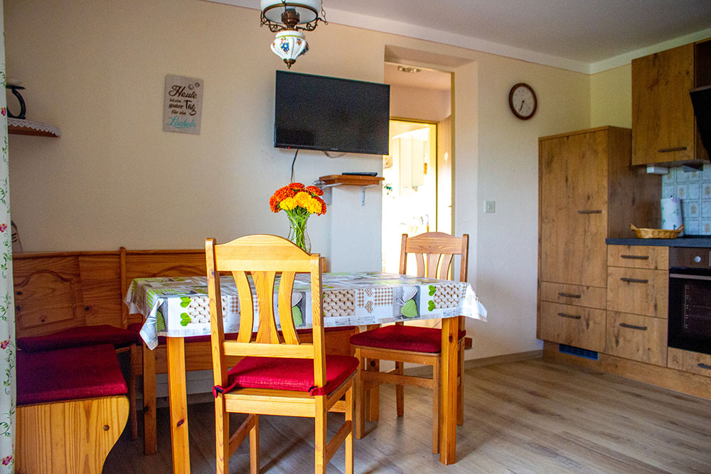 Unsere gemütlichen, kinderfreundlichen Ferienwohnungen sind im 1. Stock mit Balkon. Sie wurden nach DTV Richtlinien mit 3 Sternen ausgezeichnet, und bieten Platz für je 4 - 5 Personen. Jede Wohnung besteht aus Wohnküche mit Küchenzeile, Essecke, Sofa, TV-Sat-Anschluss und Balkon. Doppelbett- und Kinderzimmer sind liebevoll eingerichtet. Bei Bedarf kann ein Kinderbett dazu gestellt werden. Bettwäsche und Allergiker Betten sind selbstverständlich vorhanden. Im Bad mit WC liegen Hand- und Duschtücher und ein Fön für Sie bereit.