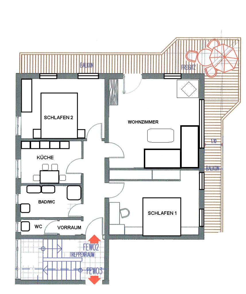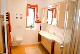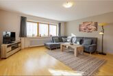 Die Nichtraucher Wohnung Nr. 2 (ca. 95 qm) befindet sich im Obergeschoß mit einem großem Ost-Südbalkon und verfügt über ein großes Wohnzimmer mit Couchgarnitur, Kabel-TV, Internetanschluss, Küche mit Backofen und Spülmaschine sowie Essplatz, zwei Schlafzimmer mit Doppelbetten, Badezimmer mit Doppelwaschbecken, Dusche und WC, zusätzliches WC, großer Ost- und Südbalkon