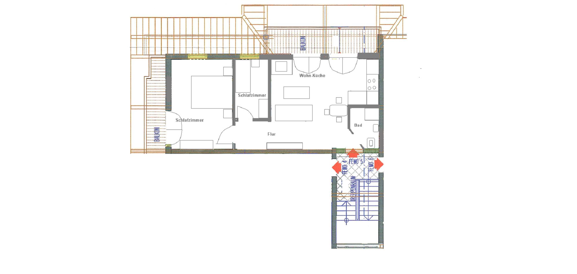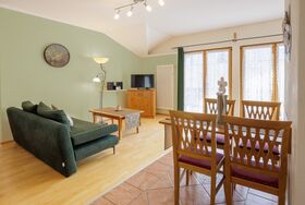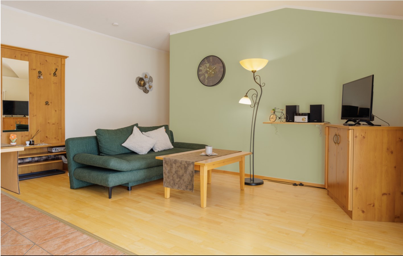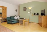 Nichtraucher-Wohnung. Wohnzimmer mit Couchgarnitur, Kabel-TV, Internetanschluss, Kochnische mit Backofen und Spülmaschine sowie Essplatz. Ein Schlafzimmer mit Doppelbetten und ein Schlafzimmer mit einem Bett. Badezimmer mit Dusche und WC. Ostbalkon und großer Südbalkon.