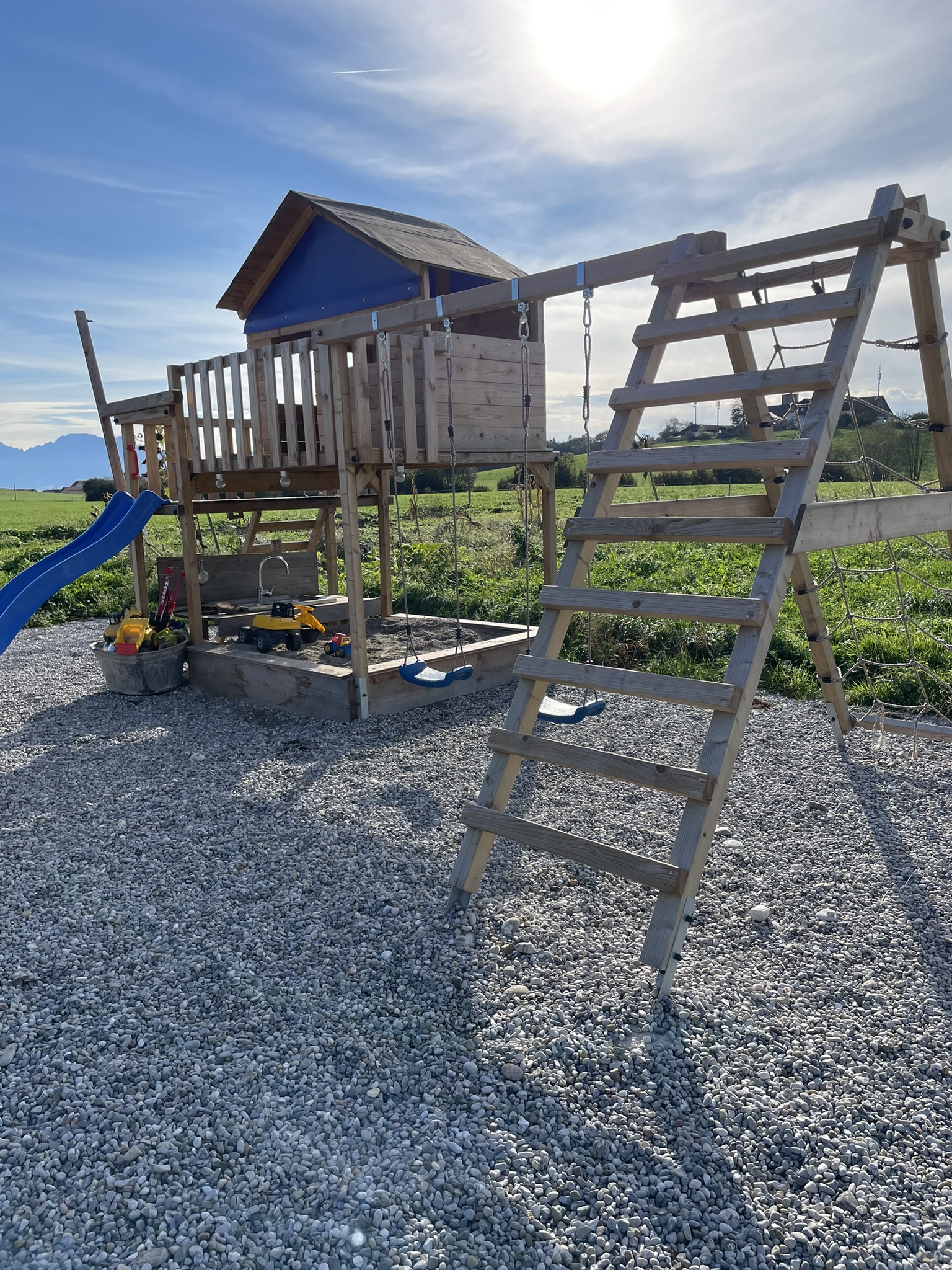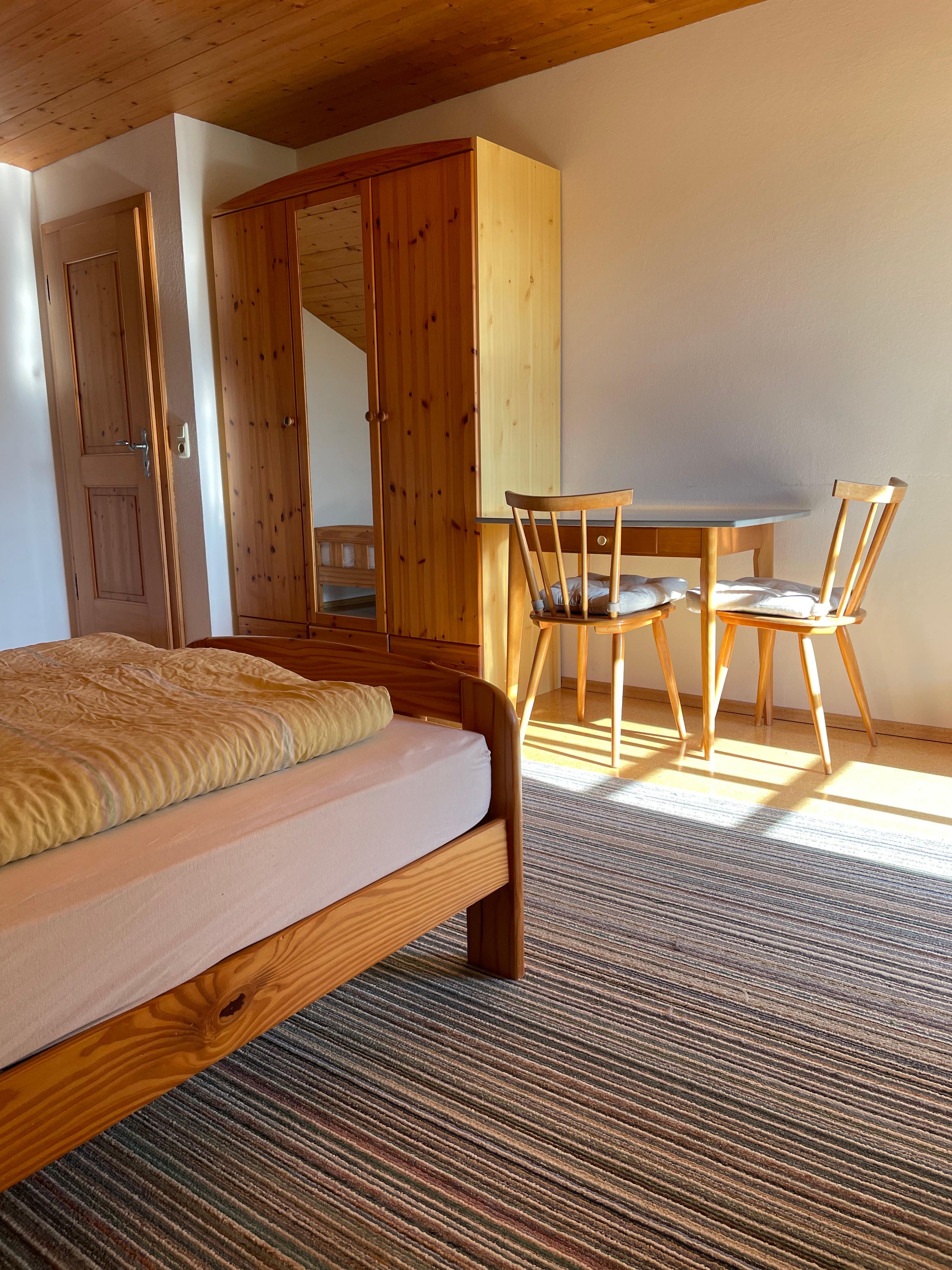 Es erwartet Sie eine sehr helle und freundliche Ferienwohnung 75 m2 mit eigenem Eingang und kostenlosen Parkplätzen vor dem Haus. Eine Wohnküche mit Sitzgruppe und TV, zwei Schlafzimmer mit einem Doppelbett und drei Einzelbetten. Beide Schlafzimmer haben einen Balkon mit herrlichen Ausblick in die Berge. Handtücher und Bettwäsche sind selbstverständlich vorhanden. Unser Badezimmer wurde im Winter 2022 erneuert mit WC und Dusche. Auch das WLAN haben wir mitte 2023 verbessert. Natürlich haben wir für die Kleinen vorgesorgt, es stehen Hochstuhl und Gitterbetten zur Verfügung.