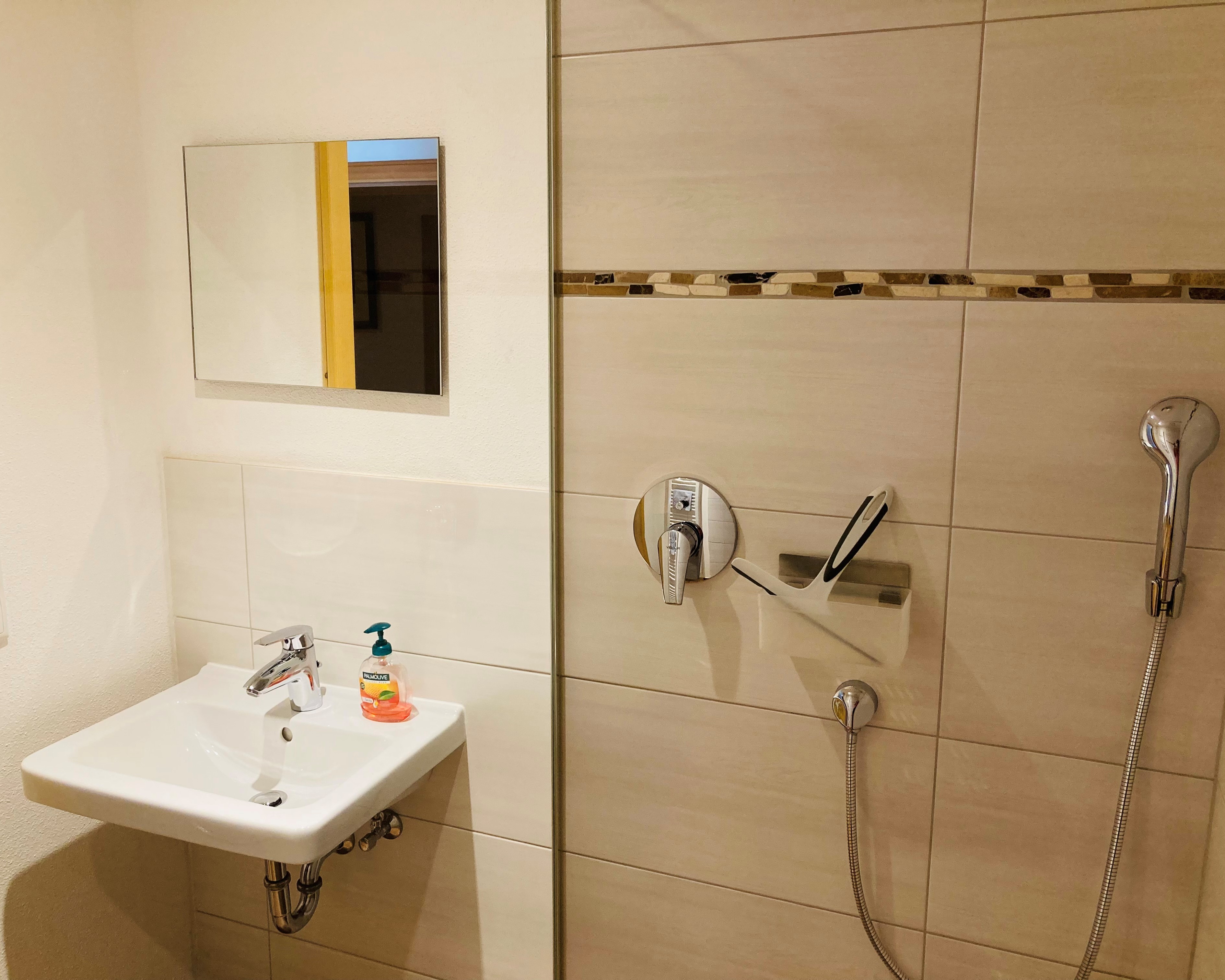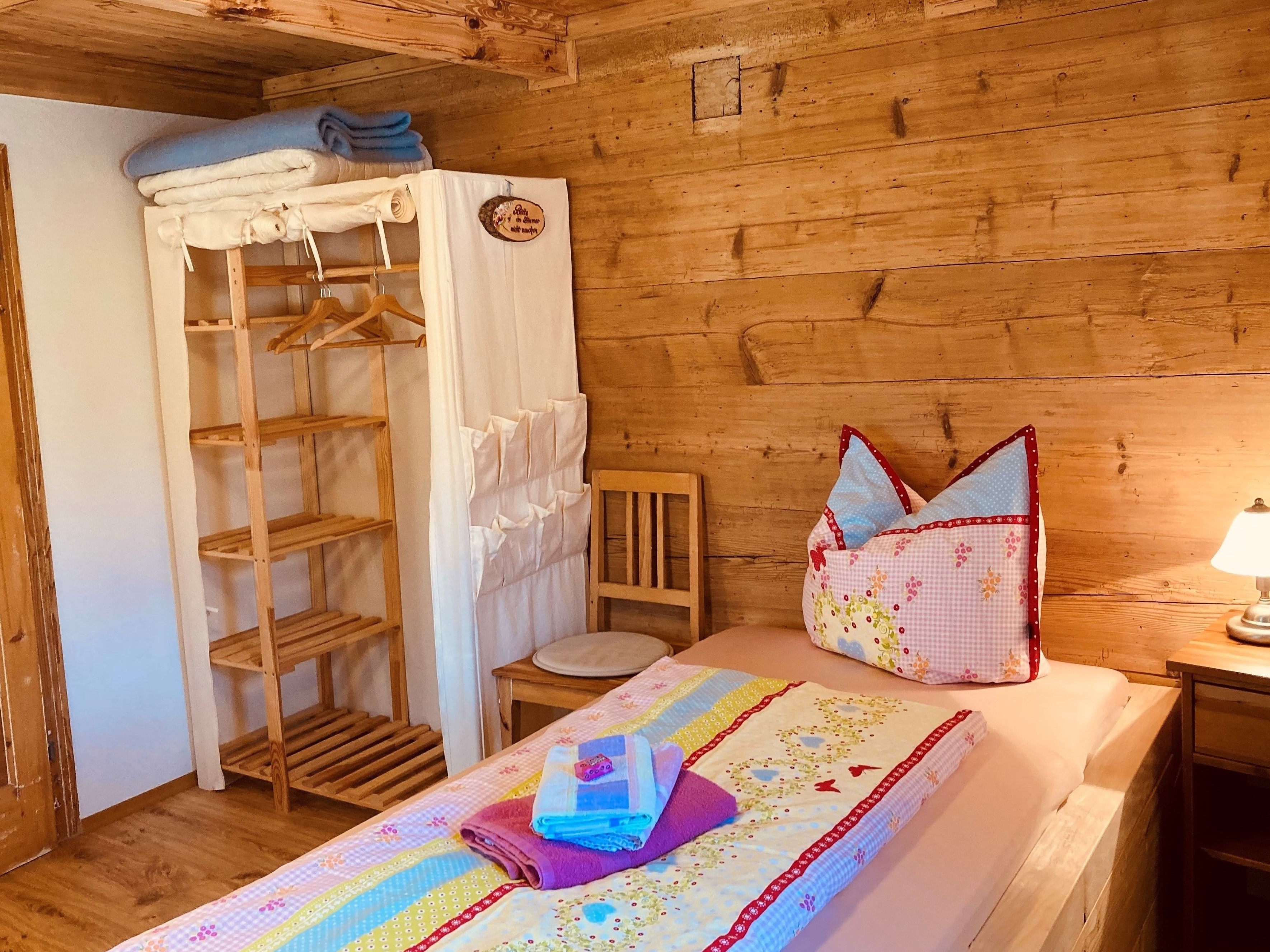 Einzelzimmer, 10m² mit Einzelbett. Etagen-Dusche und Etagen WC, Tisch mit Stühlen, Balkon indirekt begehbar, Bergblick, Gästeküche auf der Etage.
