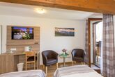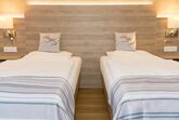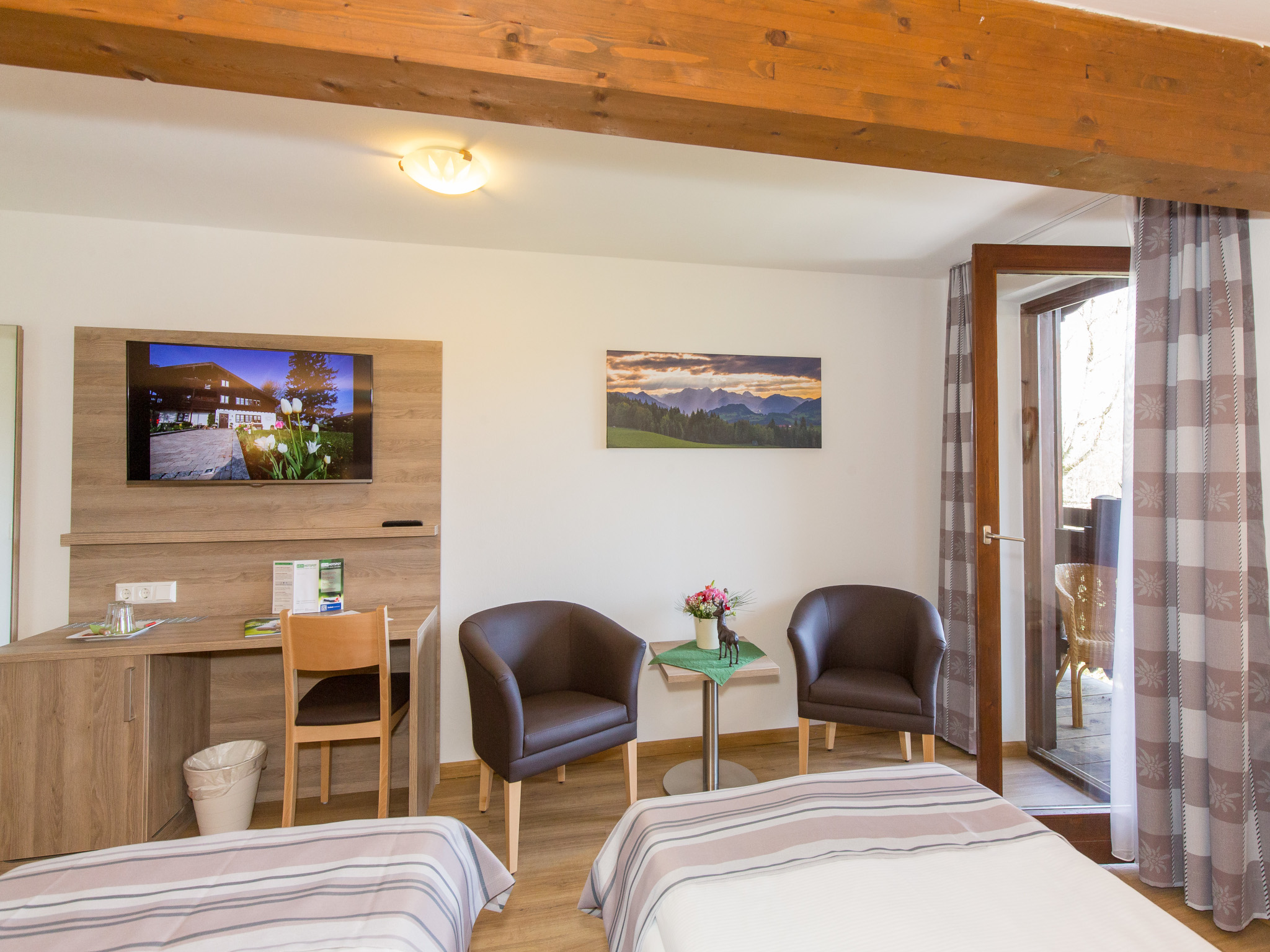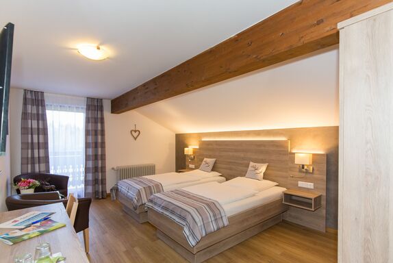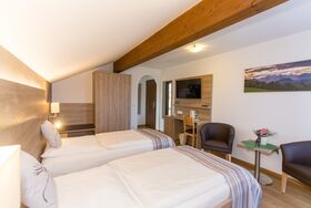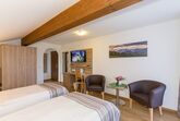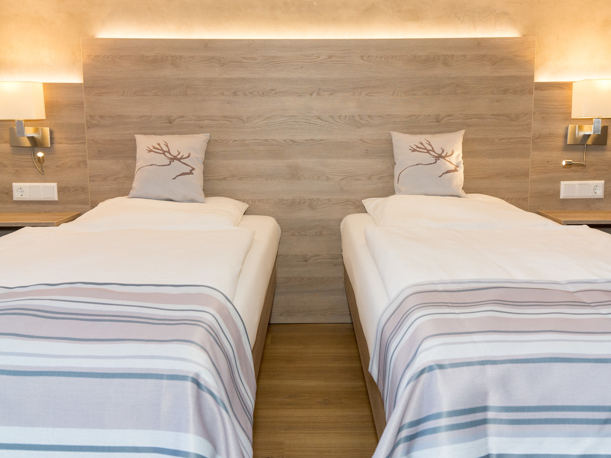 Hochwertig eingerichtete Zweibettzimmer, Nichtraucher, 21 qm im Dachgeschoss, mit Balkon inkl. Sitzgruppe, kleinem Vorraum für Garderobe, Kleiderschrank, 2 Betten jeweils 100cmx200cm, LED Leselampe am Bett, Verdunklungsvorhänge, schwenkbarer LED Flachbildschirm, kostenfreies W-Lan, 2 Sessel mit Tisch, sowie Schreibtisch mit Stuhl und separater Led-Beleuchtung, Kofferablage, Kopfkissen und Bettdecken für Allergiker geeignet, Minibar. Badausstattung: Fön, Kosmetikspiegel, Klarglas Duschwand, Handtuchtrockner, Hygienebeutel, Kosmetiktücher, Seife, Duschlotion.