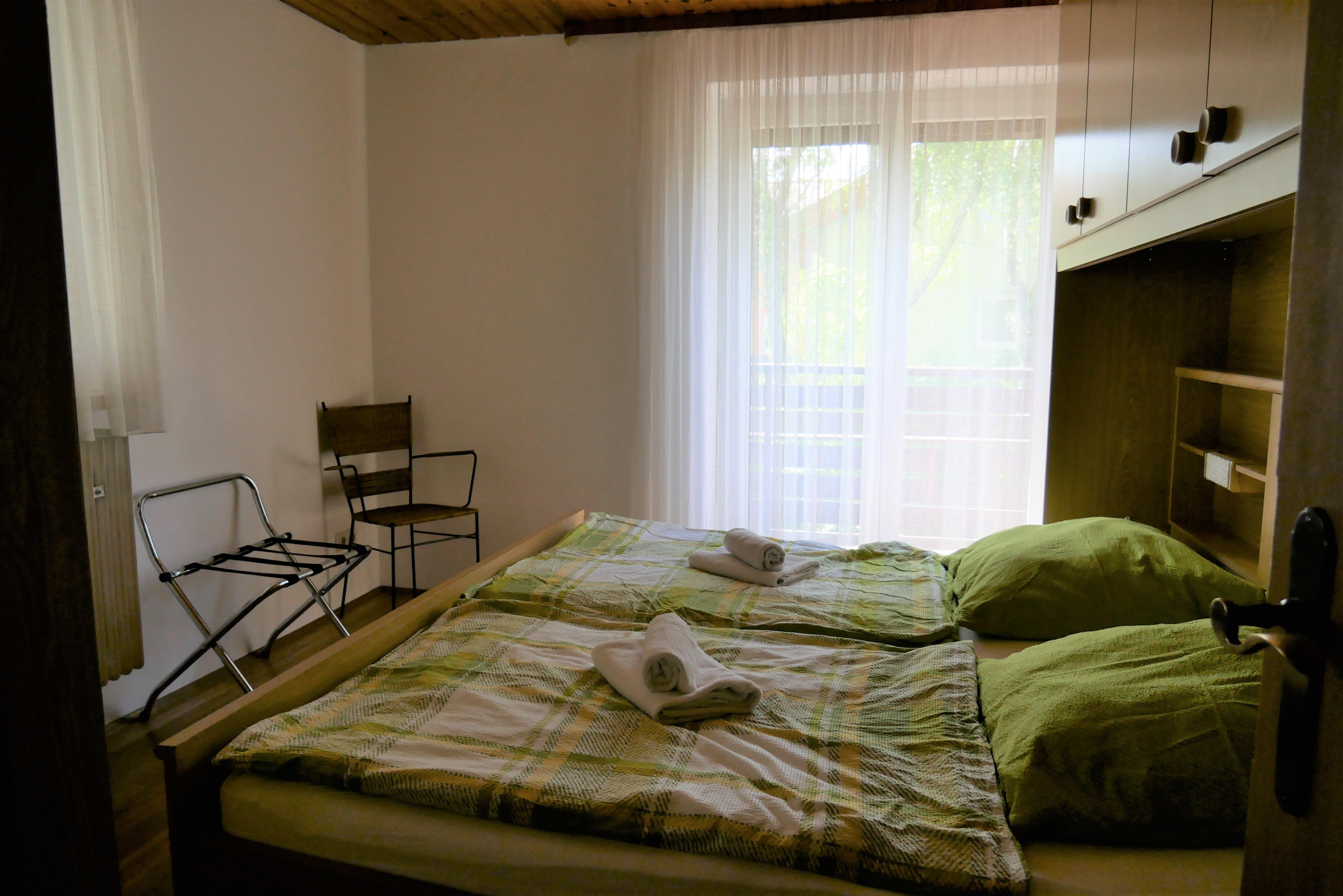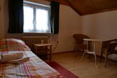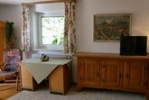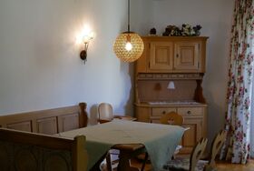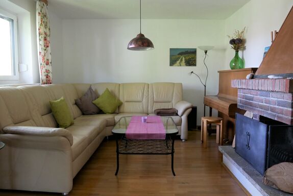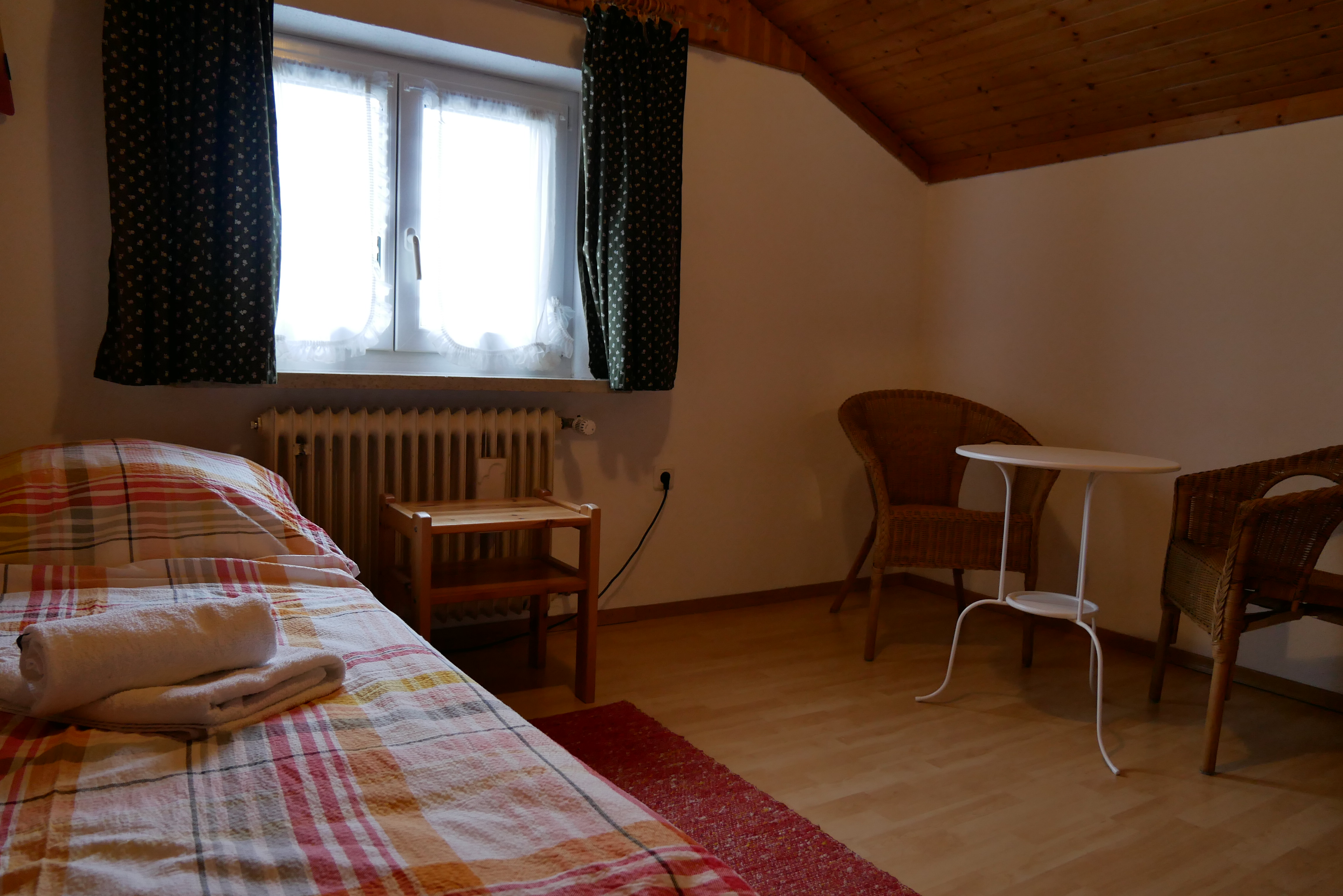 Rustikal eingerichtete Ferienwohnung im 1. Stock eines Zweifamilienhauses : Separates Schlafzimmer mit Doppelbett und großem Kleiderschrank; sehr geräumiges Wohnzimmer mit Eckbank, Sitzgruppe, offenem Kamin , Sat-TV, Radio; separate Küche mit Backofen, Geschirrspüler, Toaster, Kaffeemaschine, Wasserkocher, Mikrowelle; Bad/WC; grosser überdachter Balkon nach Osten/Süden. Zweites separates Schlafzimmer mit Doppelbettcouch in der Mansarde (hier zusätzlich kleines Waschbecken, separates WC und eigener TV-Anschluss). Die 6. Person darf nur ein Kind mit dem Höchstalter von ca. 3 Jahren sein, da nur ein Kinderreisebett vorhanden ist.