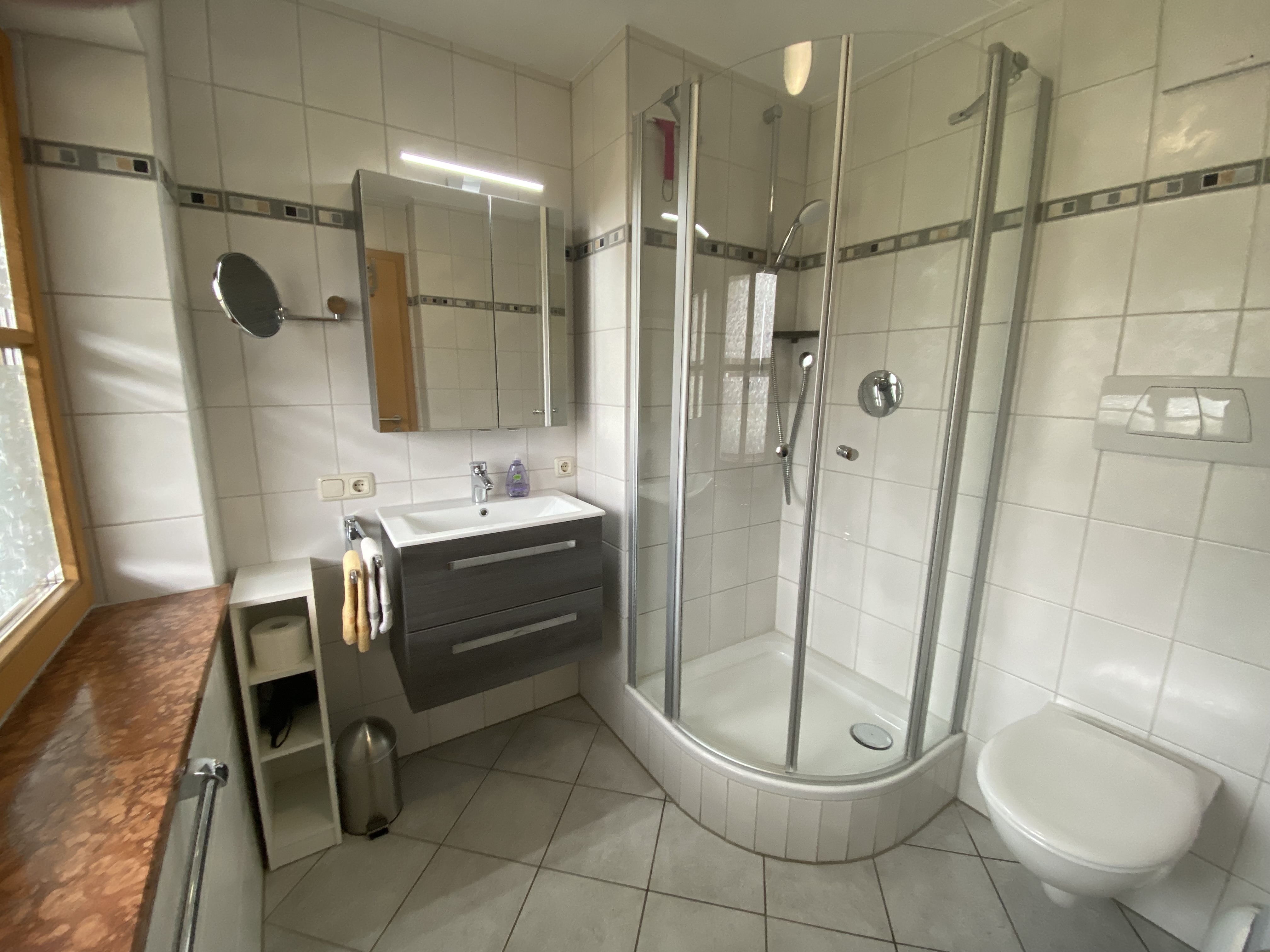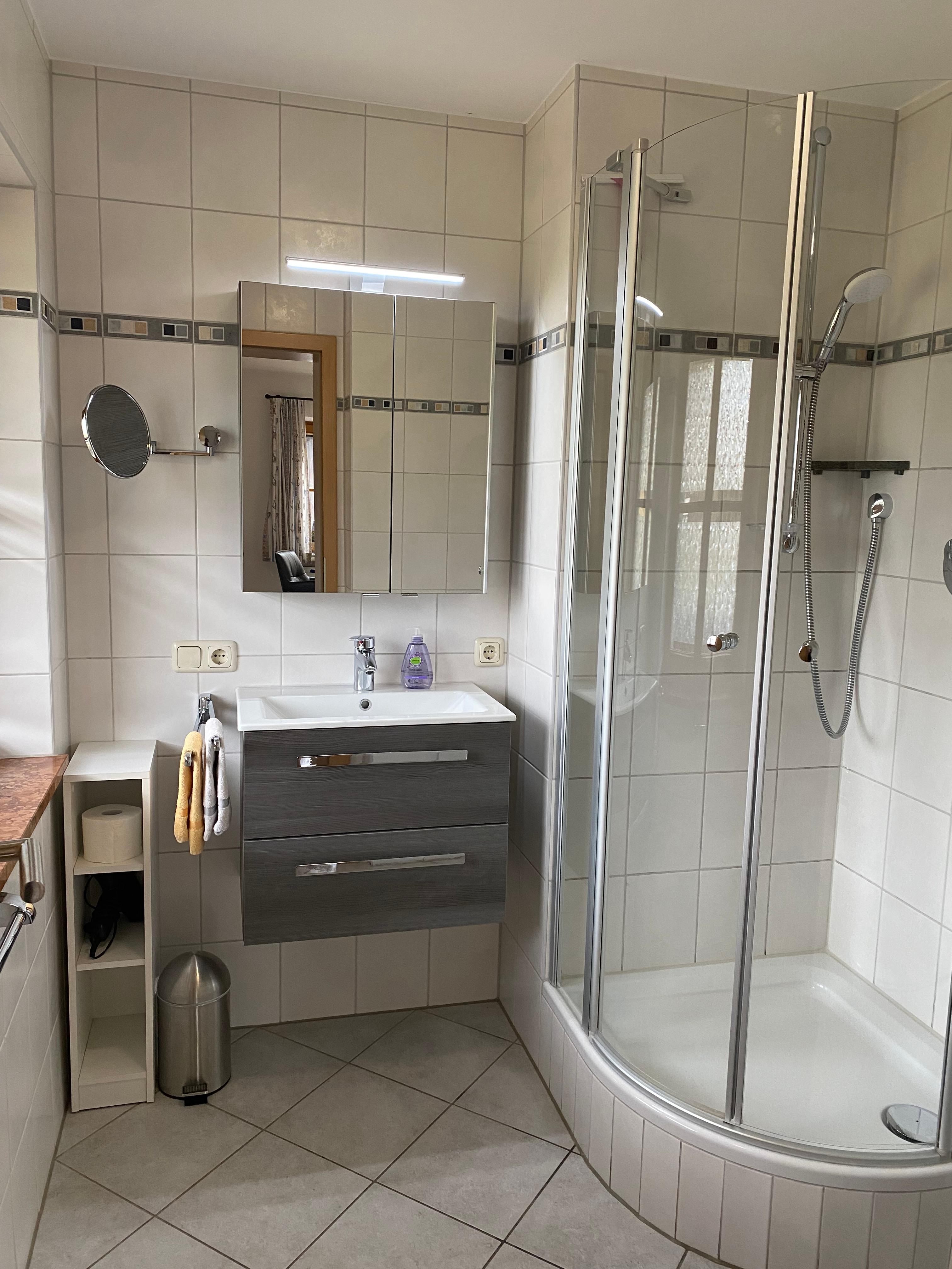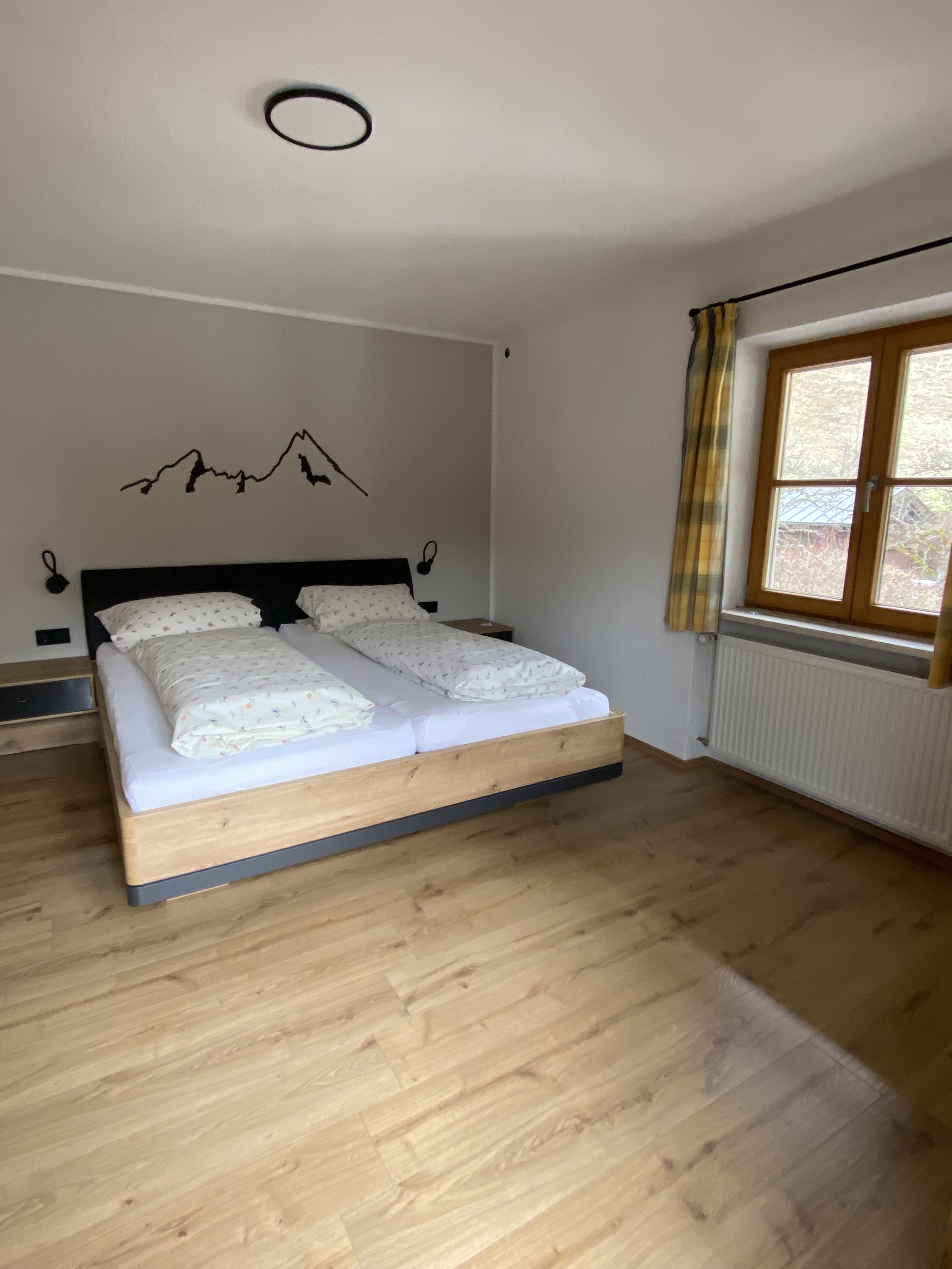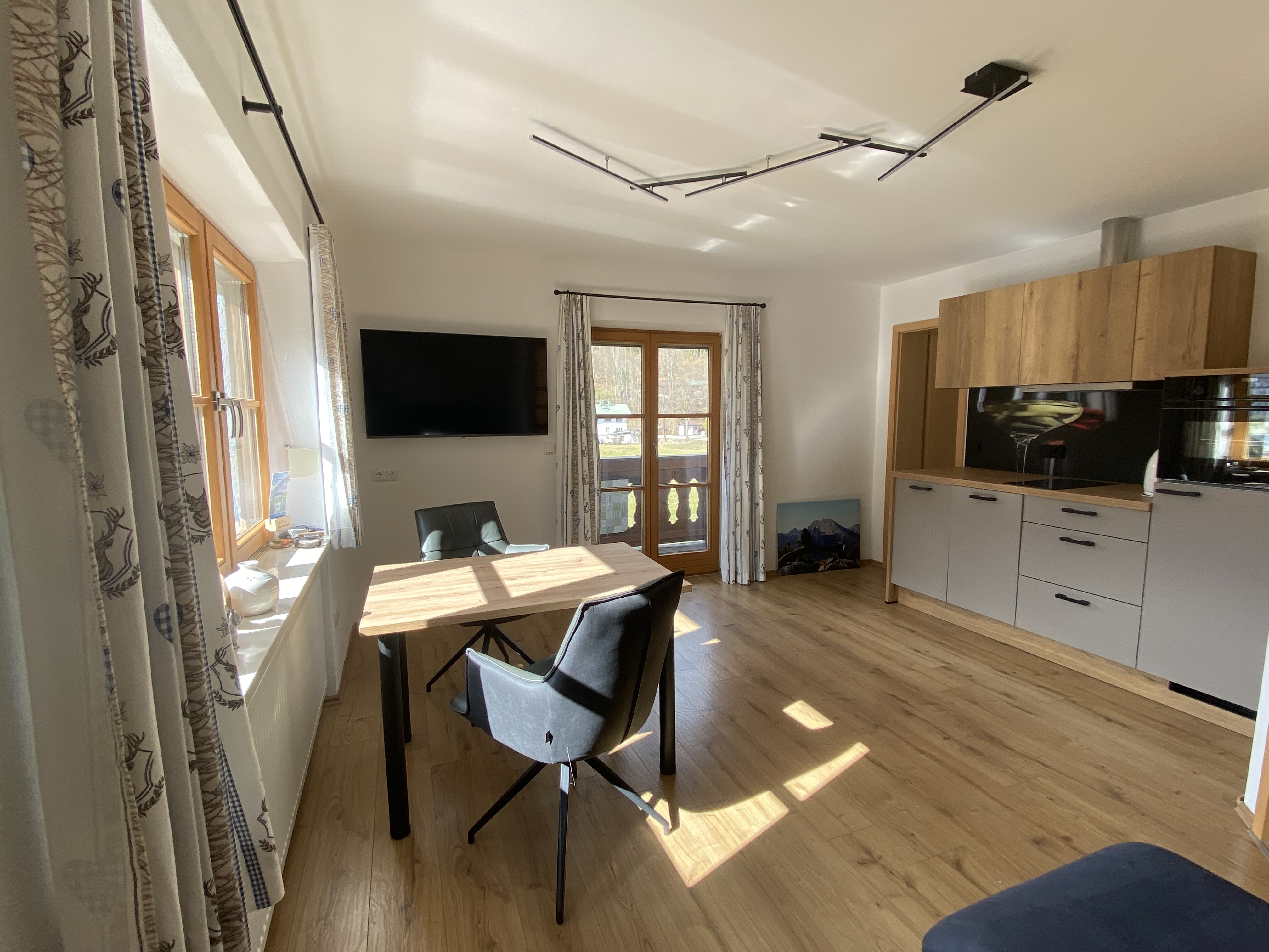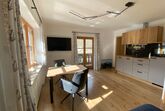 Die Nichtraucher-Ferienwohnung bietet eine Wohnfläche von ca. 43 qm und befindet sich im oberen Stock des Gästehauses. Sie ist ausgestattet mit einem separaten Schlafzimmer, einer gemütlich eingerichteten Wohnküche mit Sitzecke, Essecke, voll ausgestatteter Küchenzeile und einem Badezimmer mit Dusche und WC. Von Ihrem Südwest Balkon genießen Sie einen einzigartigen Blick auf den Watzmann.
