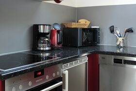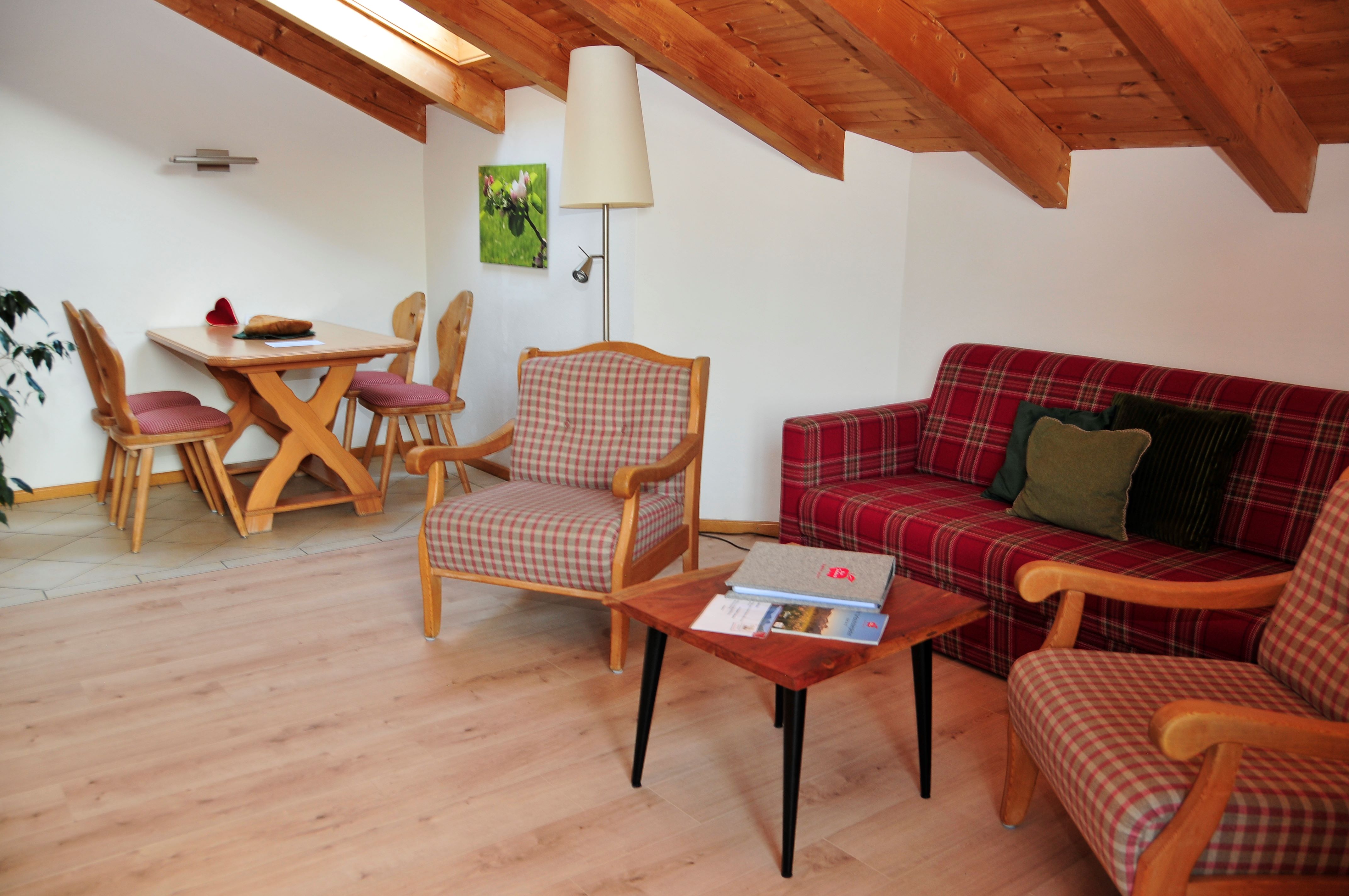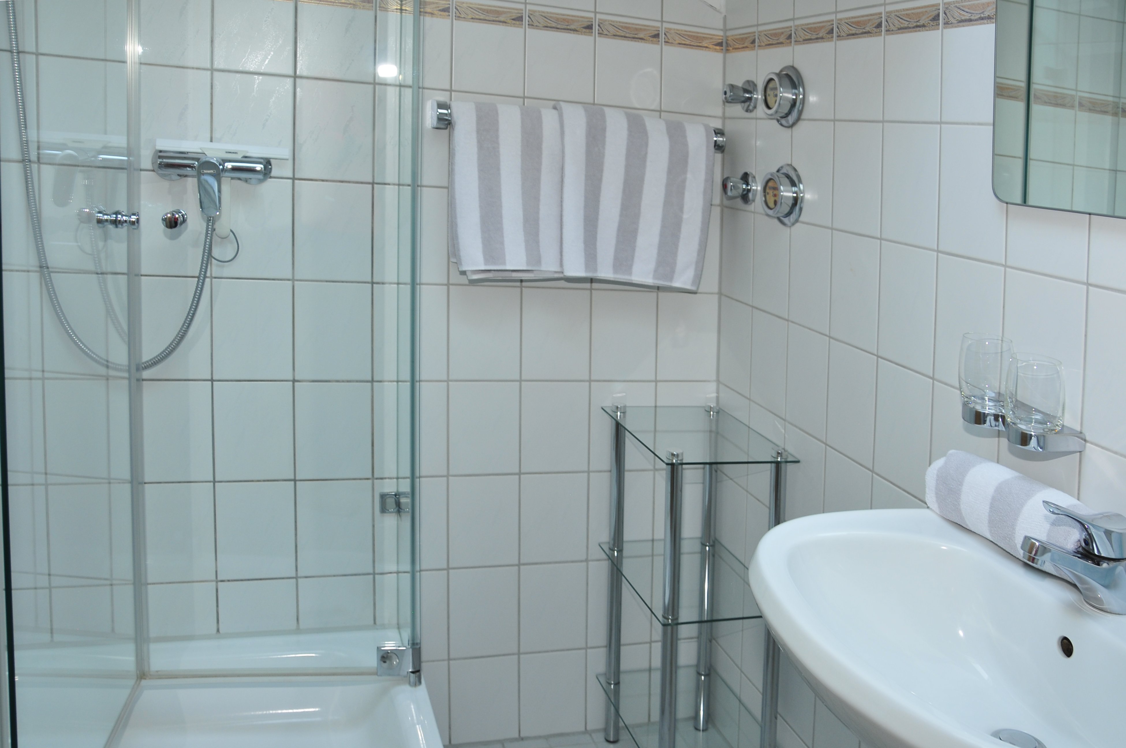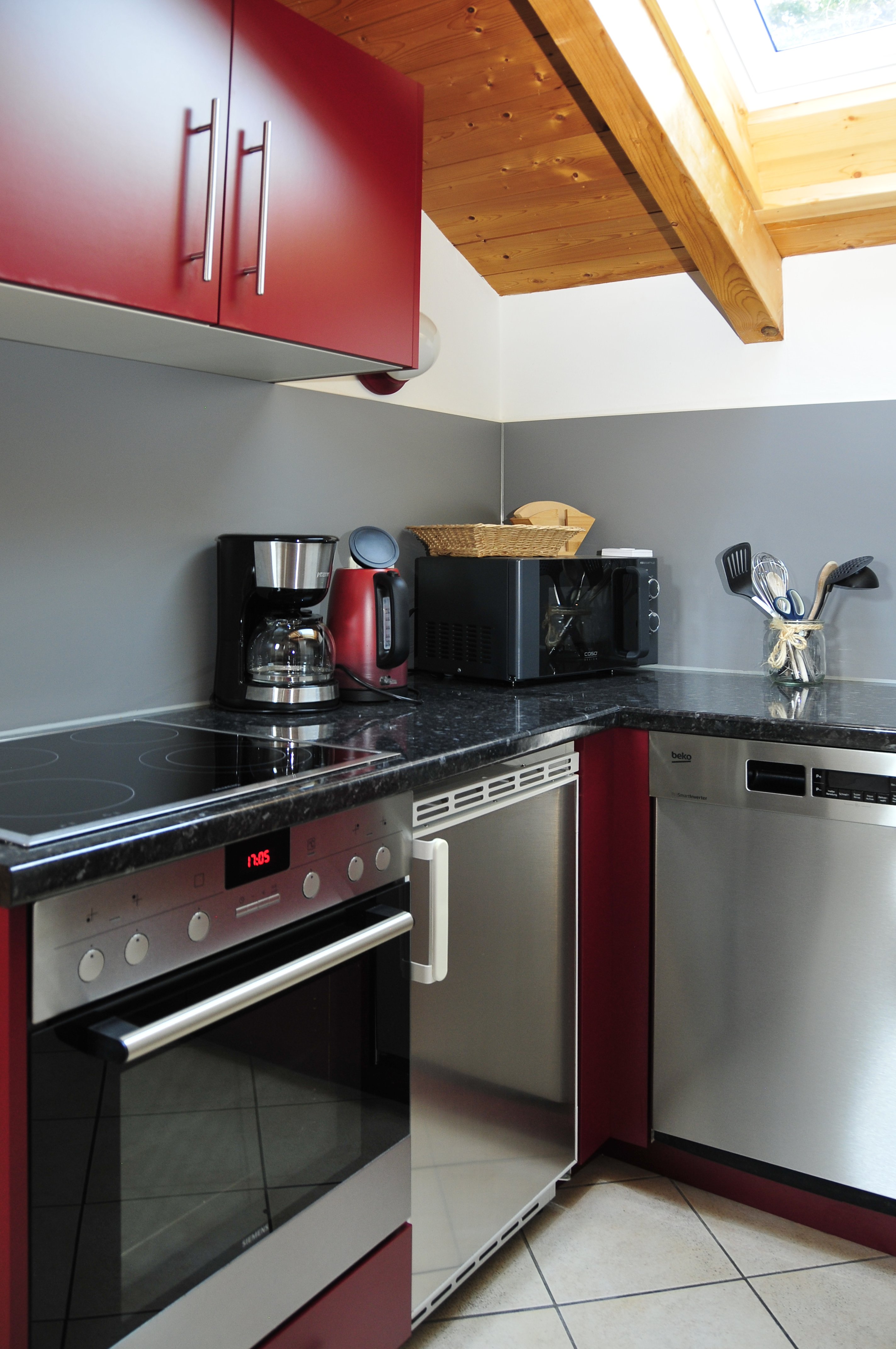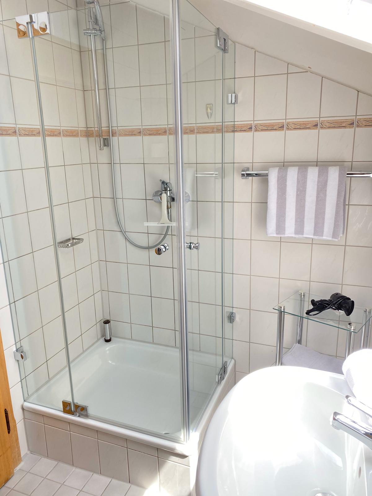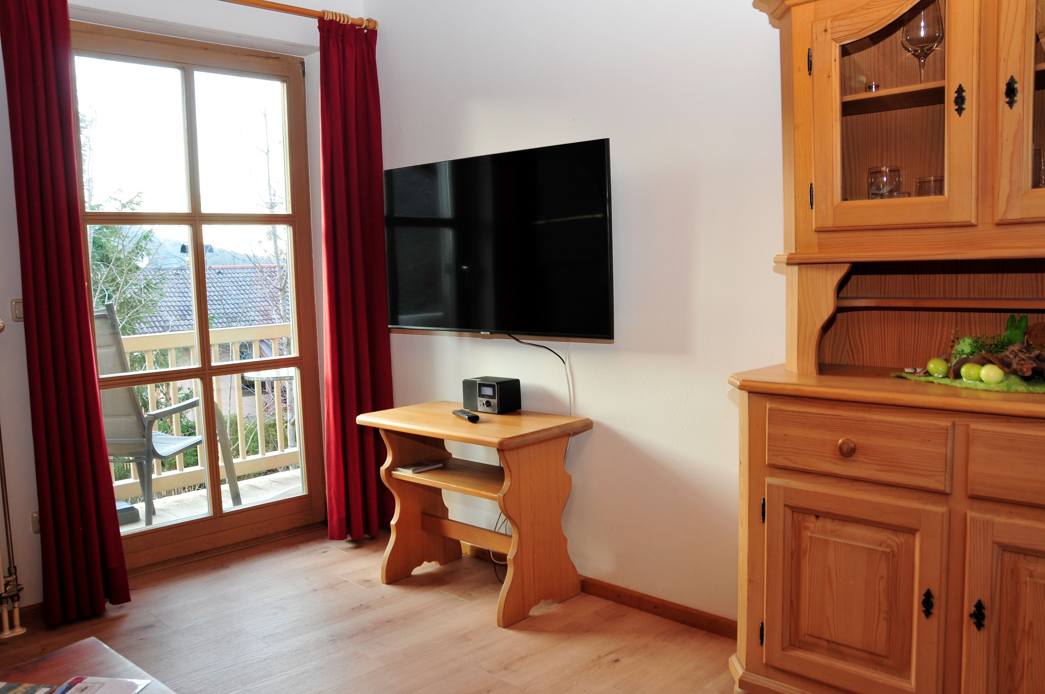 2-4 Personen, 50m², Dachgeschoss, Wohnzimmer mit Couchgarnitur, Fernseher, Radio mit Bluetooth, W-LAN kostenlos, Küche in der Diele, Spülmaschine, Backofen, Mikrowelle, Kaffeemaschine, Wasserkocher, Toaster, Geschirr für 4 Personen, Schlafzimmer mit Doppelbett, Bettcouch im Wohnzimmer für 2 Personen geeignet, Dusche mit WC, Föhn, Westbalkon mit Blick auf den nahegelegenen Aubach sowie einem Tisch und 2 Stühlen.
