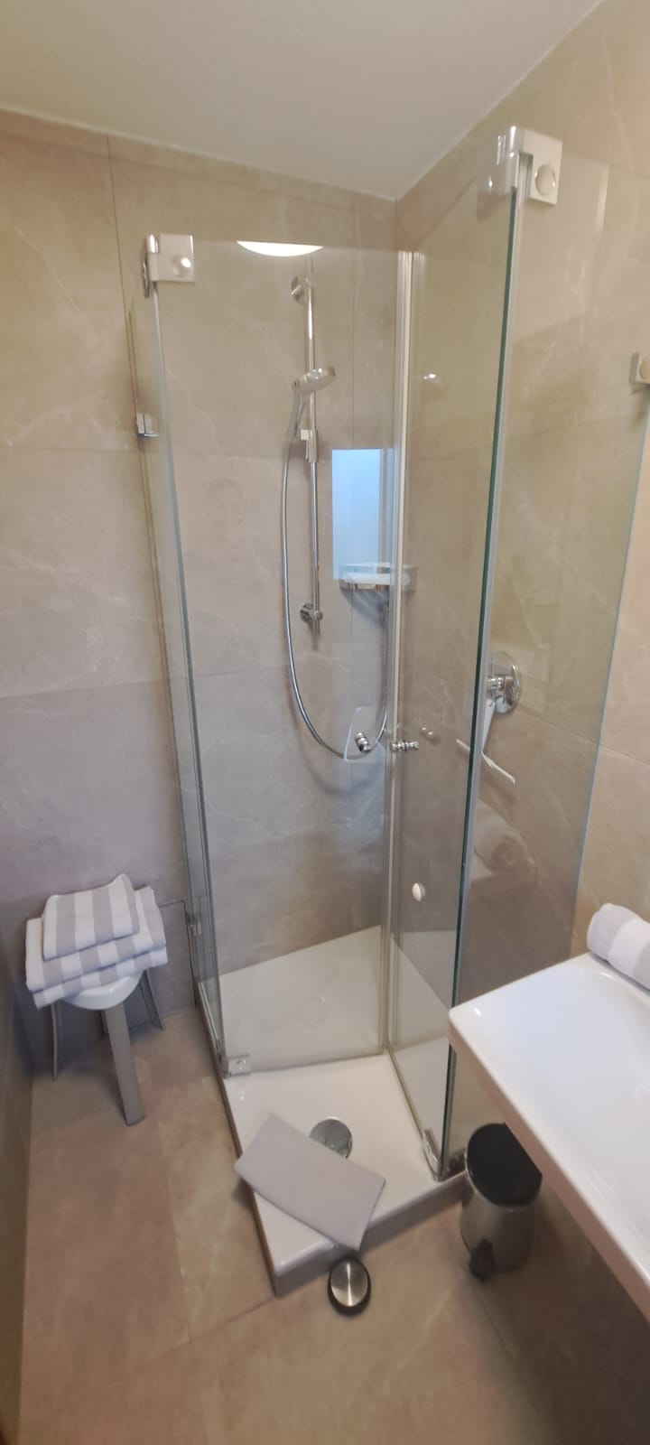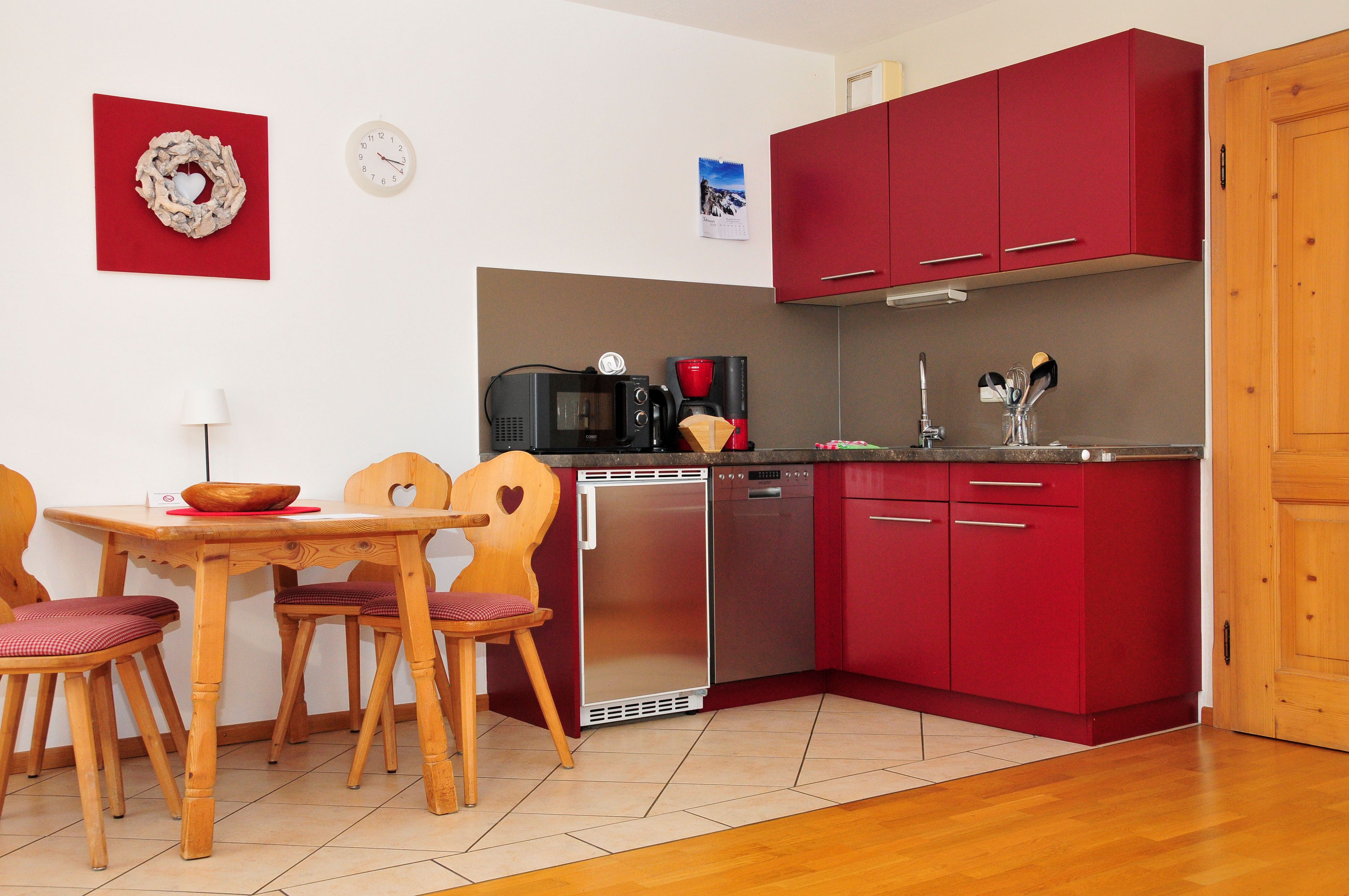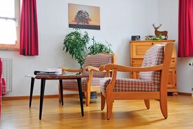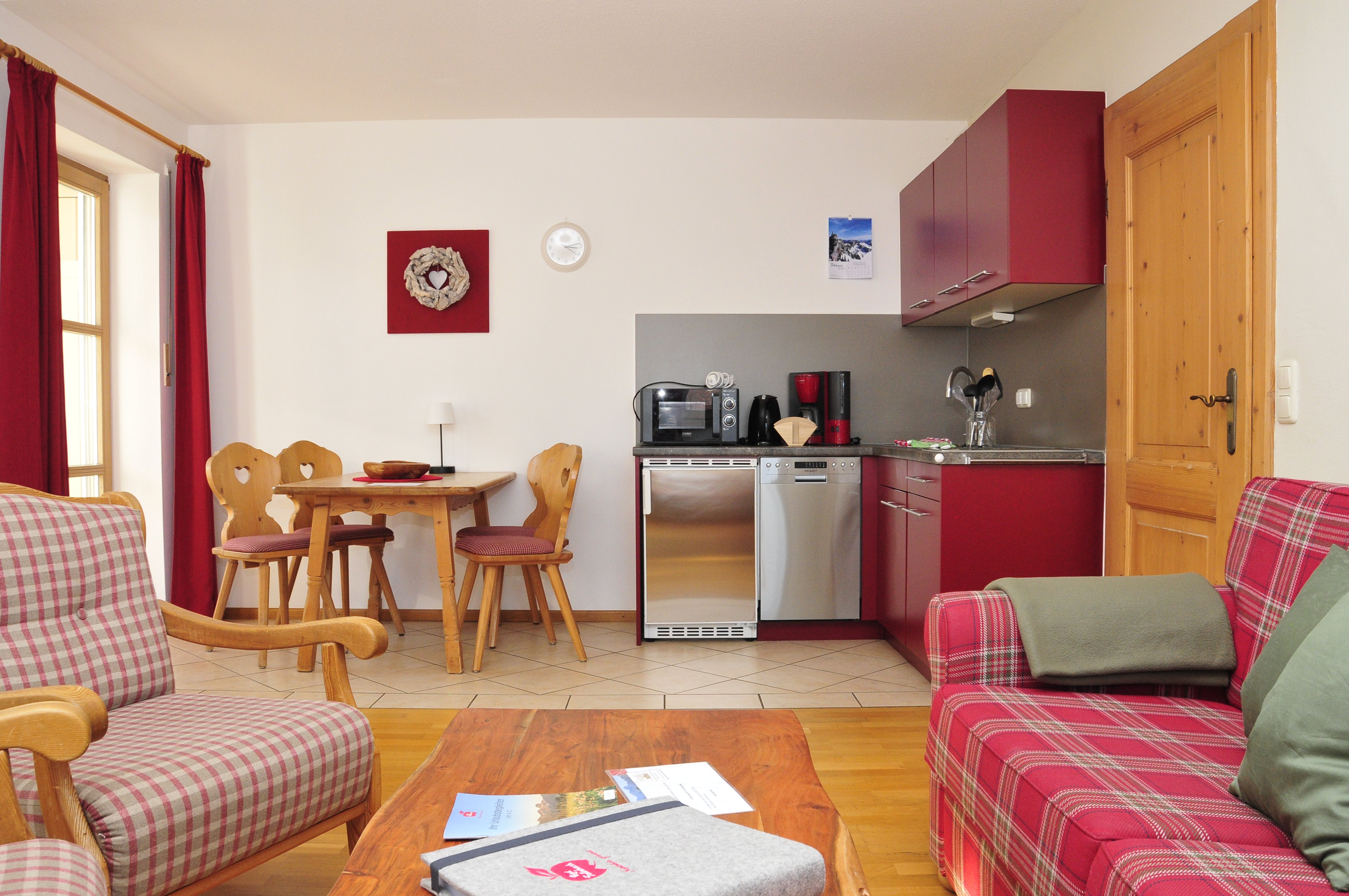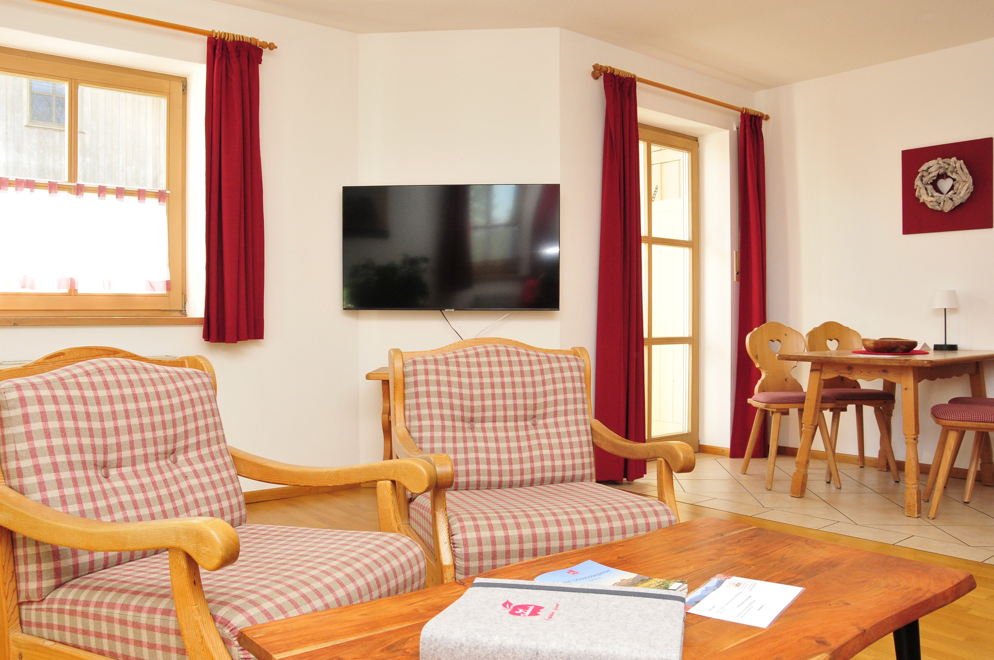2-4 Personen, 46m², 1. Stock nach Süden gelegen. Großer Wohnraum mit Couchgarnitur, Fernseher, Radio mit Bluetooth, W-LAN kostenlos, integrierte Küche mit Essplatz, Mikrowelle, Kaffeemaschine, Wasserkocher, Toaster, Geschirr für 4 Personen, Doppelschlafzimmer, Bettcouch im Wohnzimmer für 2 Personen geeignet, Dusche mit WC, Föhn, Flur, Südbalkon mit Tisch und 2 Stühlen.