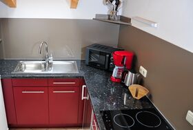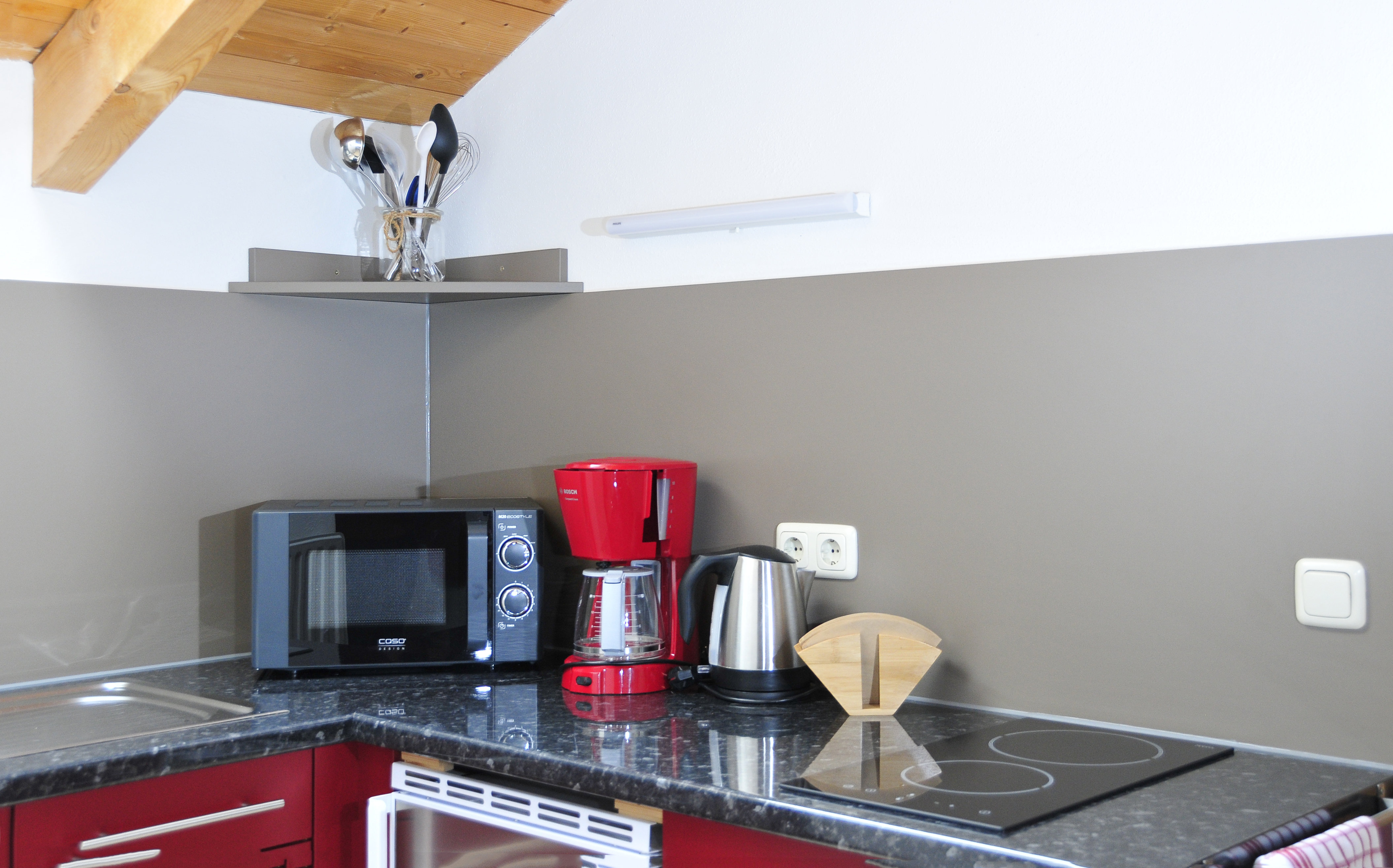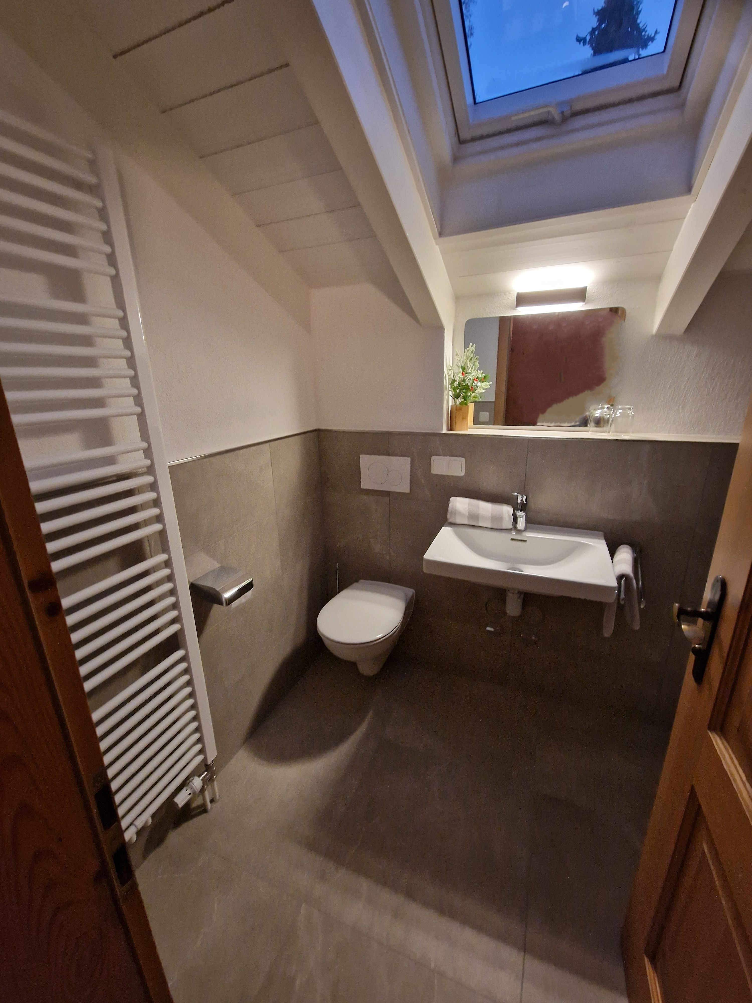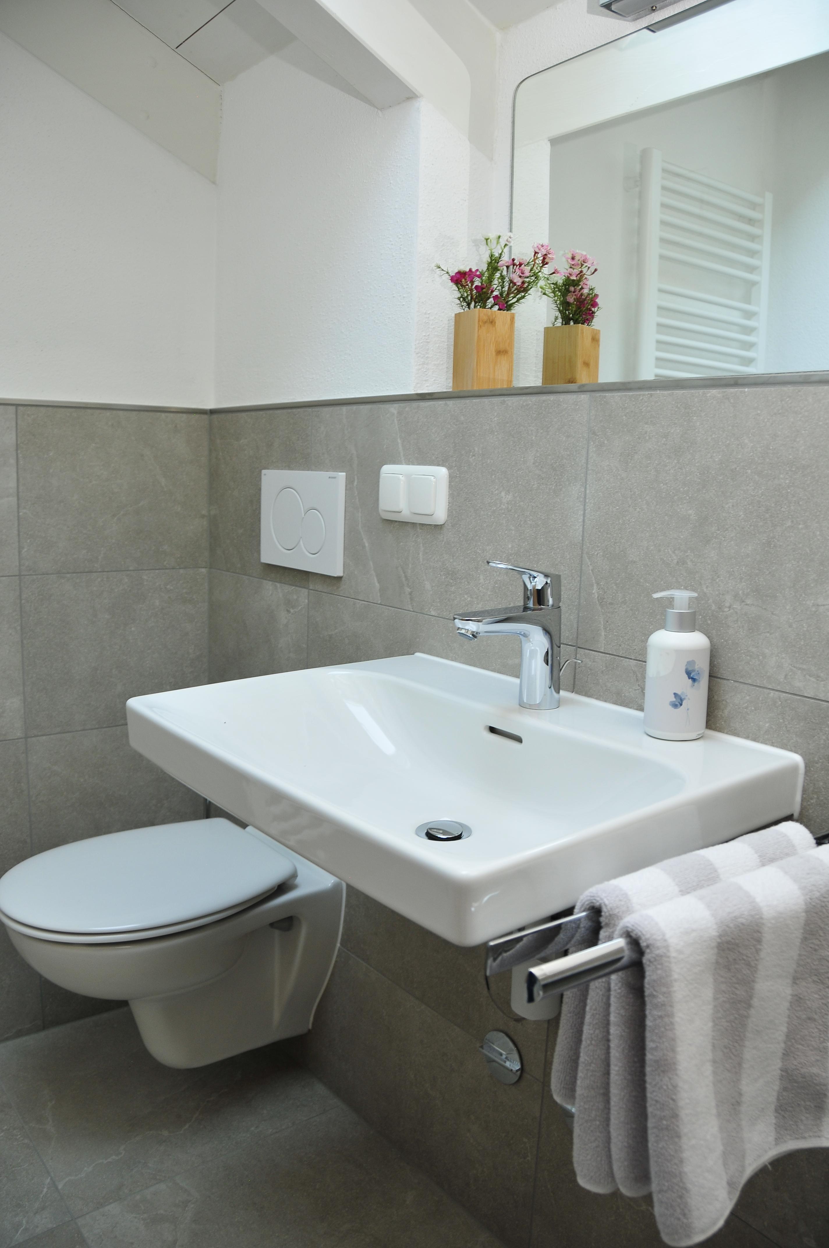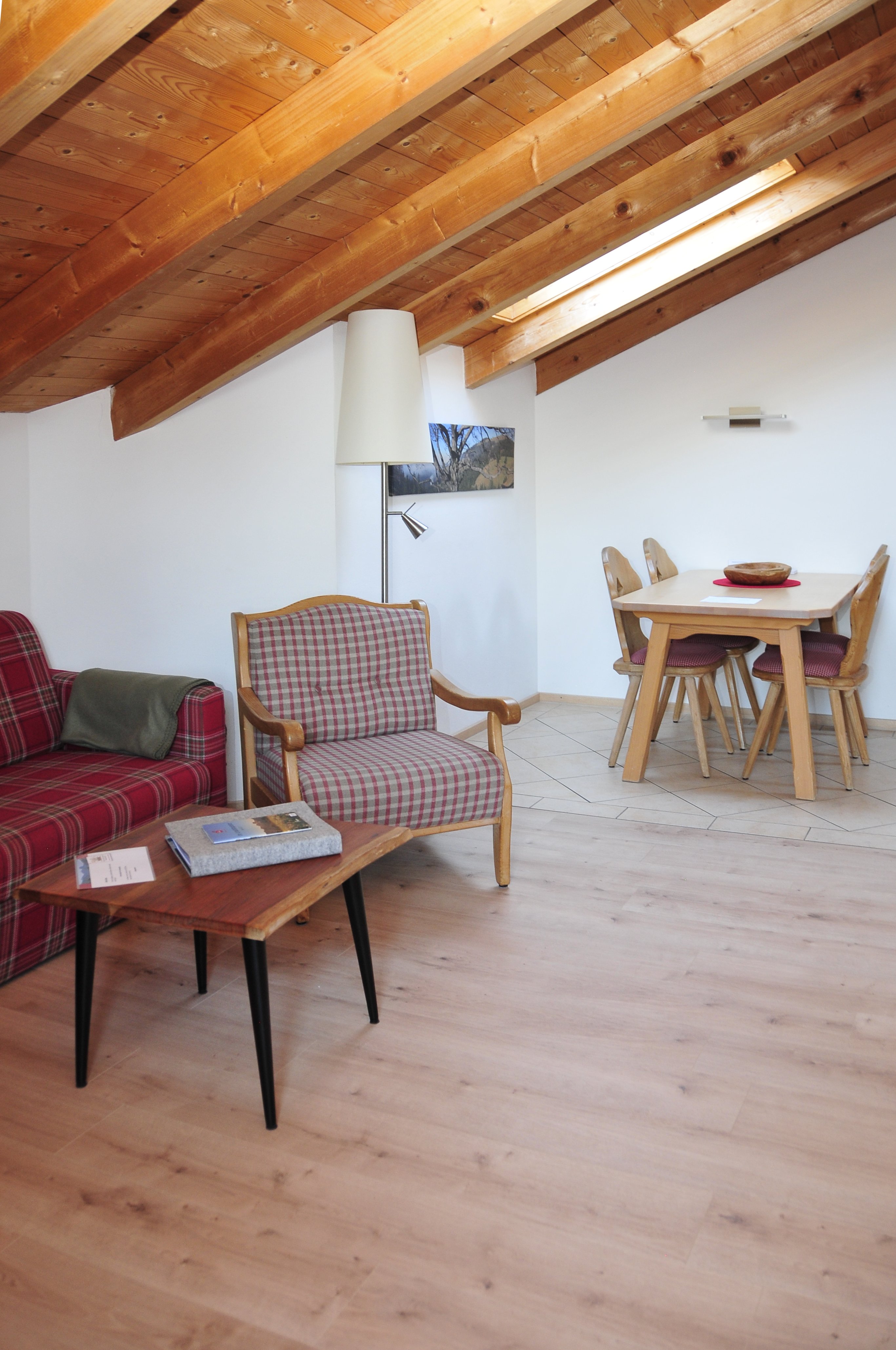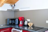 2-4 Personen, 50m², Dachgeschoss, Wohnzimmer mit Couchgarnitur, Fernseher, Radio mit Bluetooth, W-LAN kostenlos, Küche in der Diele, Mikrowelle, Kaffeemaschine, Wasserkocher, Toaster, Geschirr für 4 Personen, Schlafzimmer mit Doppelbett, Bettcouch im Wohnzimmer für 2 Personen geeignet, Dusche mit WC, Föhn, Ostbalkon mit Blickrichtung Hochsalwand und Heuberg, sowie einem Tisch und 2 Stühlen.
