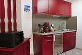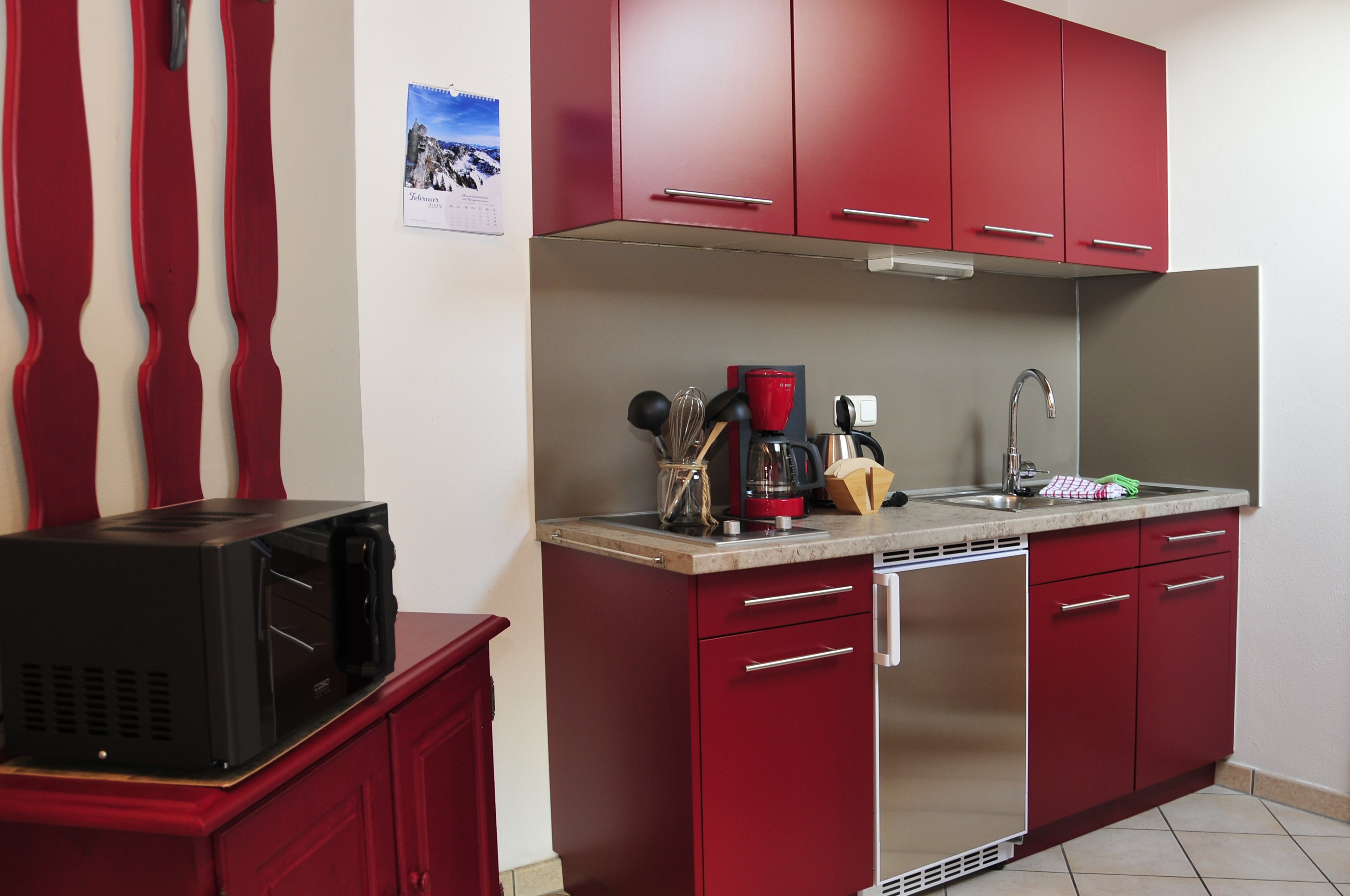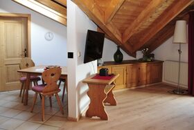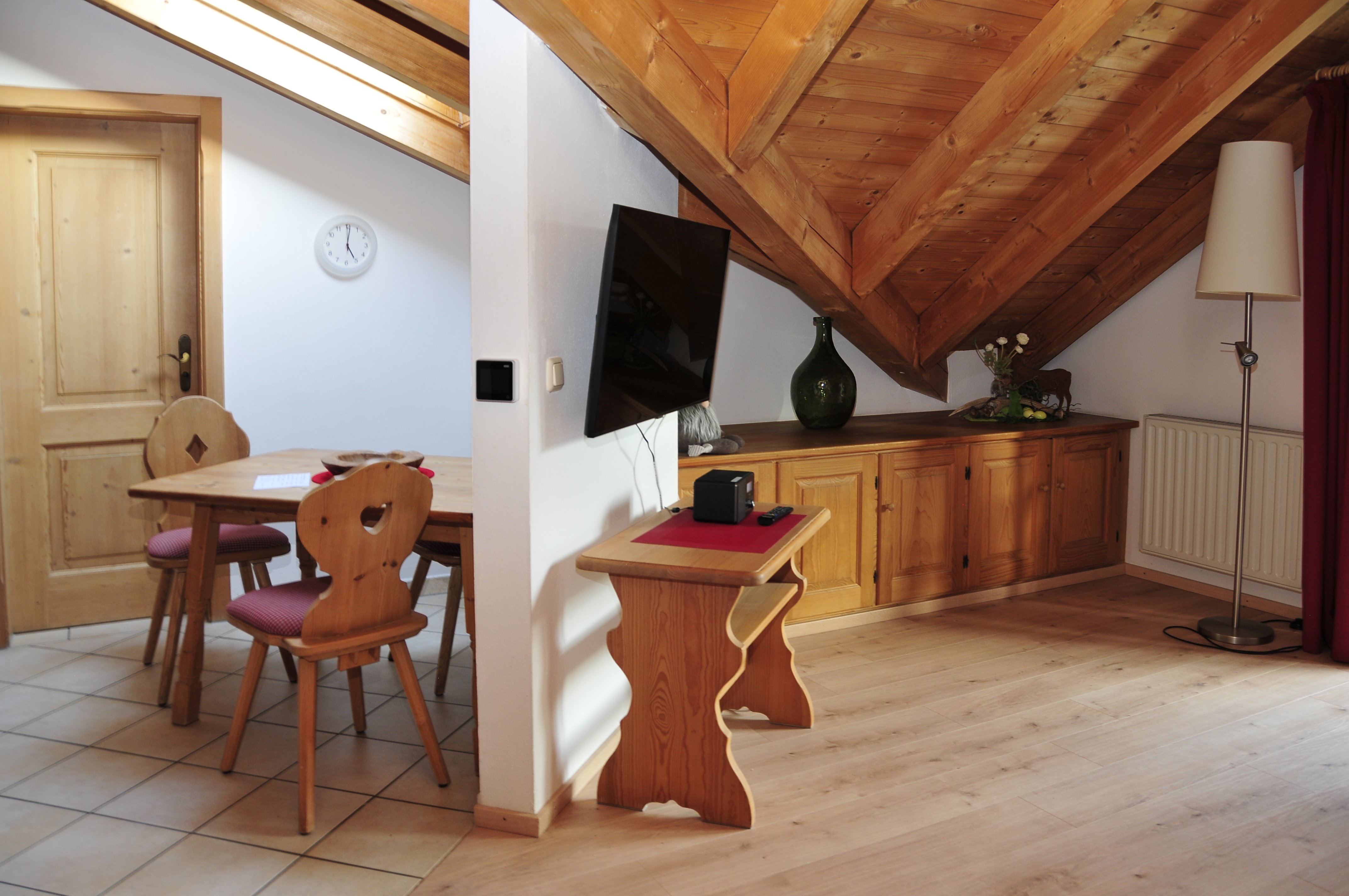 Ferienwohnung für 2 bis 4 Personen. 41 m². 2. Stock, Studio, nach Süden gelegen. Wohnraum mit Couchgarnitur, Fernseher, Radio mit Bluetooth, W-LAN kostenlos, Küche mit Essplatz, Mikrowelle, Kaffeemaschine, Wasserkocher, Toaster, Geschirr für 4 Personen, Doppelschlafzimmer, Bettcouch im Wohnzimmer für 2 Personen geeignet, Dusche mit WC, Föhn, Flur, Großer Südbalkon mit Tisch und 2 Stühlen.