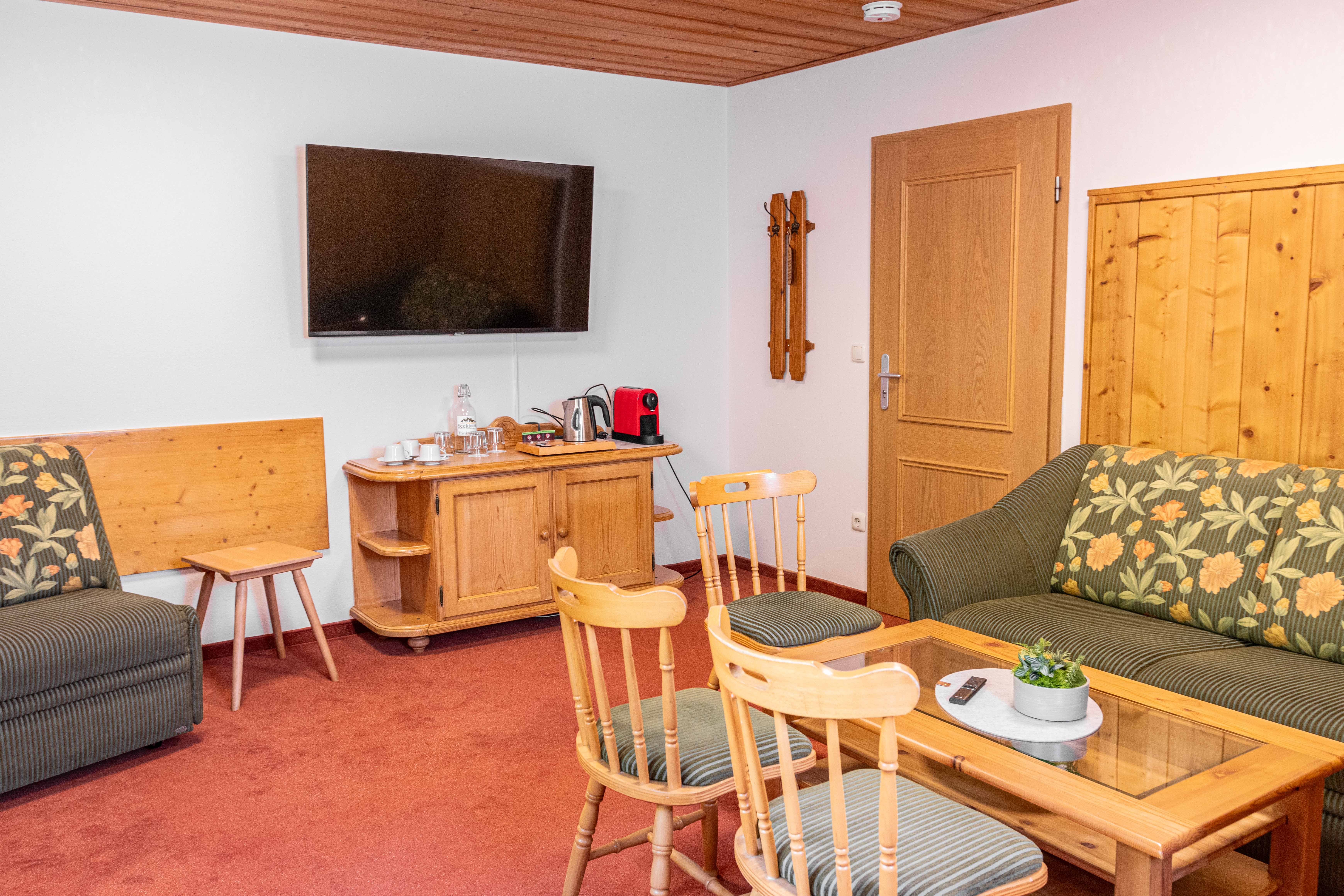 Unsere Familienzimmer liegt auf der Gebäude-Rückseite und hat den Blick auf die Reiteralpe. Dieses geräumiges Zimmer besteht aus 2 Räume, so dass die Familien Ihre Urlaub gemütlich verbringen können. Außerdem verfügt das Zimmer über einen kleinen Kühlschrank, kostenloses WLAN, einen Flachbildfernseher sowei Möglichkeiten zur Kaffee und Teezubereitung. Verbringen Sie wunderbare Urlaubstage in Ramsau am Hintersee und beginnen Sie den Tag mit einem reichhaltigen Frühstücksbuffet.