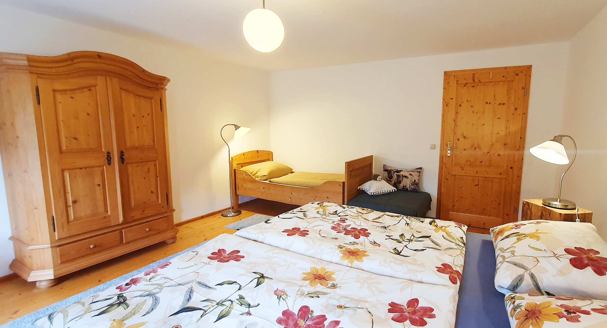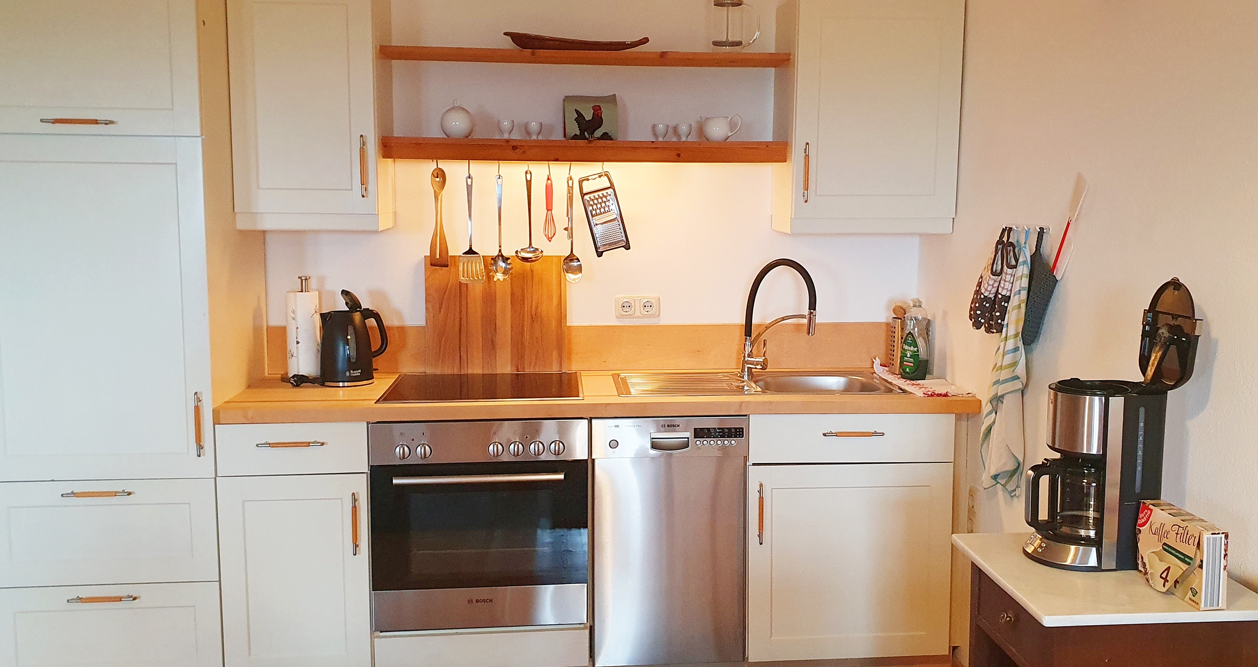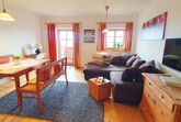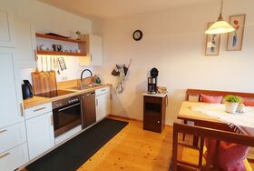 Ferienwohnung im 1. Obergeschoß mit großem komfortablem Wohn/Schlafraum, Küchenzeile mit Spülmaschine, 1 großes Schlafzimmer mit Doppel- und Einzelbett, zusätzliches Kinderbett möglich, Bad mit Wanne DU/WC und Fußbodenheizung, Sat-TV, seperater Eingang, Balkon mit Balkonmöbel, Nichtraucher. W-LAN