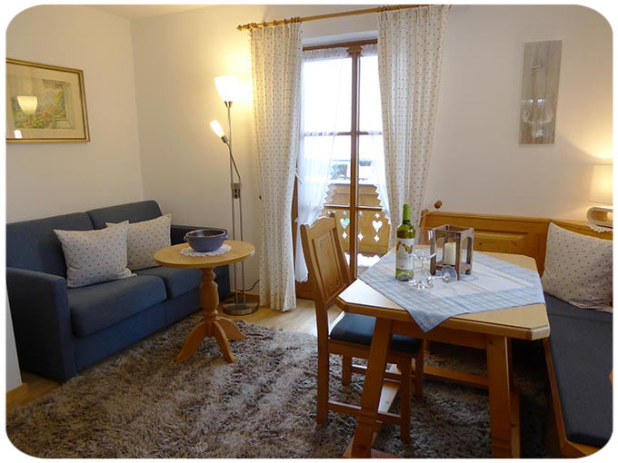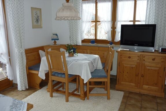 Unsere liebevoll eingerichtete Ferienwohnung „Enzian“ befindet sich in der 1. Etage und verfügt über 2 Balkone mit traumhaftem Bergblick. Der gemütliche Wohnbereich mit Kabel-TV hat u.a. eine gemütliche Essecke und eine neue Küchenzeile mit Geschirrspüler, Kühlschrank mit Gefrierfach usw., 1 separates Schlafzimmer mit Bandscheibenmatratzen, neues Bad mit ebenerdiger Dusche, Waschbecken und WC.Ausgestattet ist die Wohnung mit Bettwäsche, Handtücher, Geschirr, Kaffeemaschine, Mikrowelle, Wasser- und Eierkocher, Toaster, Bio-Teestation, Fön, Seifen- und Duschgelspender, Toilettenpapier, Kosmetiktücher.Autostellplatz.