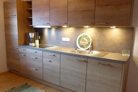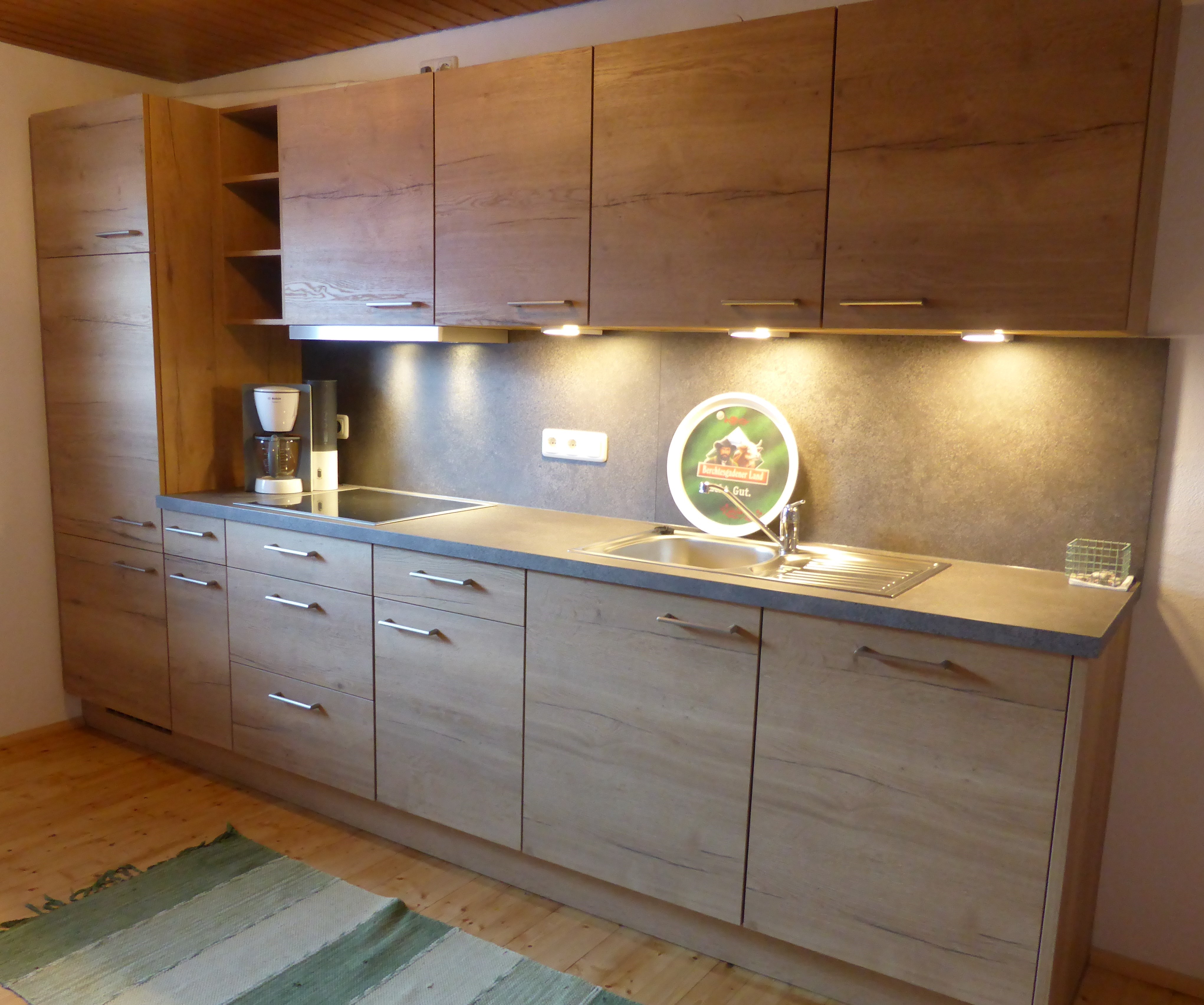 Die großzügige Küchenzeile ist mit einem Kochfeld, Kühlschrank mit Gefrierfach, Spülmaschine, Kaffeemaschine, Wasserkocher und Toaster ausgestattet.