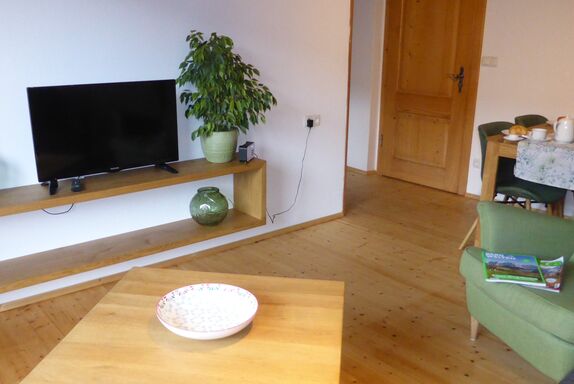 Das gemütlichen Wohnzimmer verfügt über eine Essgruppe, ein Schlafsofa, Sat-TV und bietet ebenfalls einen direkten Zugang zum Balkon.