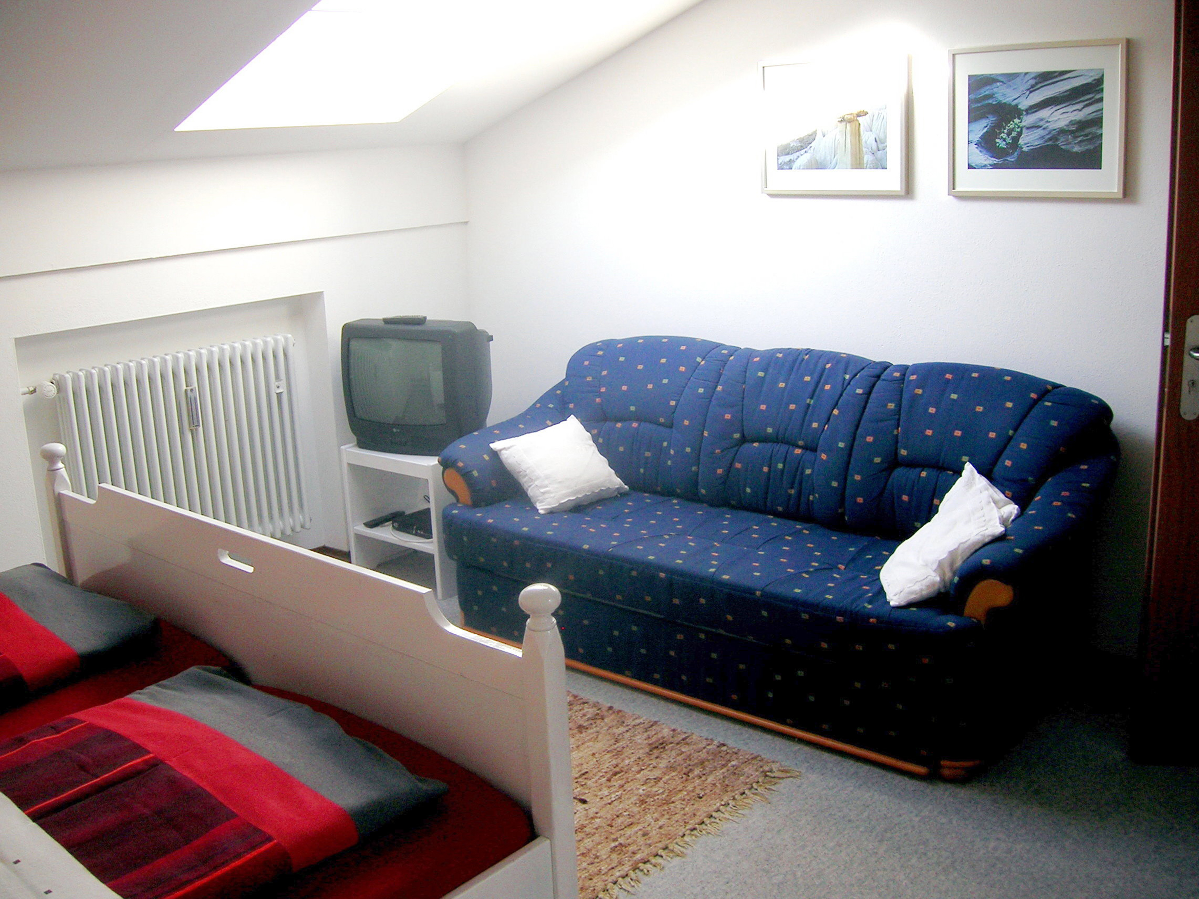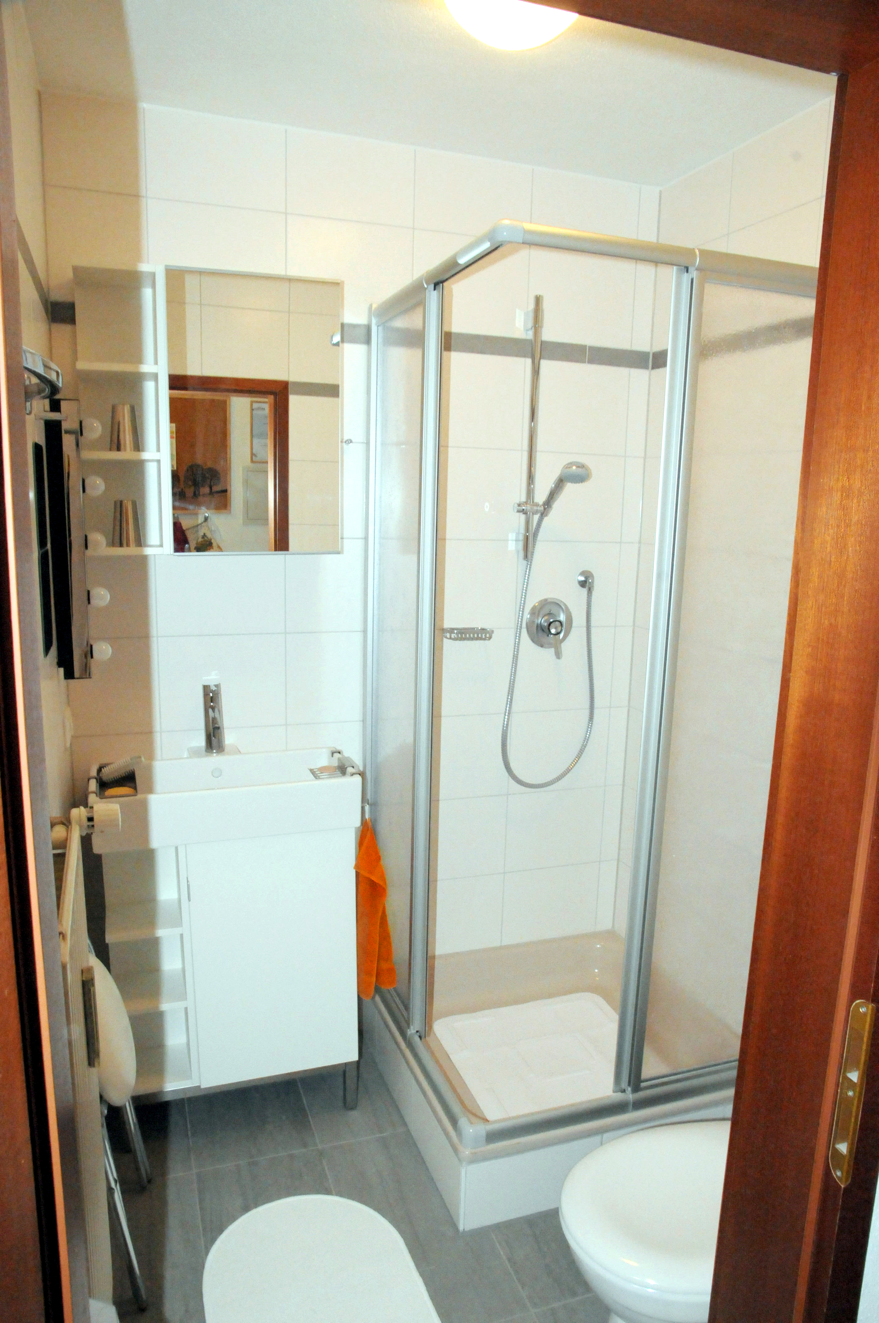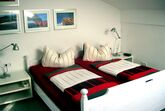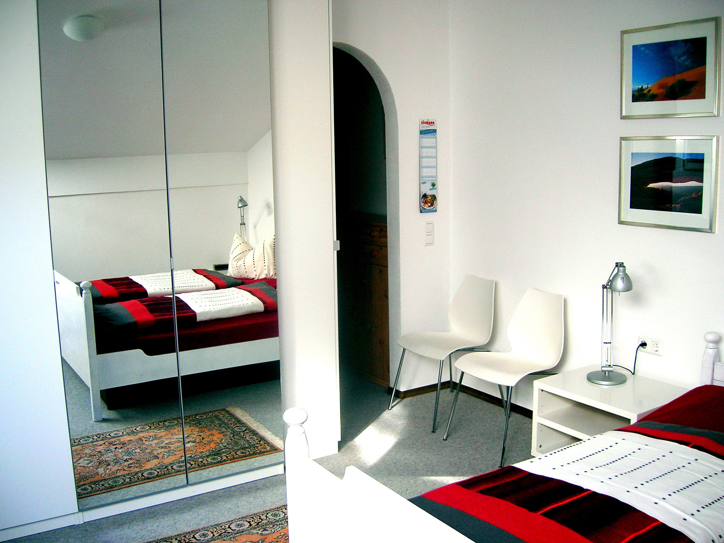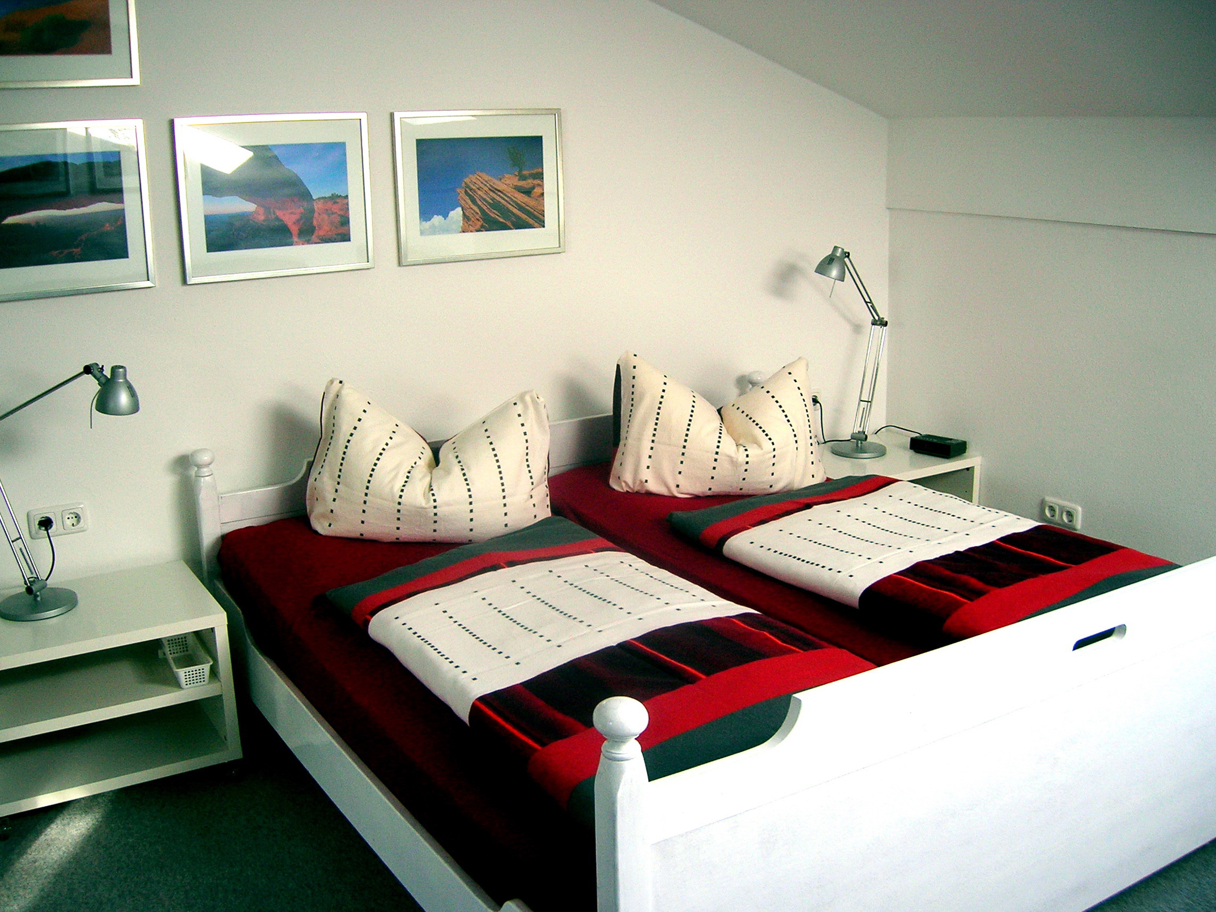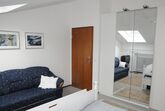 Helle Nichtraucher Maisonette-Ferienwohnung 56 qm im 1. Obergeschoss mit Balkon. Die moderne Einrichtung mit weißen Möbeln verleiht der Wohnung ein elegantes und zugleich gemütliches Flair. Wohnbereich mit ausziehbarer Schlafcouch für eine Person (1,40 m breit), Telefon, kostenloses WLAN, SAT-TV, Essecke, Küchenzeile mit Mikrowelle. Badezimmer mit Dusche/WC. Schlafzimmer in der zweiten Ebene mit Doppelbett, einem Einzelbett und einem Babybett/Kindergitterbett für Kleinkinder bis 2 Jahre, SAT-TV und zusätzlichem Badezimmer mit Dusche/WC. Bettwäsche und Handtücher vorhanden. Haustiere und ein Hund dürfen gegen Aufpreis mitgebracht werden.