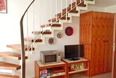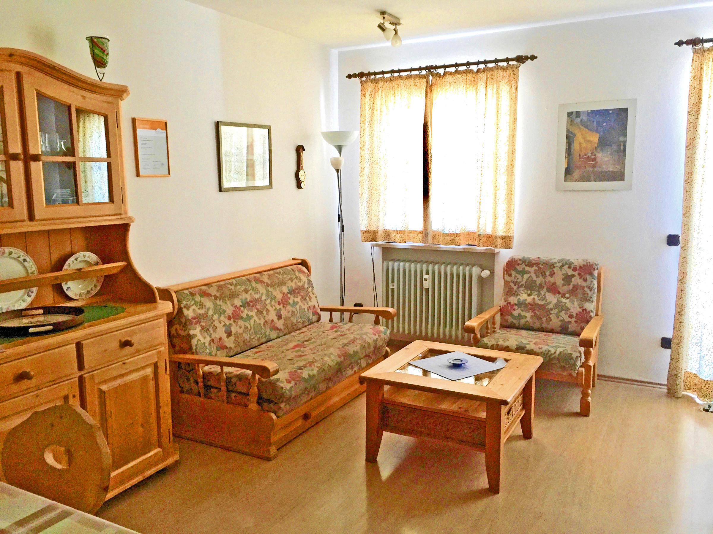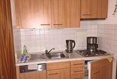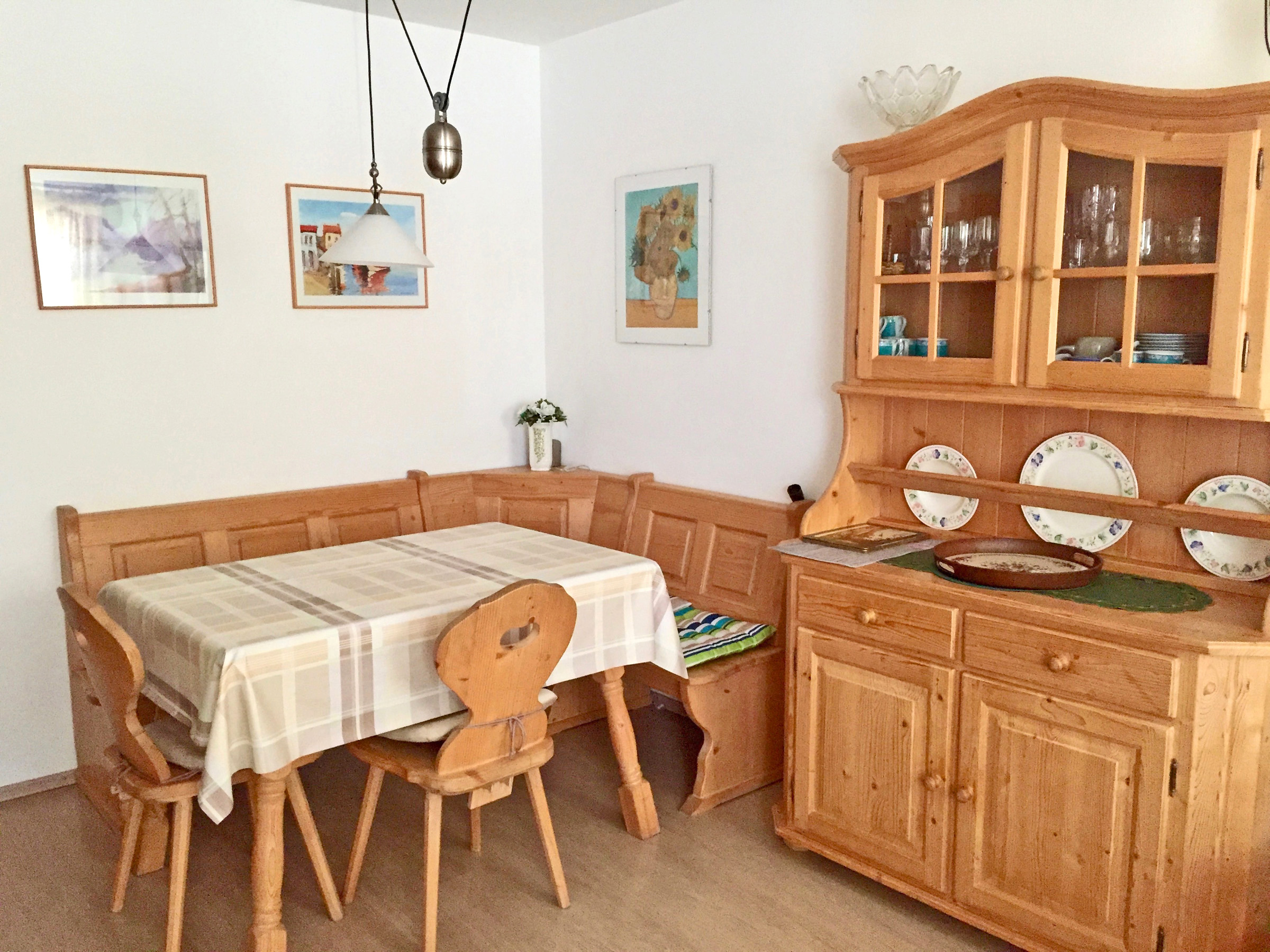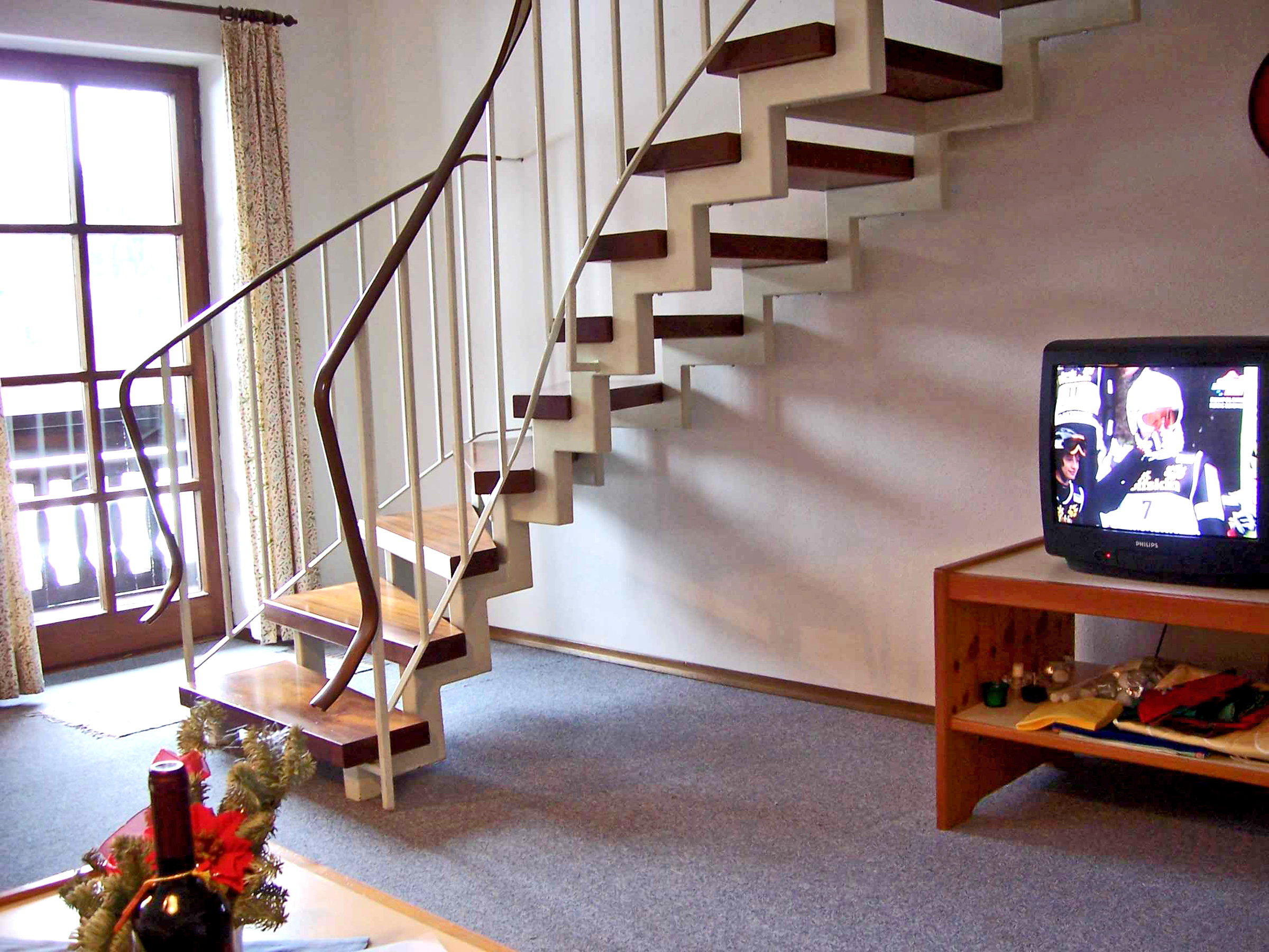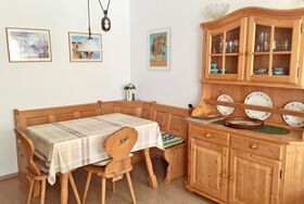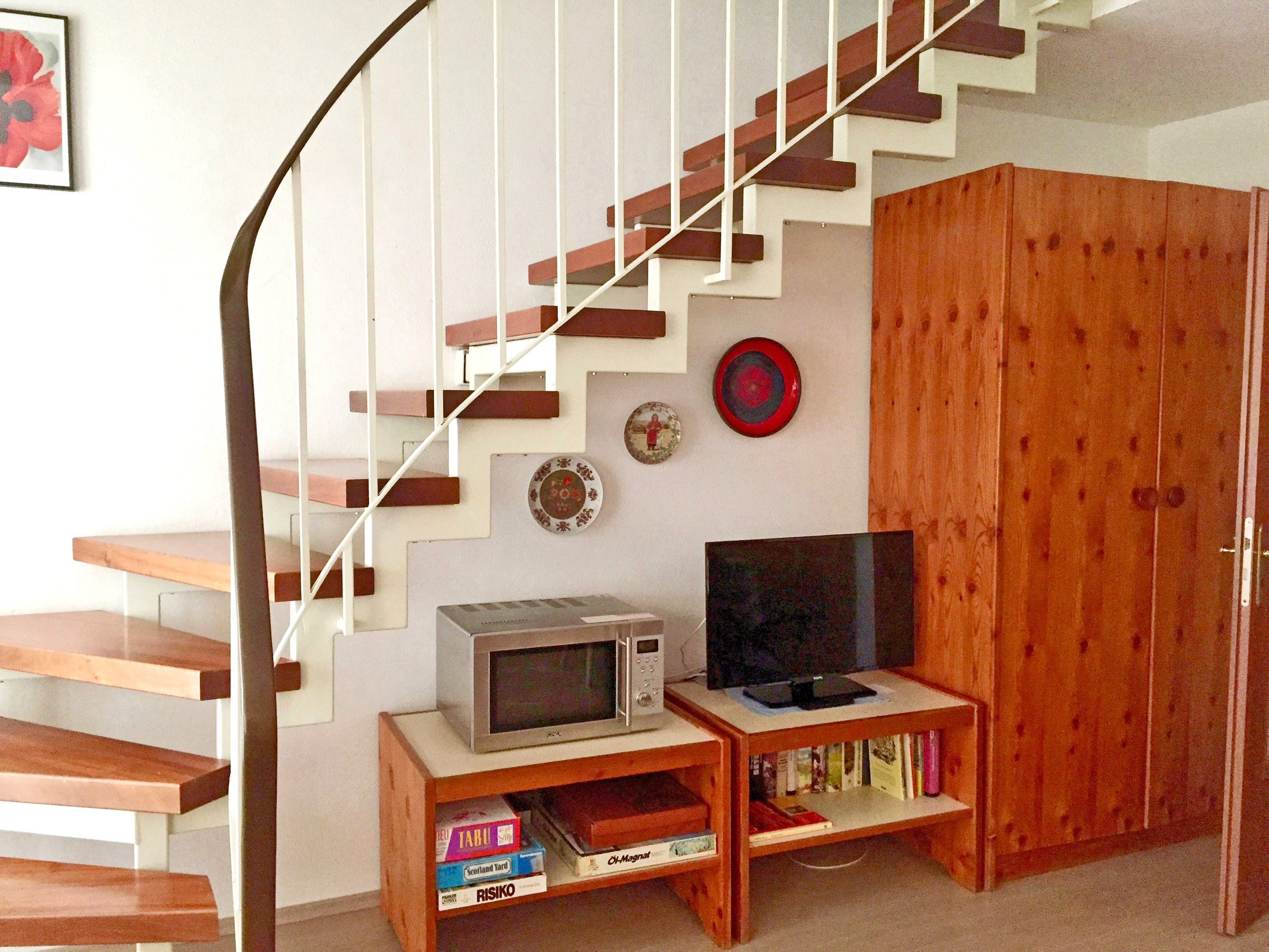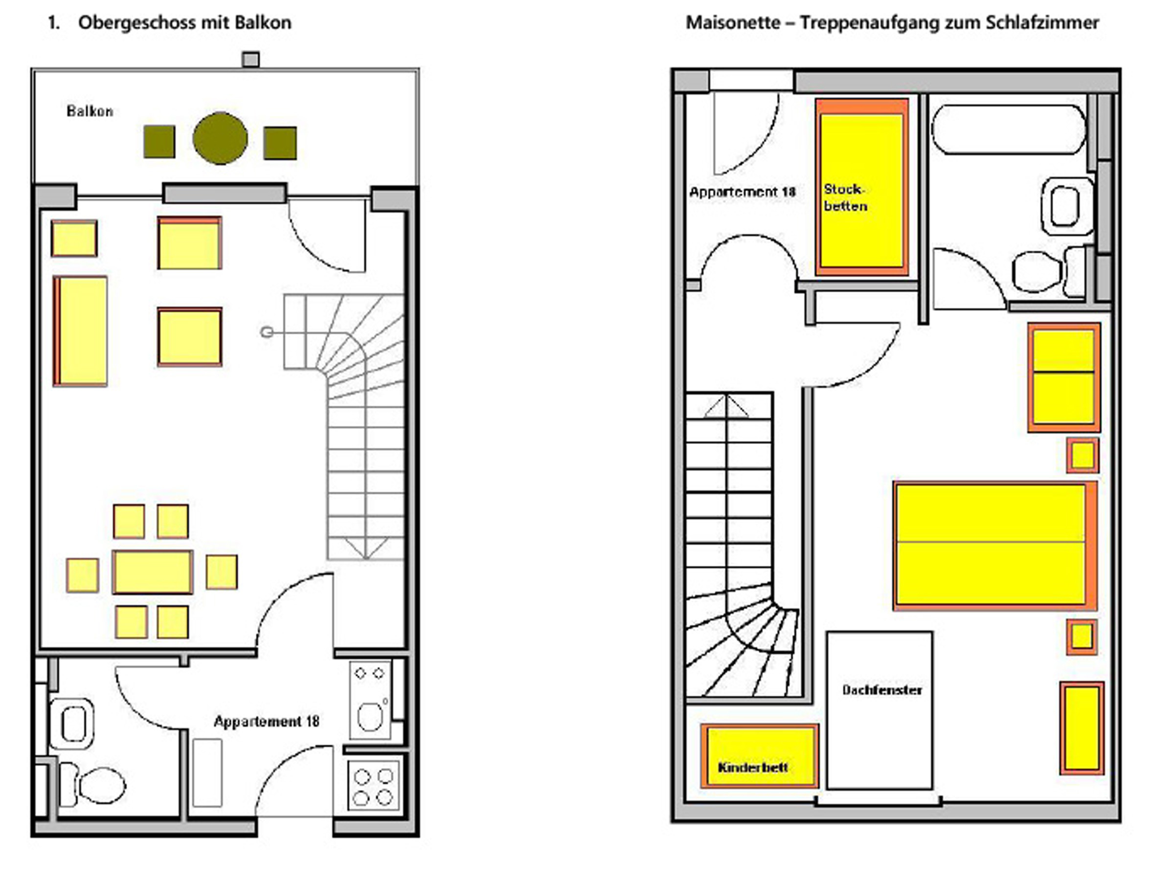 Helle Nichtraucher Maisonette-Ferienwohnung 56 qm im 1. Obergeschoss mit Balkon für 2 - 6 Personen. Sie wohnen, verbunden durch eine Treppe in der Wohnung, auf zwei Ebenen: unten Wohn-/Schlafraum und oben zwei Schlafzimmer mit Doppelbett und einmal mit Stockbett. Wohnbereich mit ausziehbarer Schlafcouch für 2 Personen, Telefon, kostenloses WLAN, Flat-SAT-TV, Essecke, Küchenzeile mit Mikrowelle. Schlafzimmer in der zweiten Ebene mit Doppelbett und Kleinkinderbett, ein separates Schlafzimmer mit Hochbett/Stockbett. Badezimmer mit Dusch-/Badewanne und WC, zusätzliches WC in der Wohnung. Ein Hund darf gegen Aufpreis gerne mitgebracht werden.