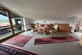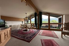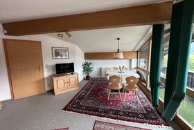 Wunderschöne Zwei-Raum-Wohnung mit 67 m² und extra Küche und Schlafzimmer. Großes Panoramafenster mit herrlichem Bergblick. Bad mit Dusche, Badewanne und WC. Gemütlich eingerichtetes Wohnzimmer.