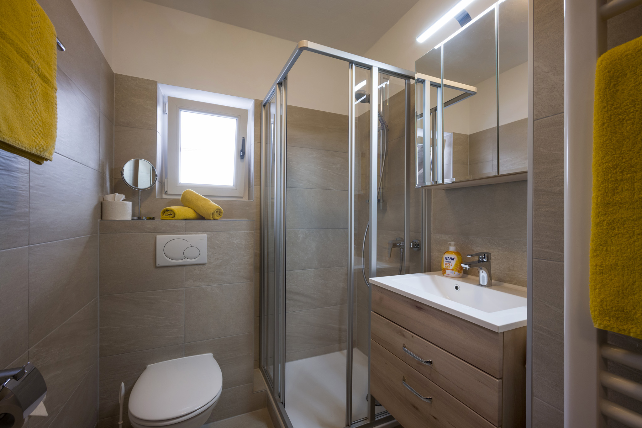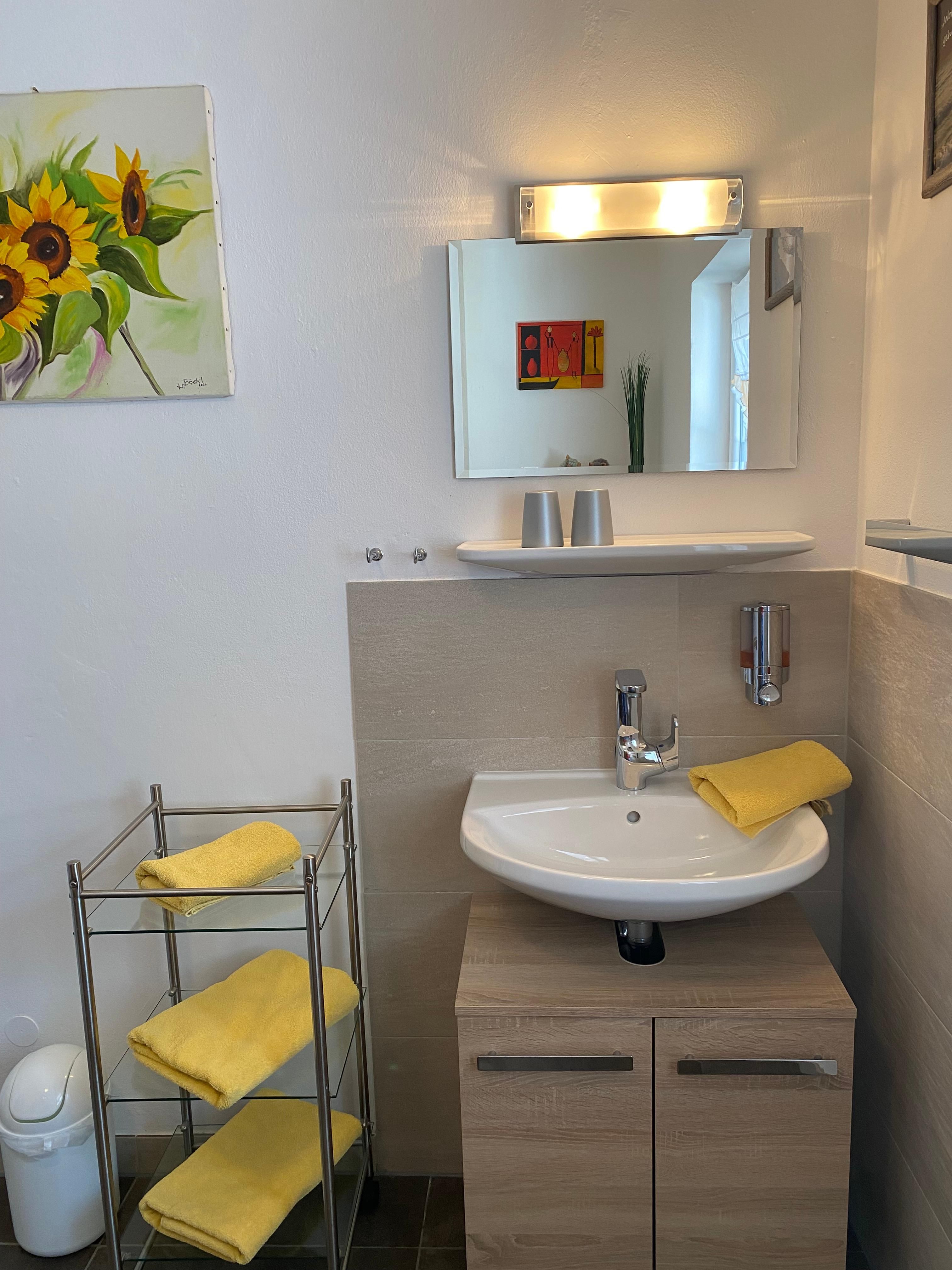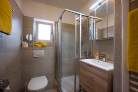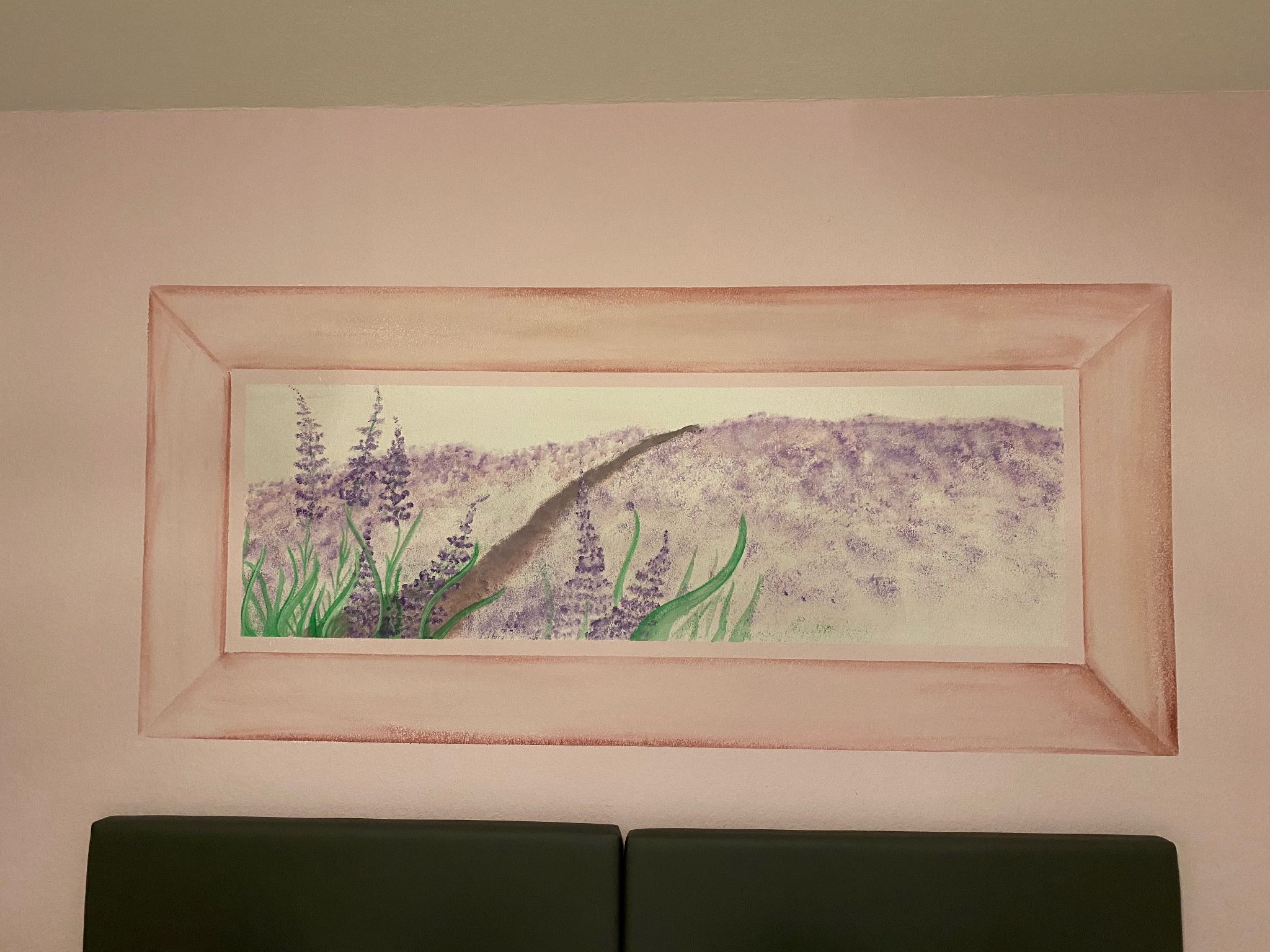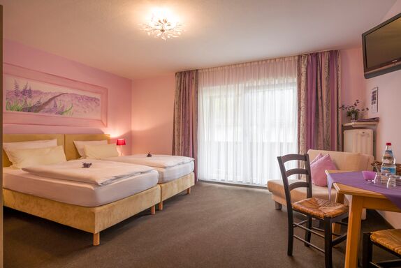 Das Dreibettzimmer Lavendel verfügt über ein Boxspringbett mit 200/210 und einen Schlafsessel 90/200 zum Ausziehen für die 3. Person. Das renovierte Bad/WC befindet sich gegenüber vom Zimmer und ist zur alleinigen Benutzung. Zum Verweilen steht Ihnen ein Balkon mit dem Blick in die Berge zur Verfügung. Das Zimmer ist mit Flachbildschirm und WLAN ausgestattet. Ein Gästekühlschrank gefühlt mit alkoholische und nicht alkoholische Getränke steht für Sie bereit.