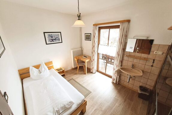 Wer alleine reist, kann sich in unserem Einzelzimmer 2 von den Eindrücken des Tages erholen und abends noch den wunderschönen Blick auf die Gebirgsmassive Berchtesgadens genießen. Den direkten Blick kann man vom Südostbalkon aus auf den Kehlstein, den Jenner sowie auch auf den berühmten Watzmann richten..